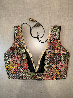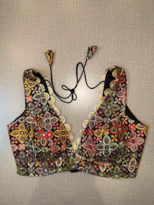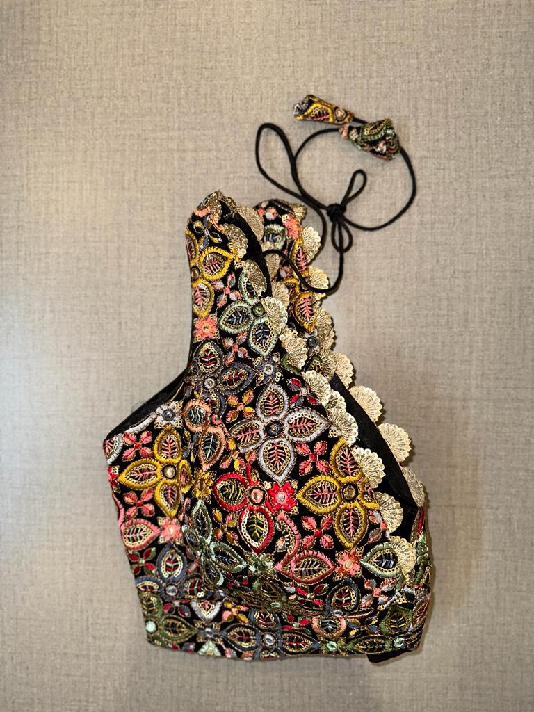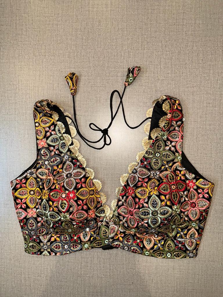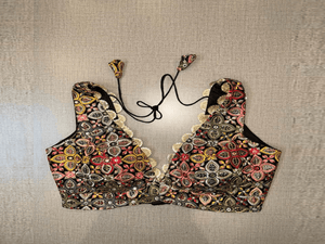 Classic is never old and enough to have in your closet!! This blouse compliments a beautiful multicolor floral embroidery, mirror work, sleeveless, V neck, hooks closure & tie-up at the back. Pair this fashionable black blouse with beautiful statement earrings and you are good to go! Buy this designer blouse in the USA from Pure Elegance.