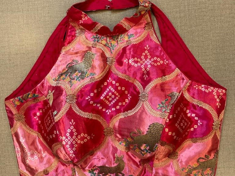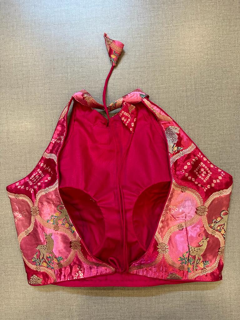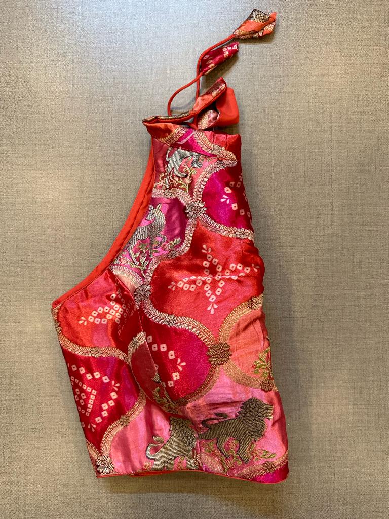This blouse is a rich add-on to glam up your look. The blouse features bhandej print and high neck embroidery, a sleeveless blouse, and a tie-up closure at back. Team this blouse with a lovely solid saree to look gorgeous and create a stunning and beautiful look. Buy this designer blouse in the USA from Pure Elegance.