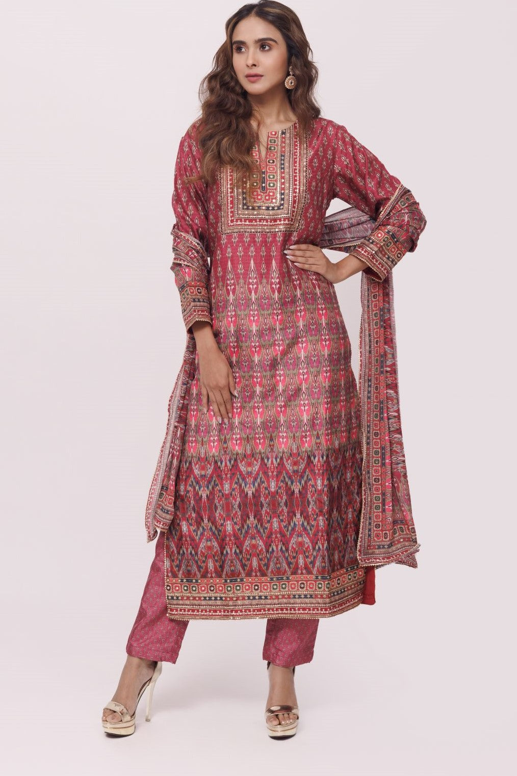 Simple yet elegant burnt umber printed crepe pant suit with dupatta. The suit is adorned with tikki and zari work. Shop online from Pure Elegance.