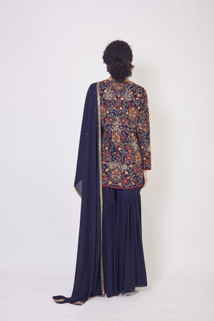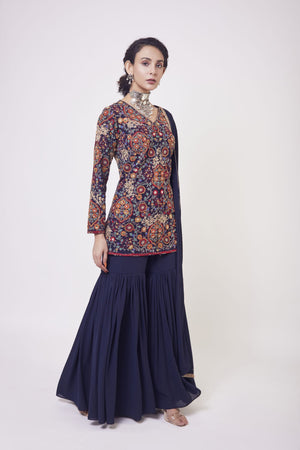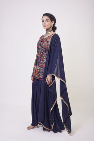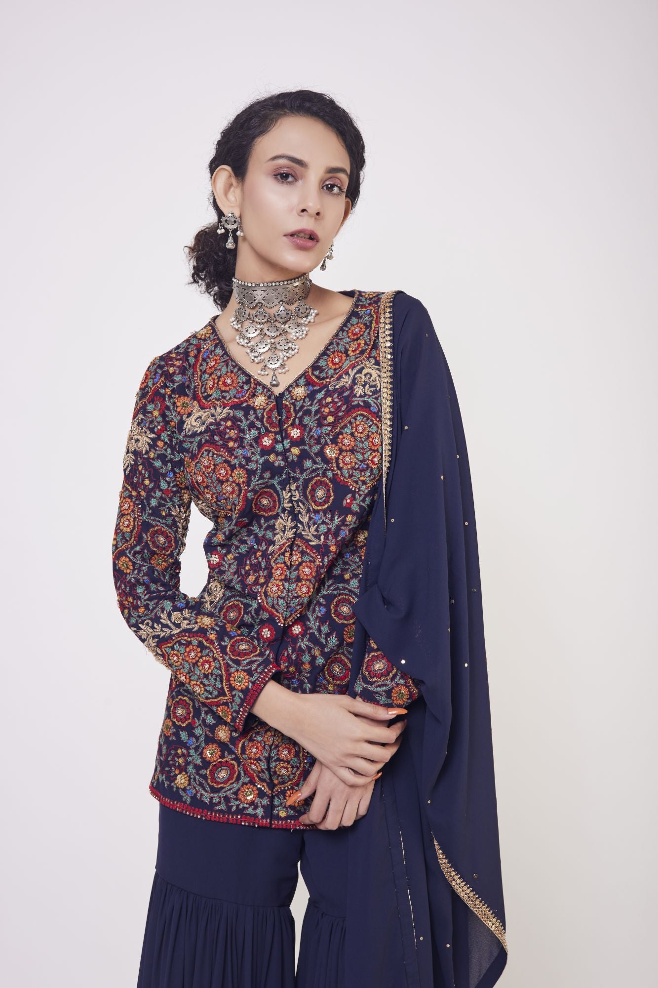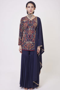 Look your best on festive occasions in this stunning royal blue resham and zardozi work georgette gharara suit. The suit comes with a matching dupatta. Shop online from Pure Elegance.
