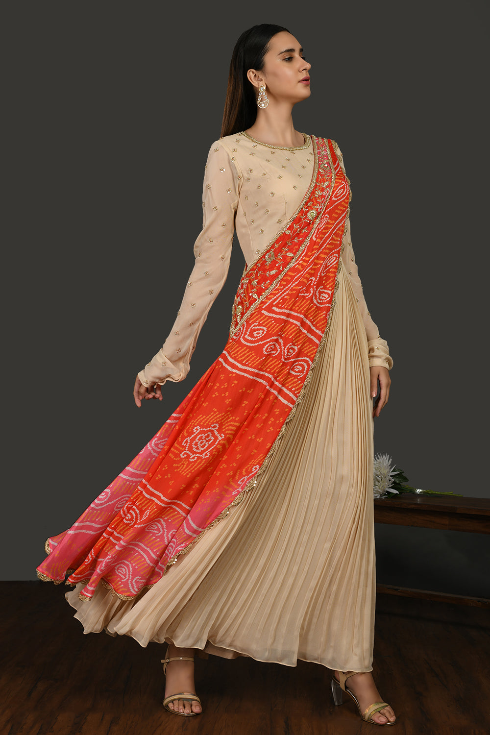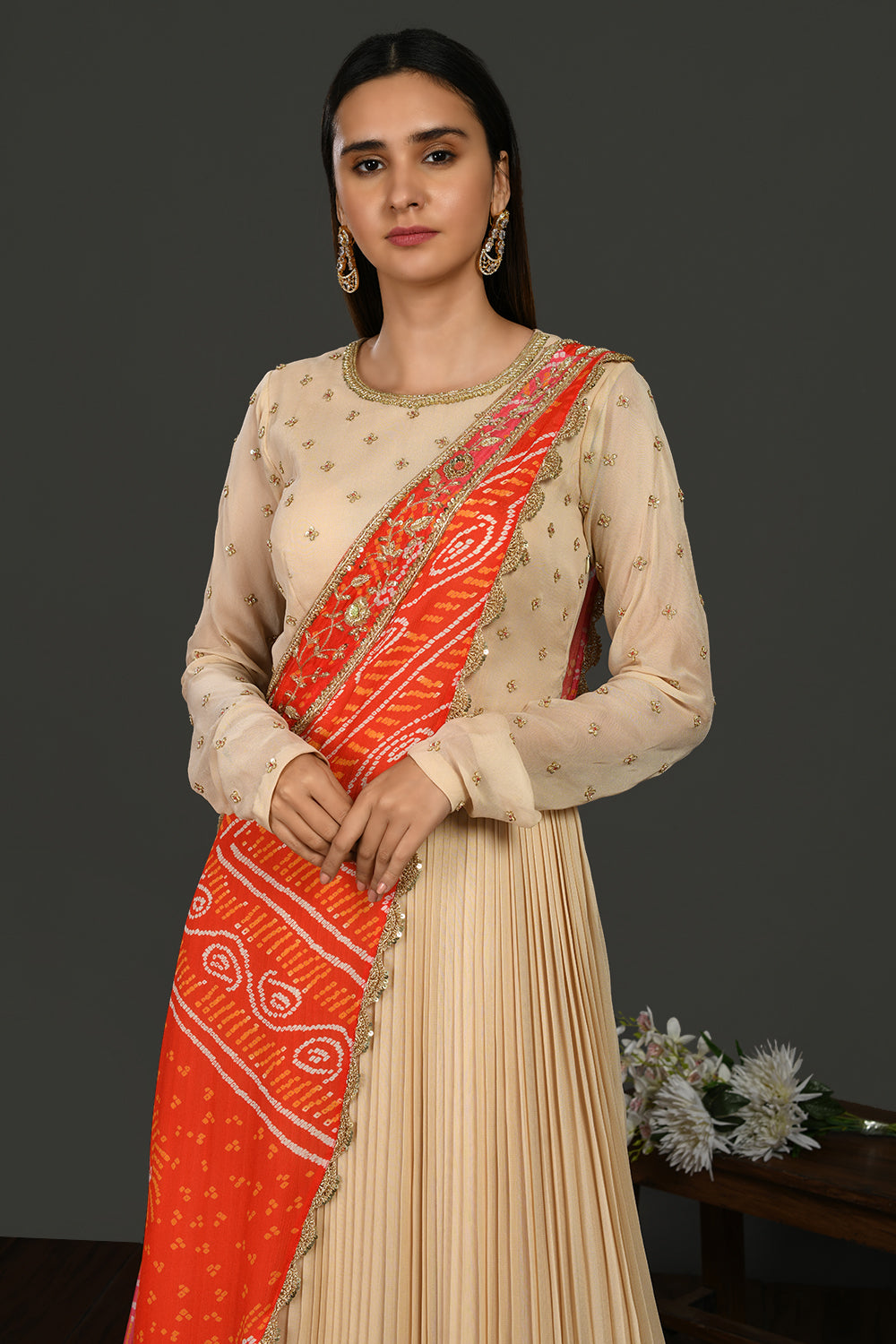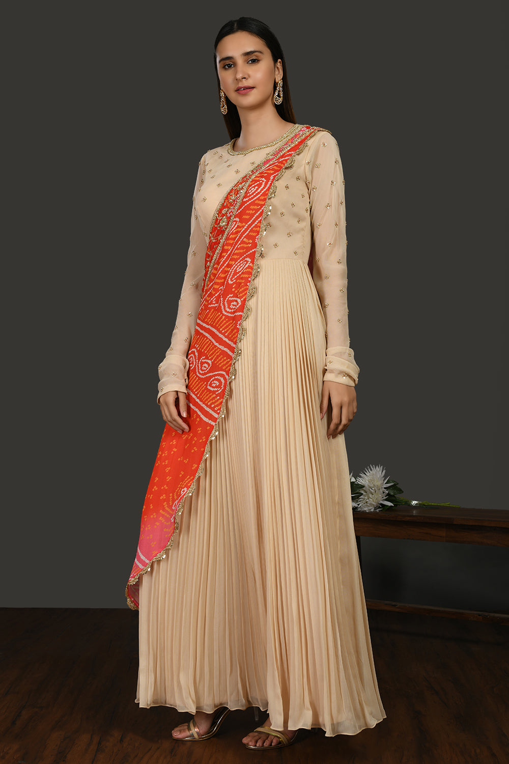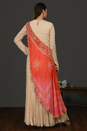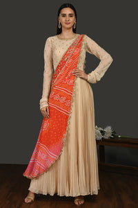 Look your best on festive occasions in this beautiful beige embroidered georgette Anarkali suit. It comes with a red and pink bandhej chiffon dupatta. Shop online from Pure Elegance.