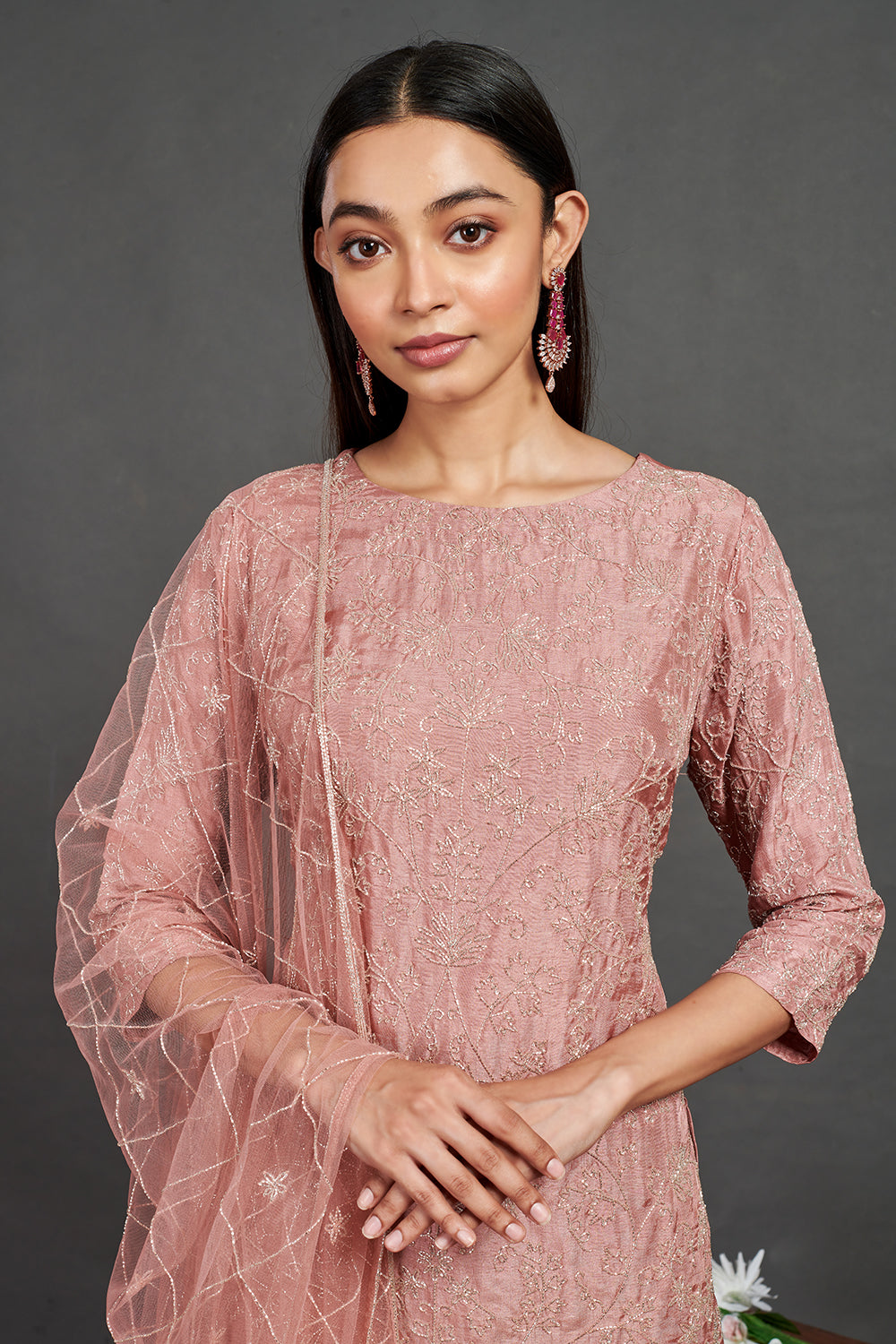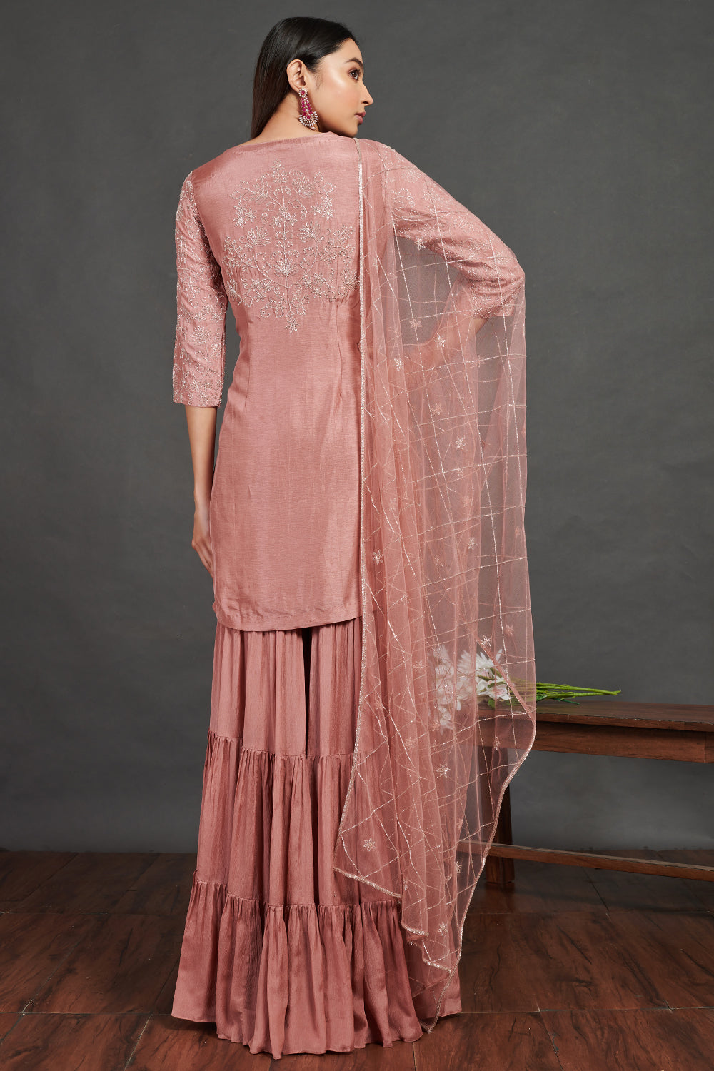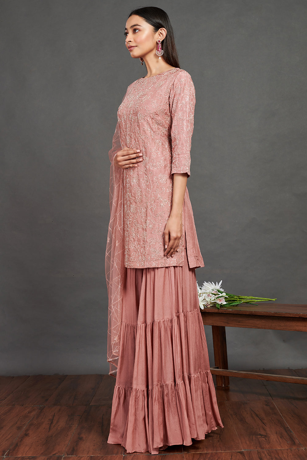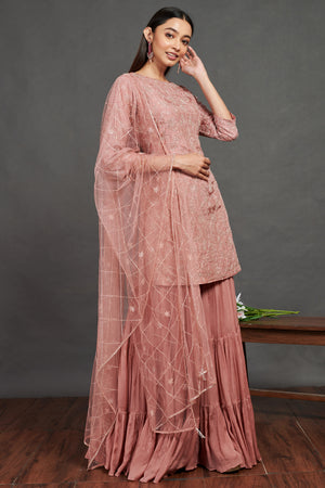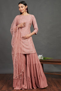 Look your best on festive occasions in this beautiful pink embroidered sharara suit. It comes with a matching dupatta. Shop online from Pure Elegance.