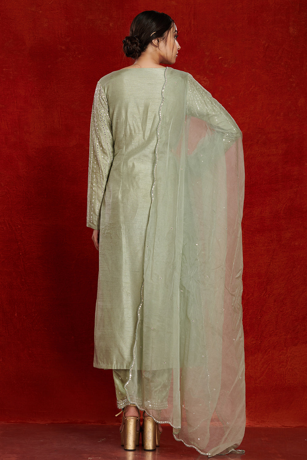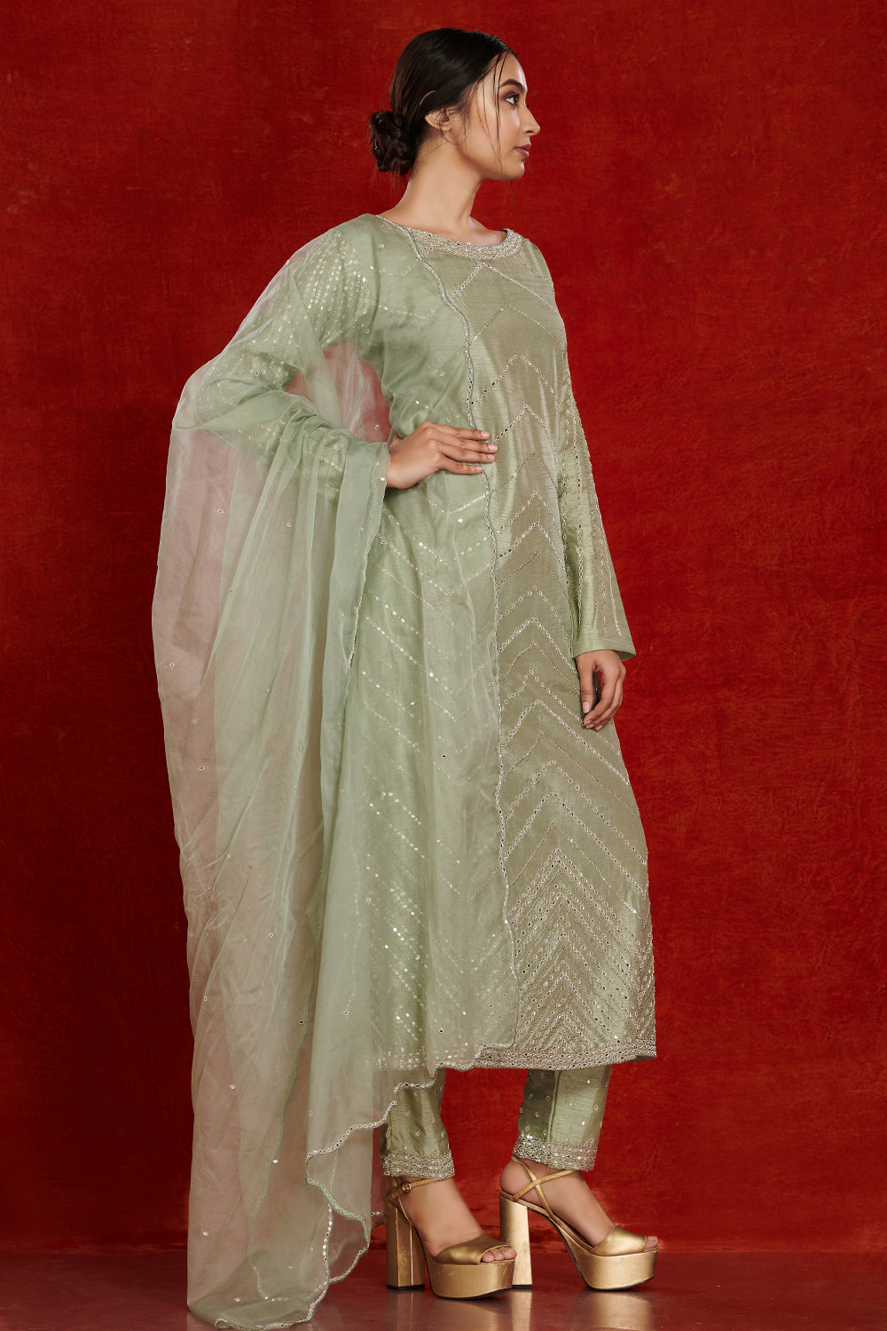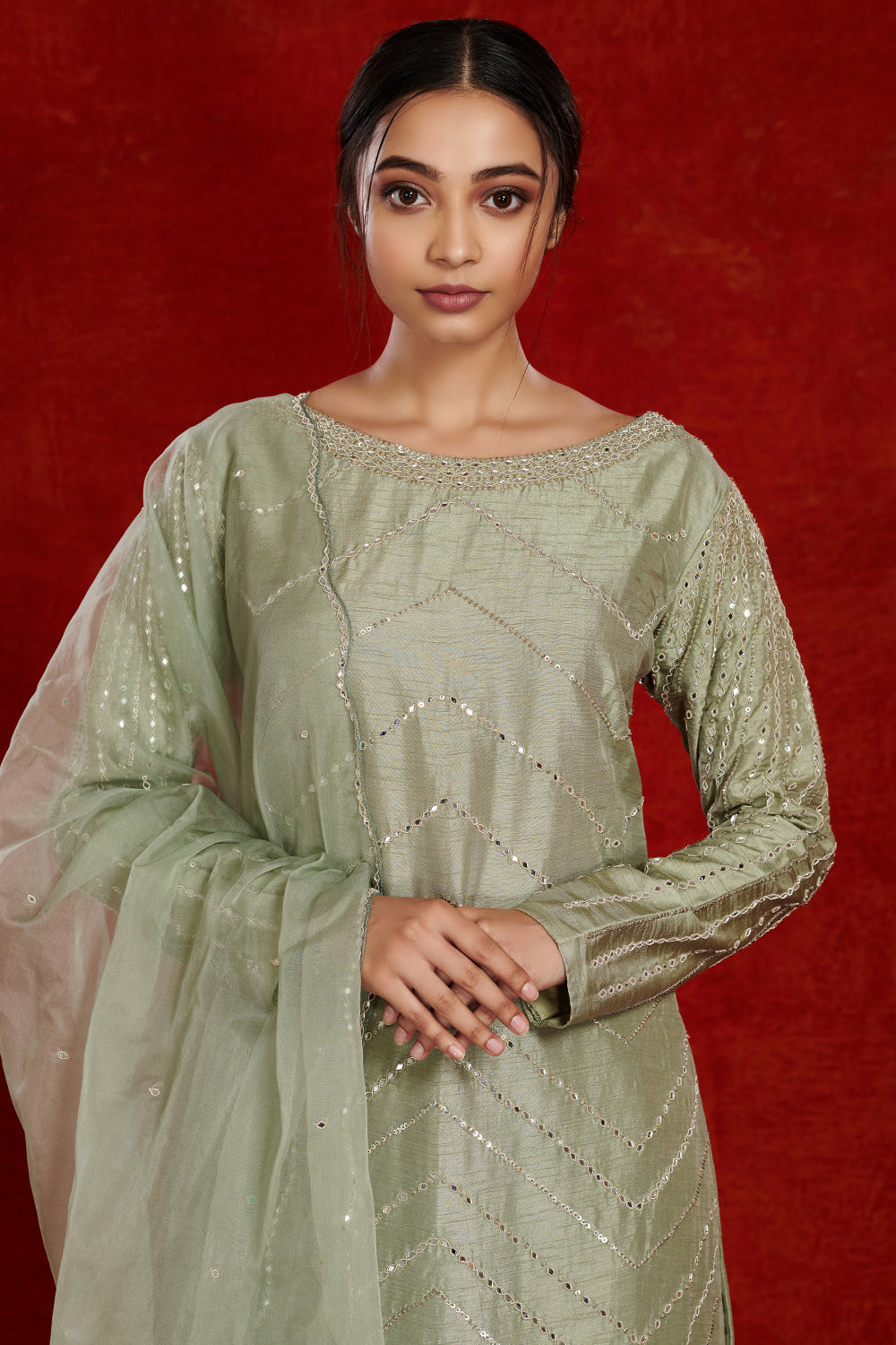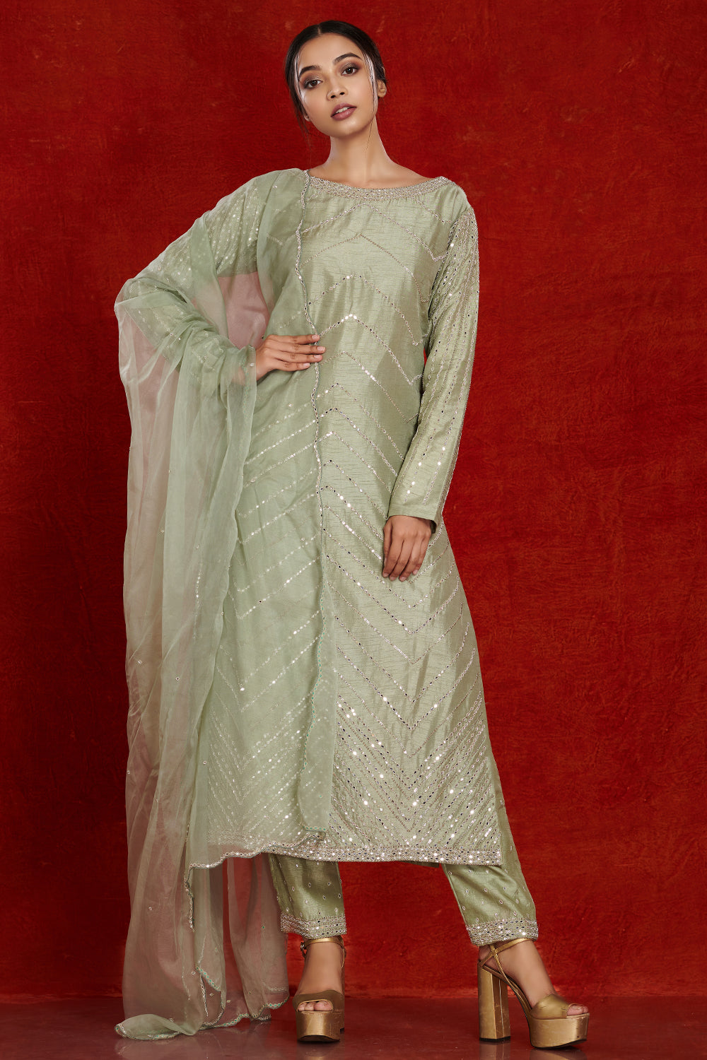 Look your best on festive occasions in this gorgeous sage green embellished silk kurta with pants. It comes with an organza dupatta. Shop online from Pure Elegance.