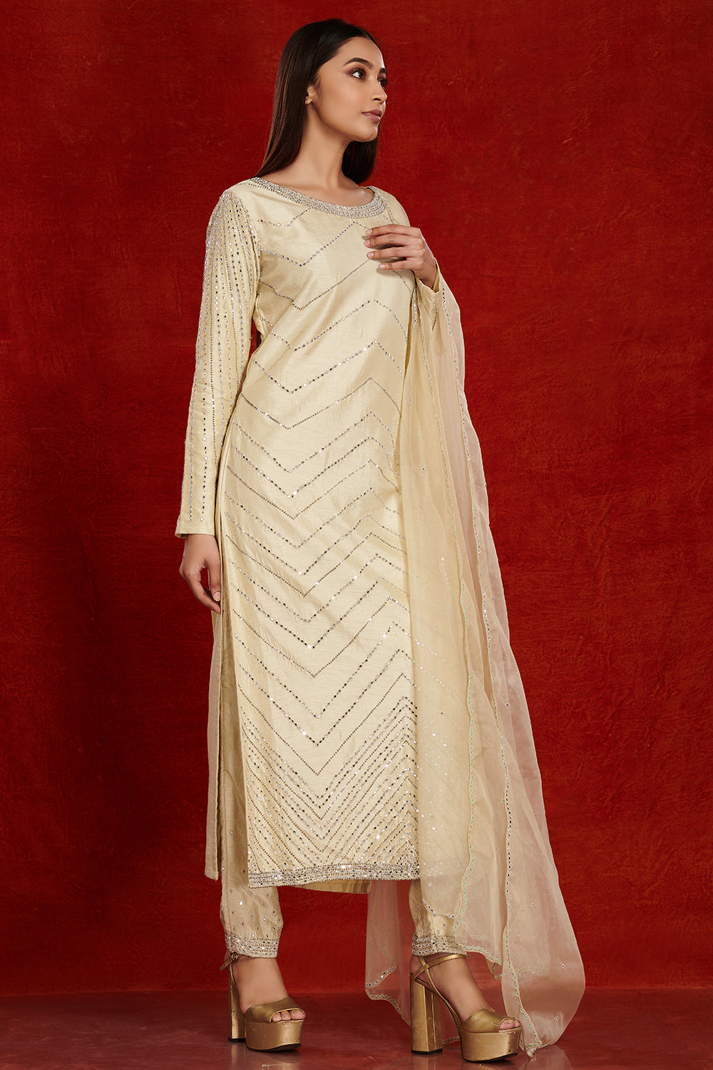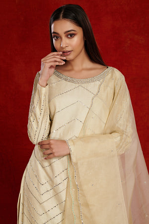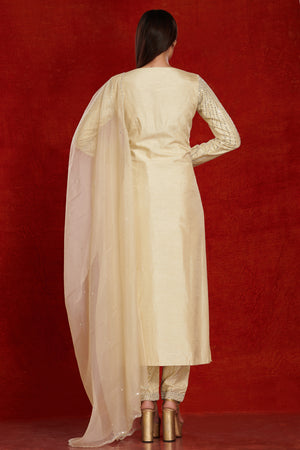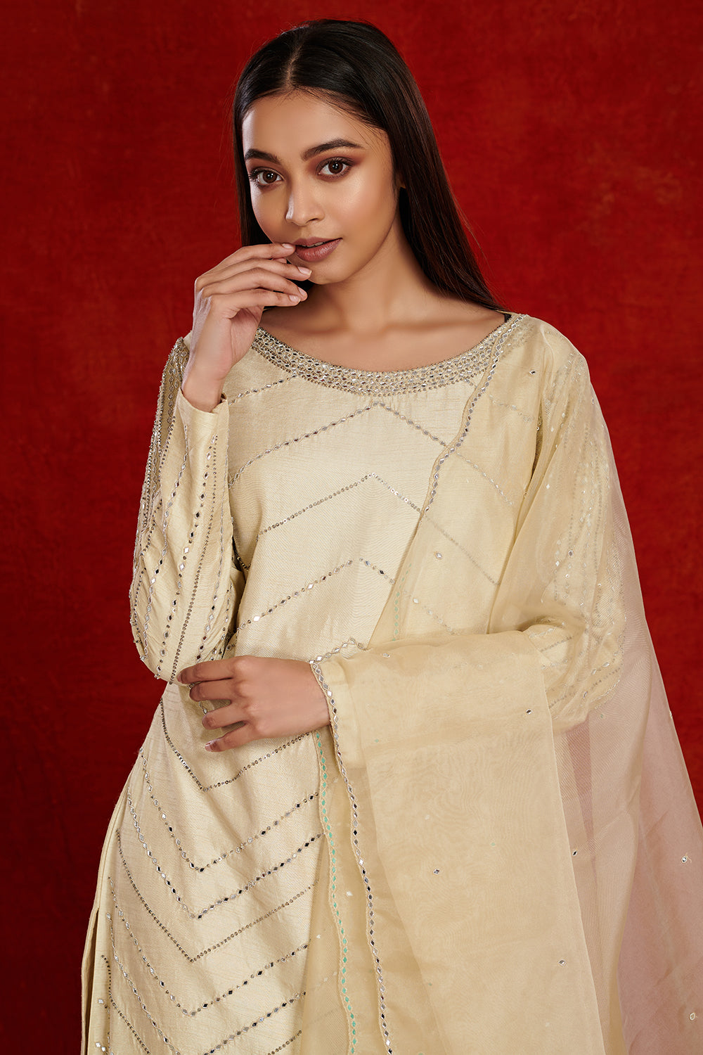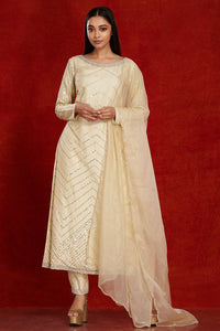 Look your best on festive occasions in this elegant cream embellished Mysore silk suit. It comes with an organza dupatta. Shop online from Pure Elegance.