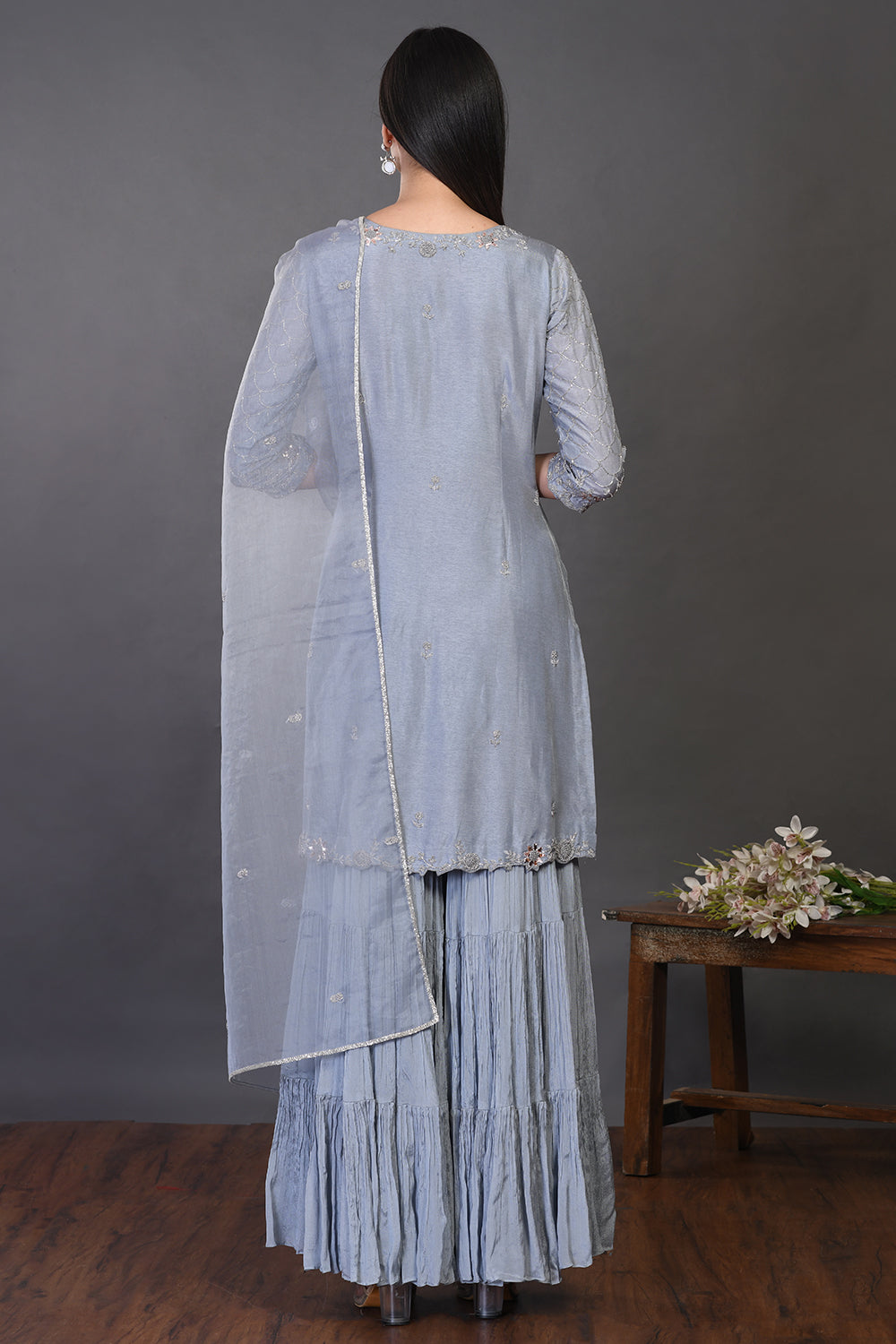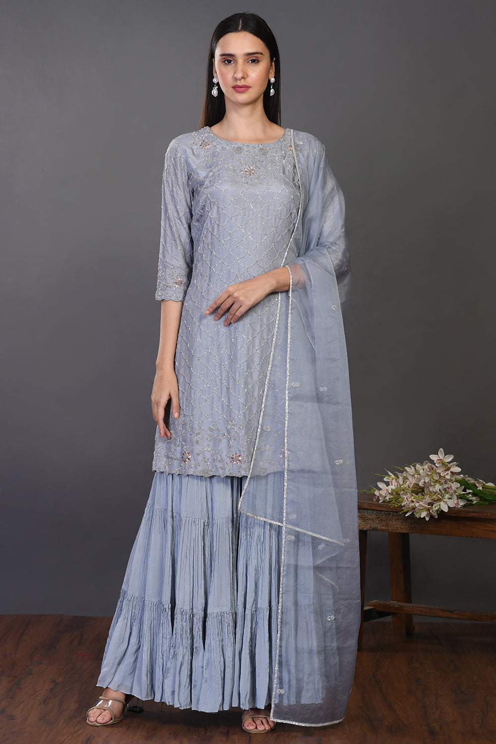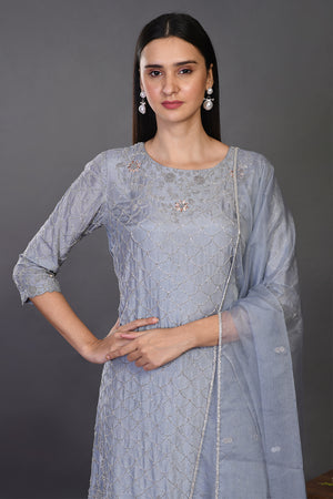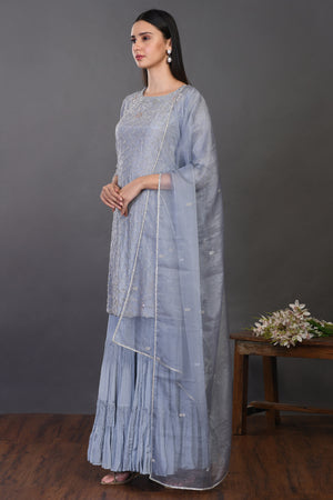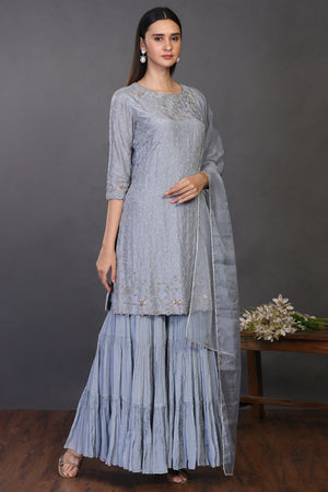 Look your best on festive occasions in this elegant doctor blue embroidered silk sharara suit. It comes with a matching dupatta. Shop online from Pure Elegance.