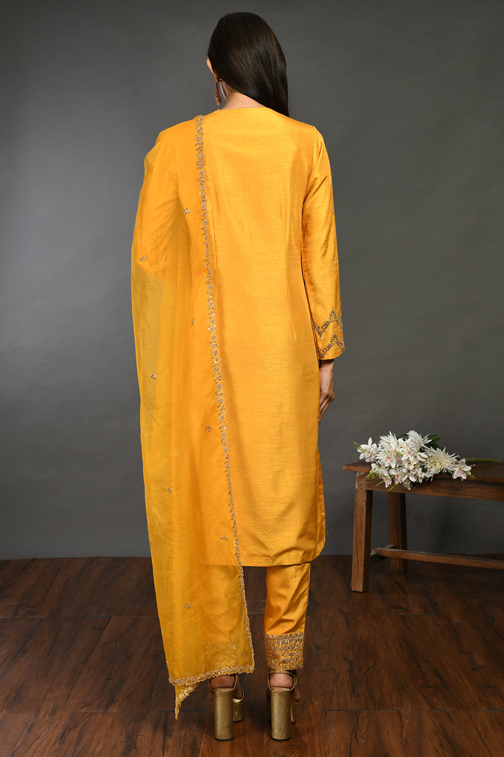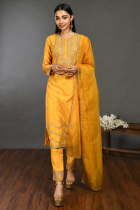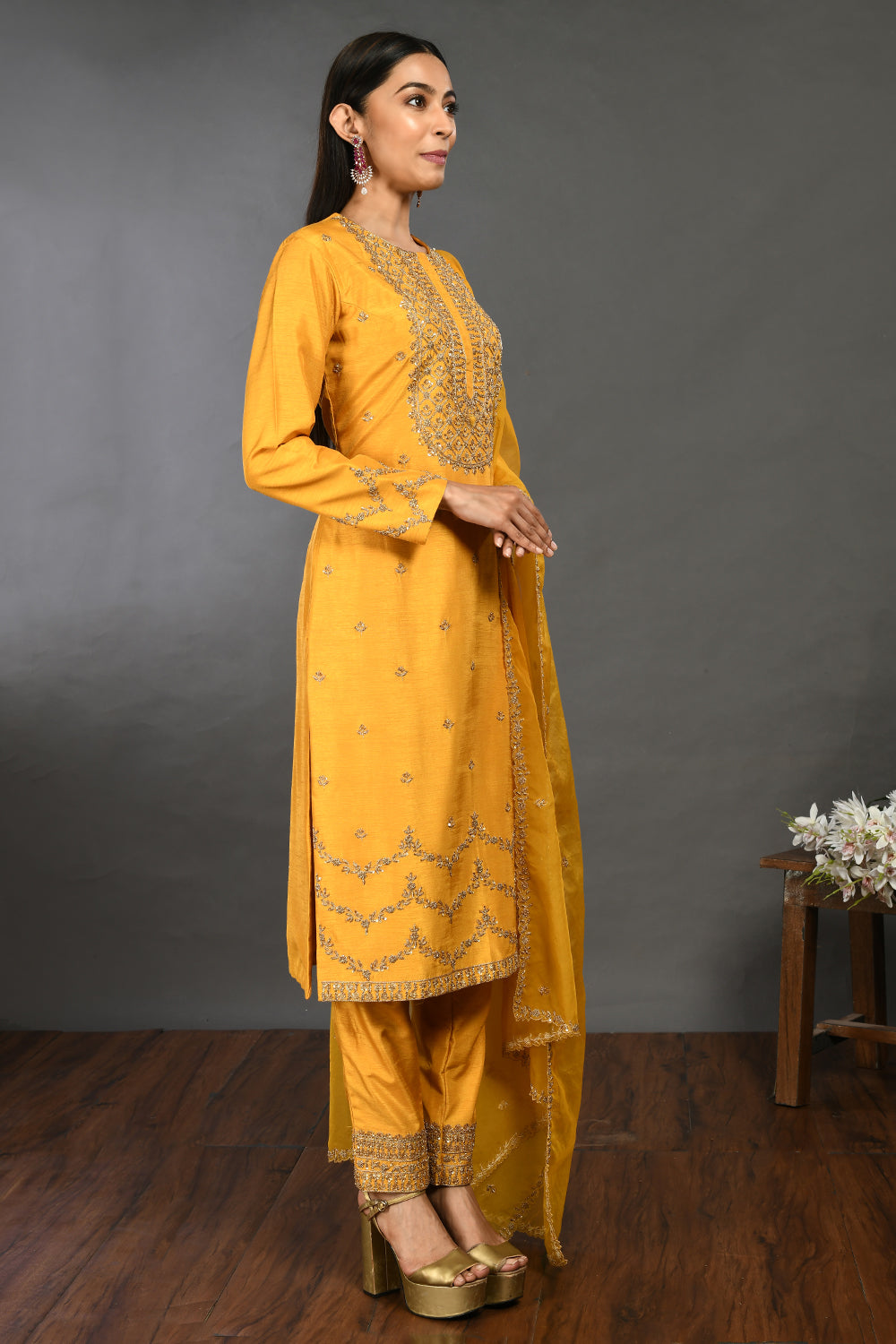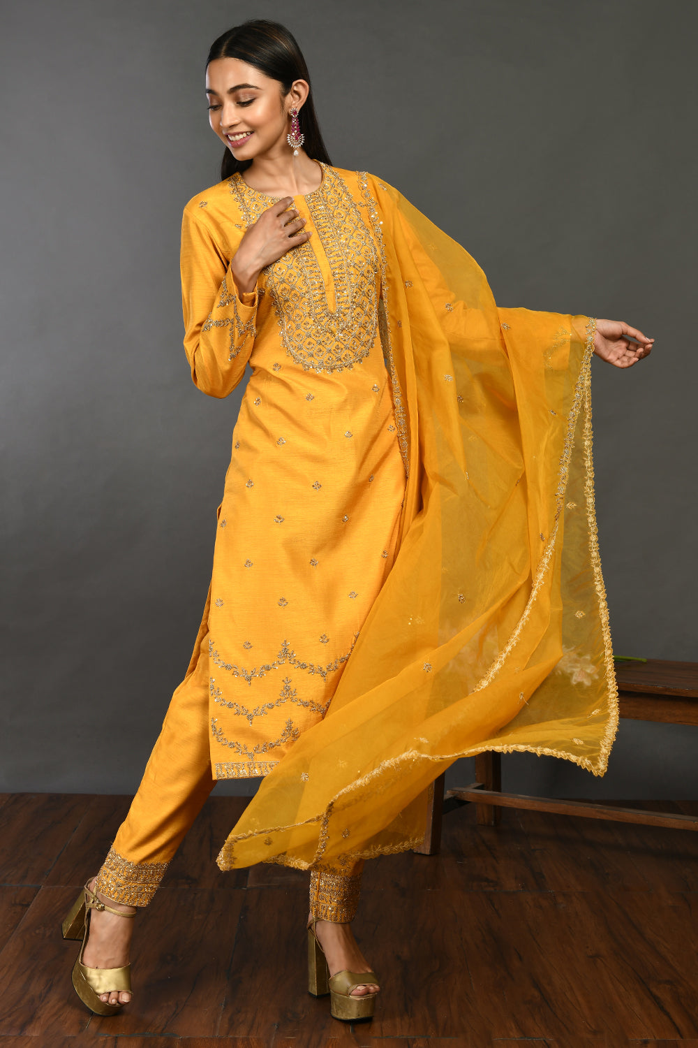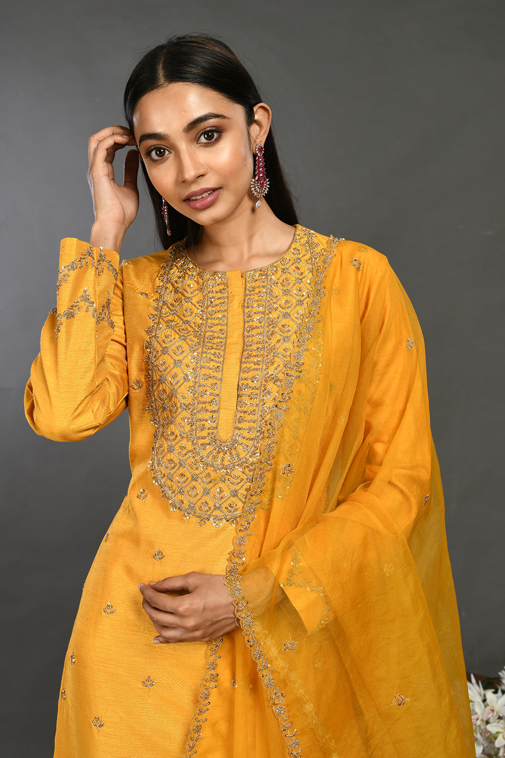 Look your best on festive occasions in this beautiful yellow zardozi work Mysore silk suit. It comes with a matching dupatta. Shop online from Pure Elegance.