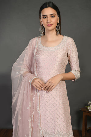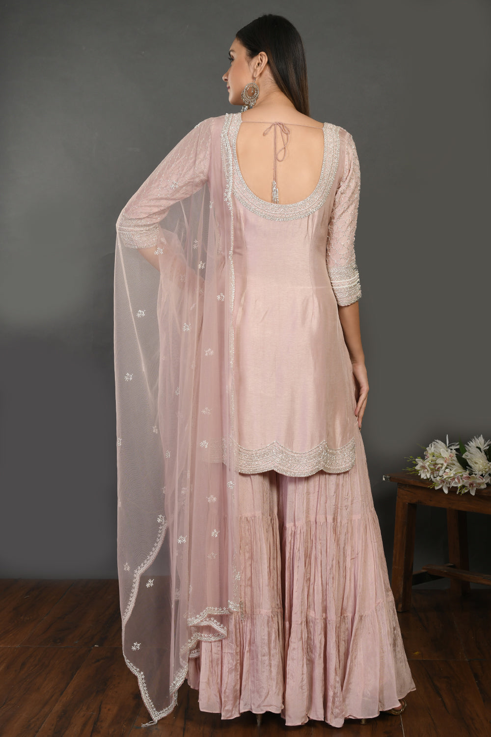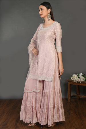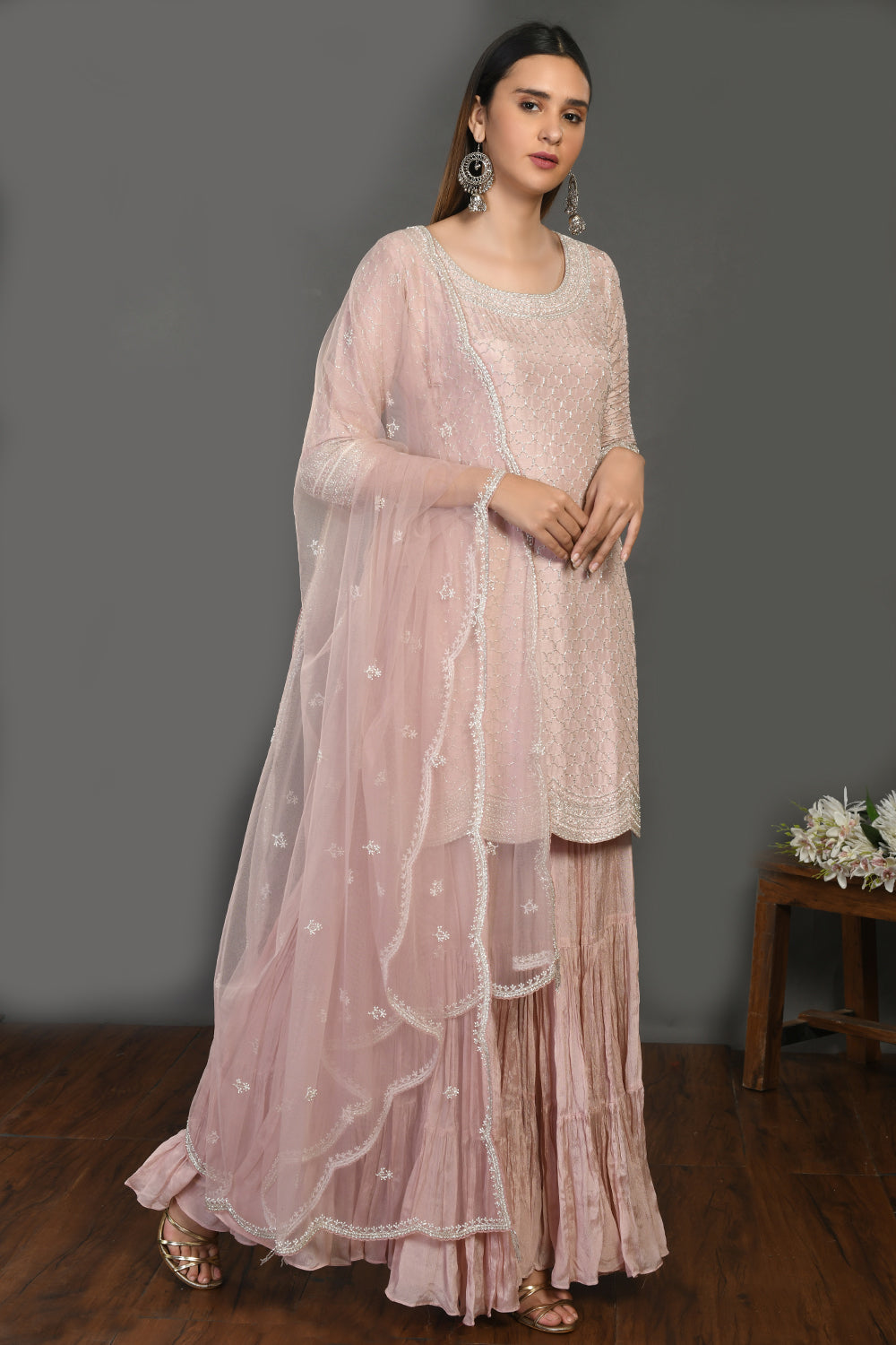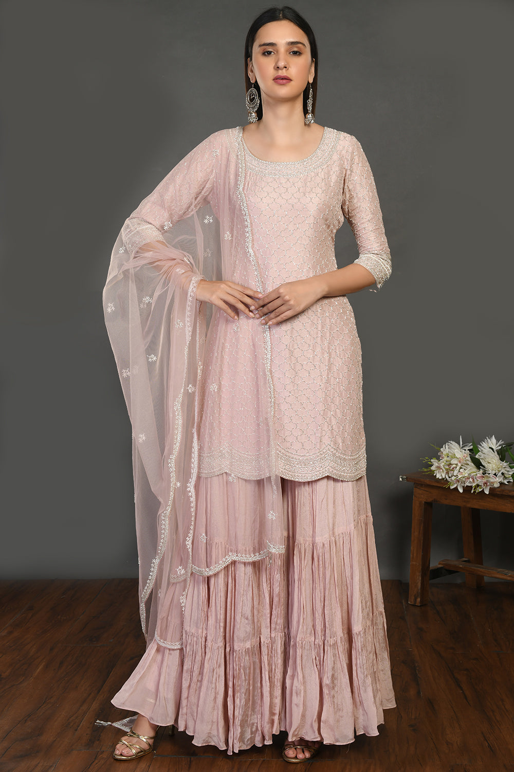 Look your best on festive occasions in this beautiful powder pink cutdana and pearl work sharara suit. It comes with a matching dupatta. Shop online from Pure Elegance.