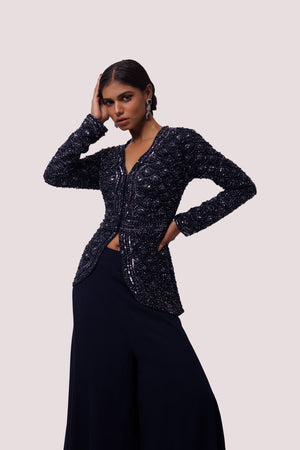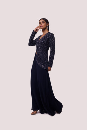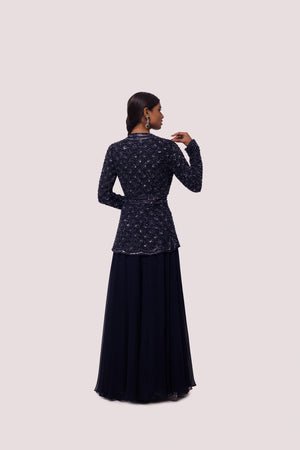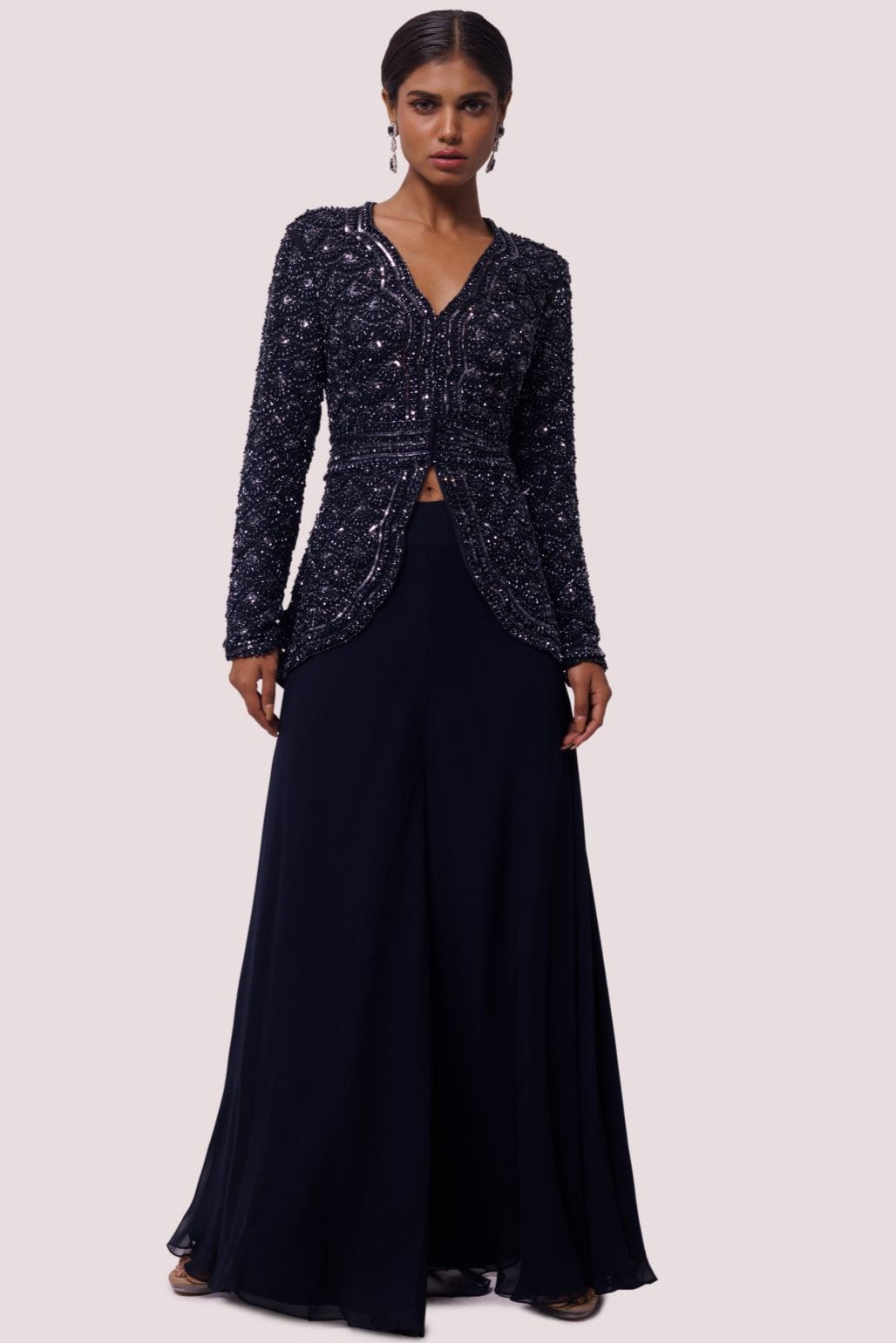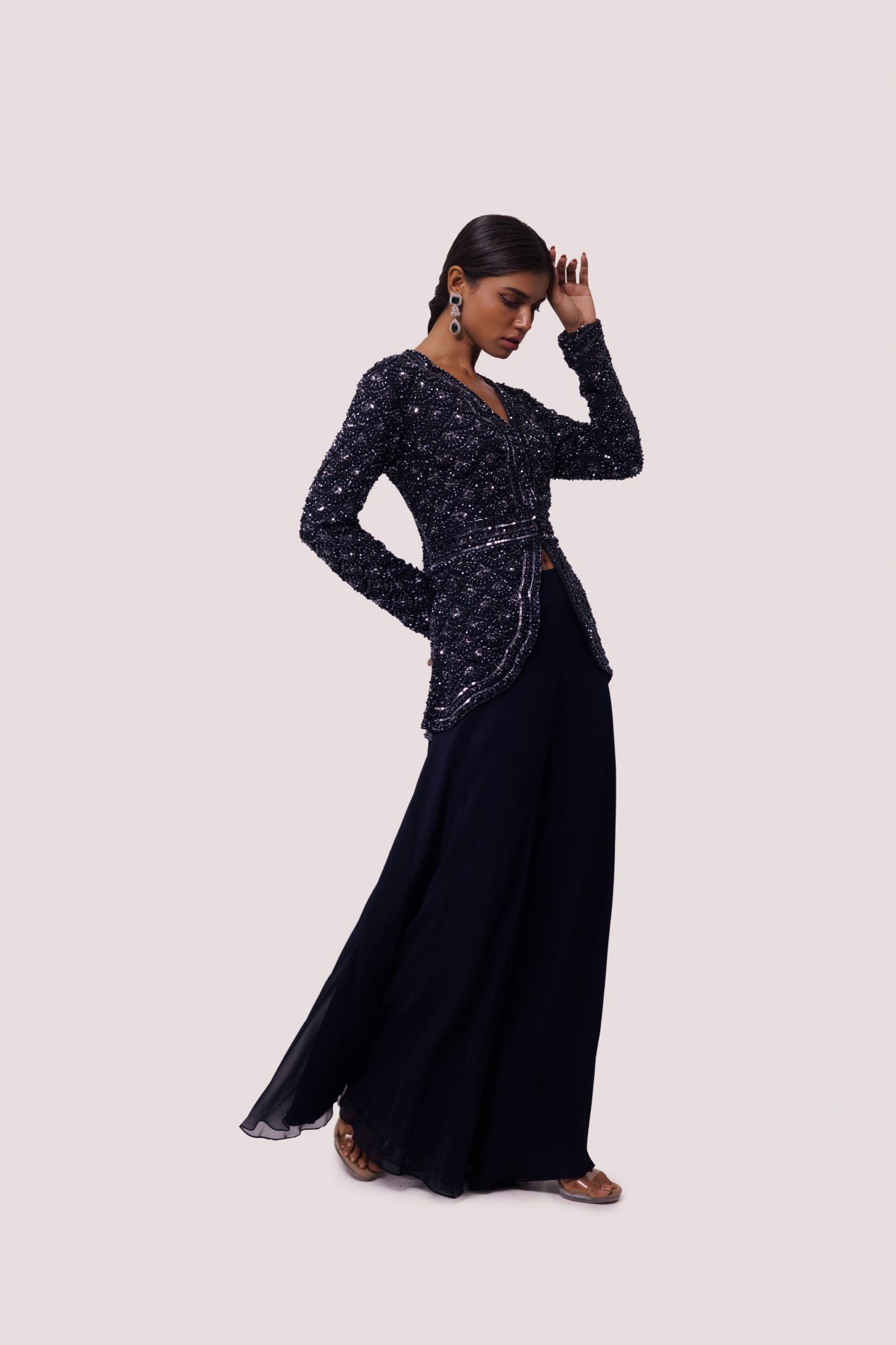 Exquisite navy blue georgette embellished co-ord set is perfect for parties and wedding occasions. It is crafted with cutdana and tikki work. The set is made of georgette fabric. Shop online from Pure Elegance.