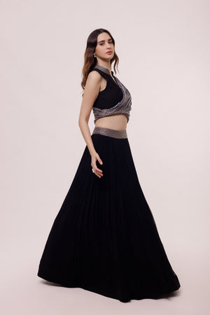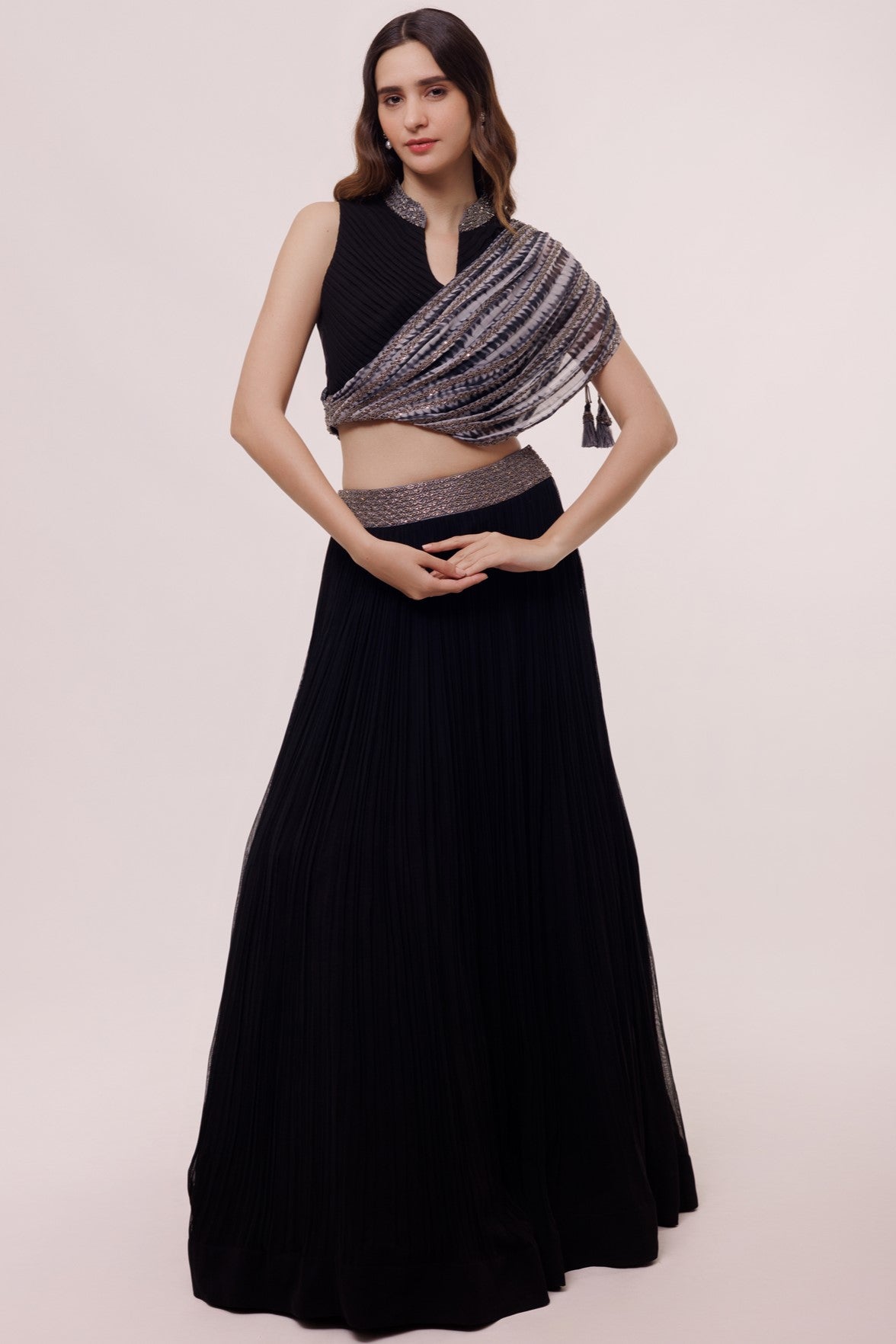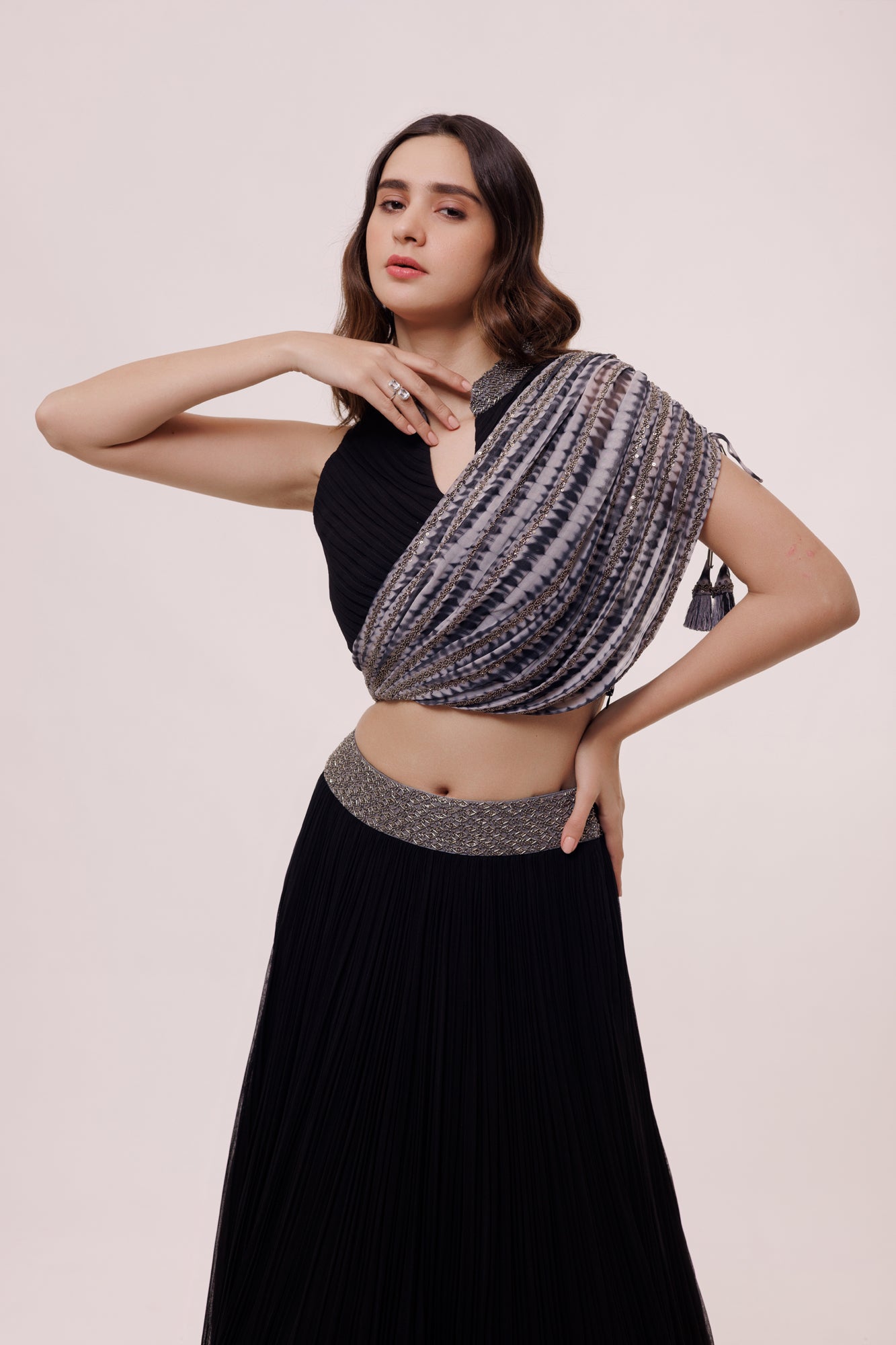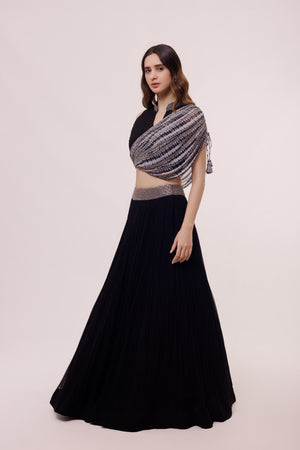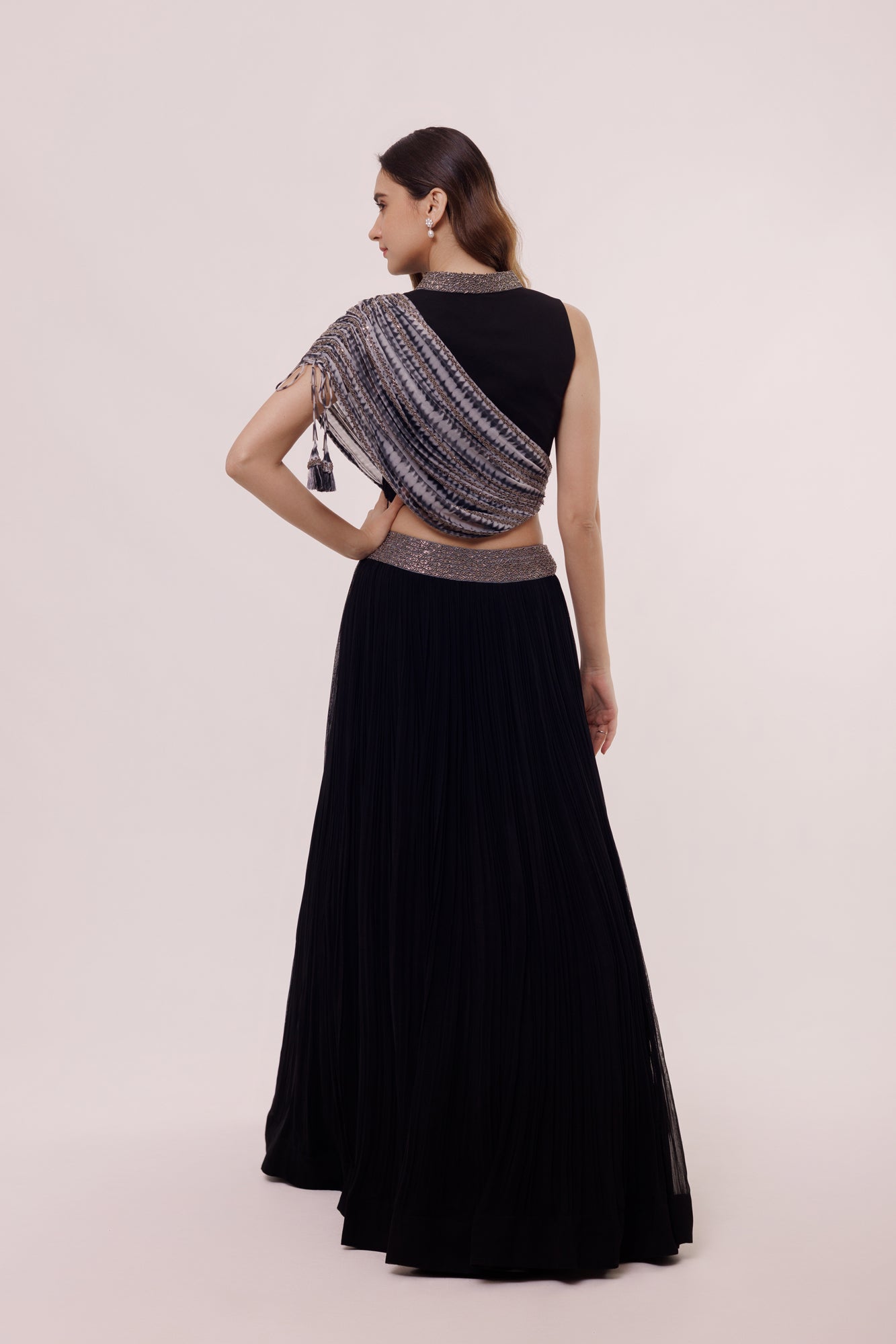 Exquisite black mono wrap sleeve georgette skirt set is perfect for parties and wedding occasions. The skirt belt is crafted with sequin, cheed and cutdana work. Shop online from Pure Elegance.