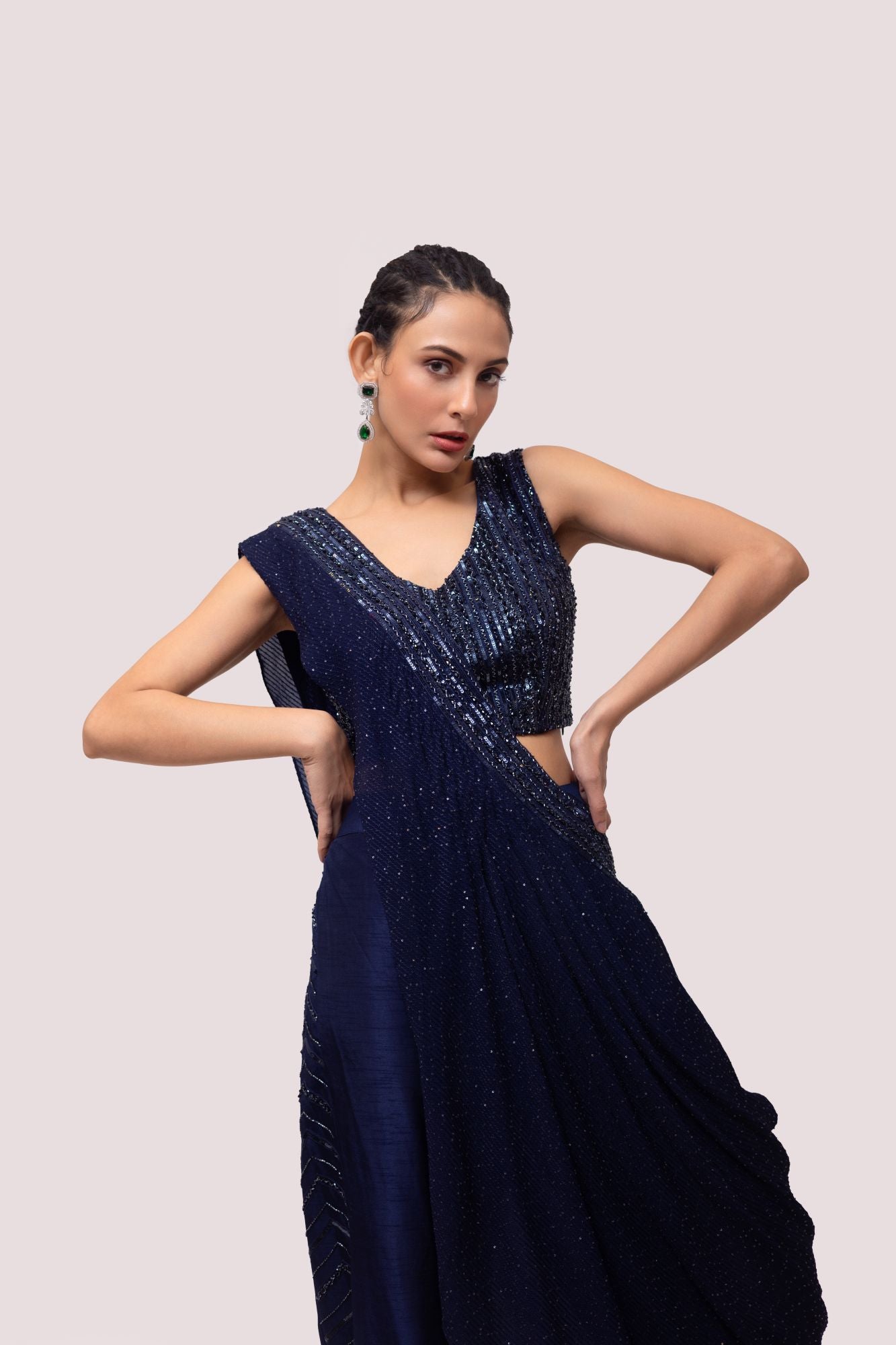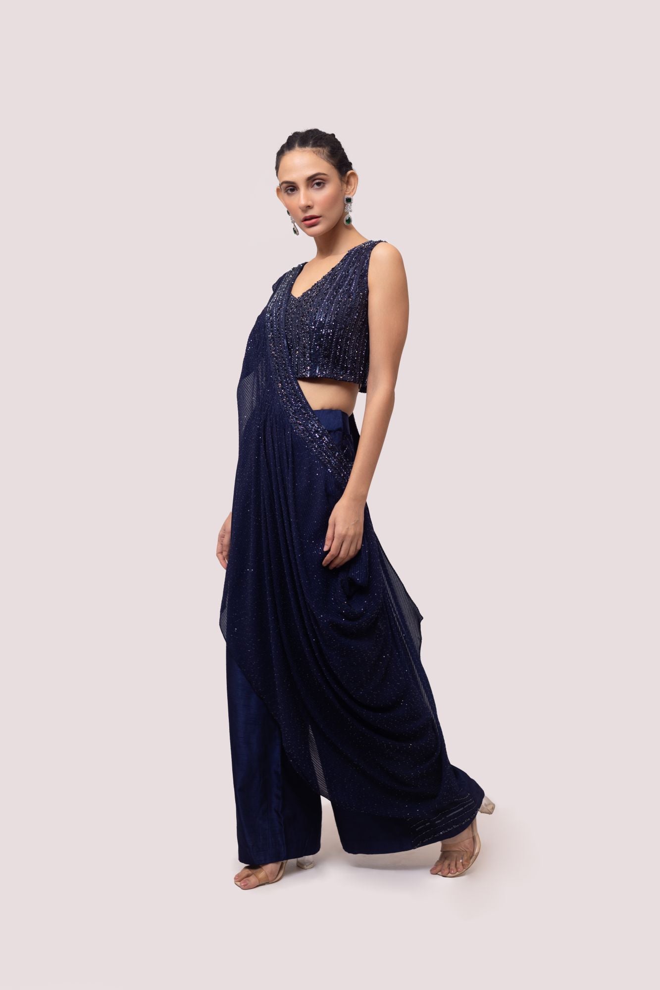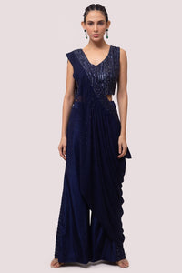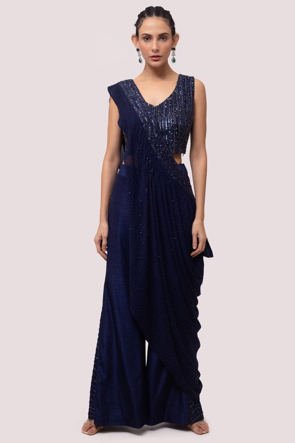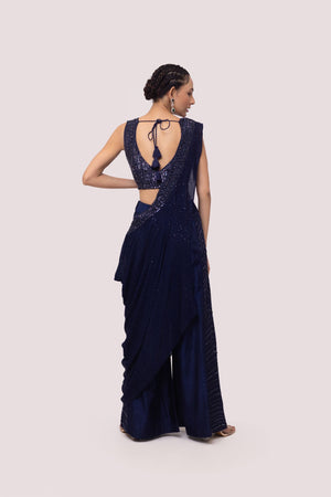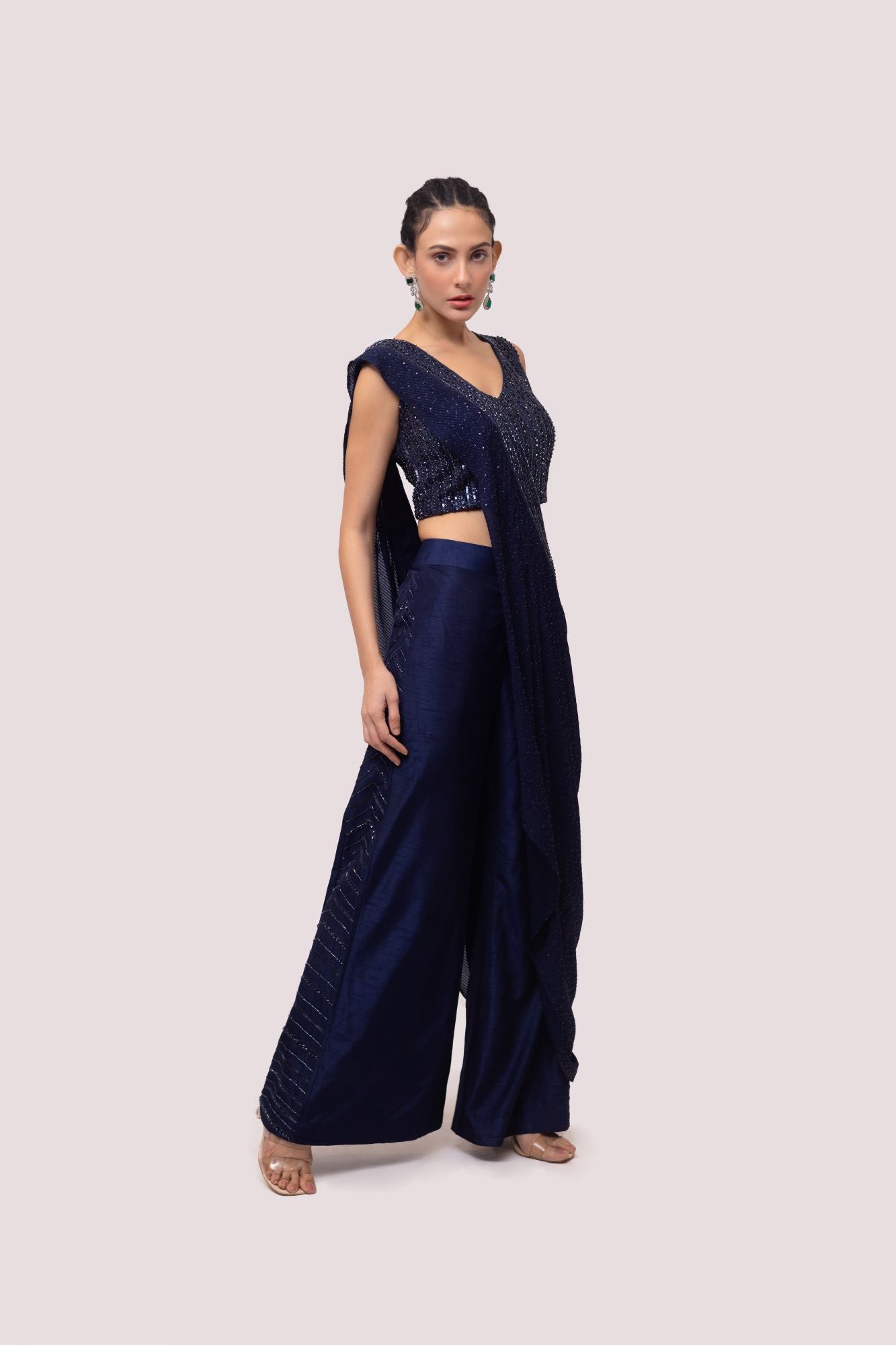 Keep it stylish on special occasions in this stunning navy blue embroidered silk chikan palazzo set. It comes with a heavy cutdana work dupatta. Shop online from Pure Elegance.