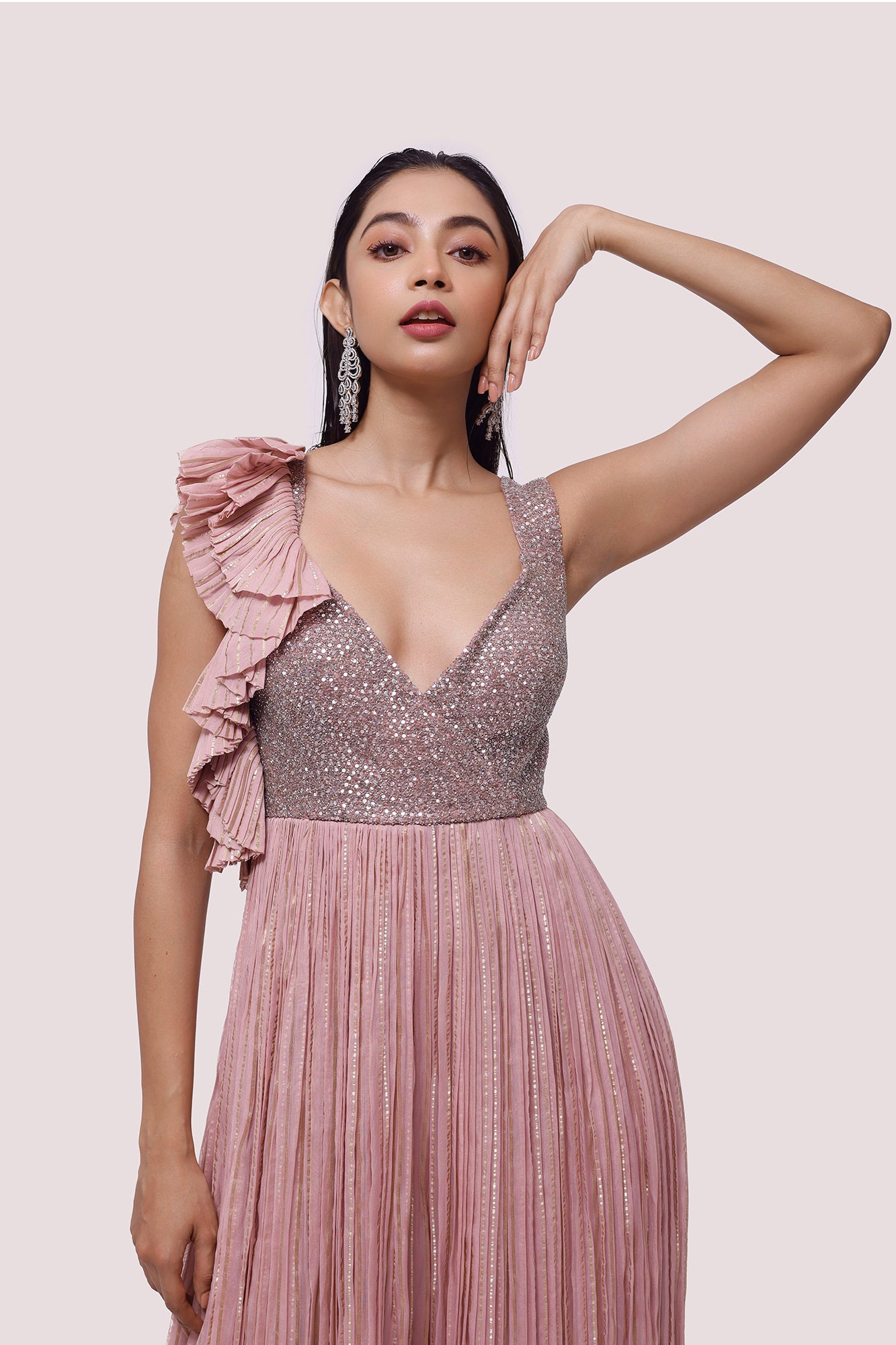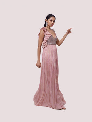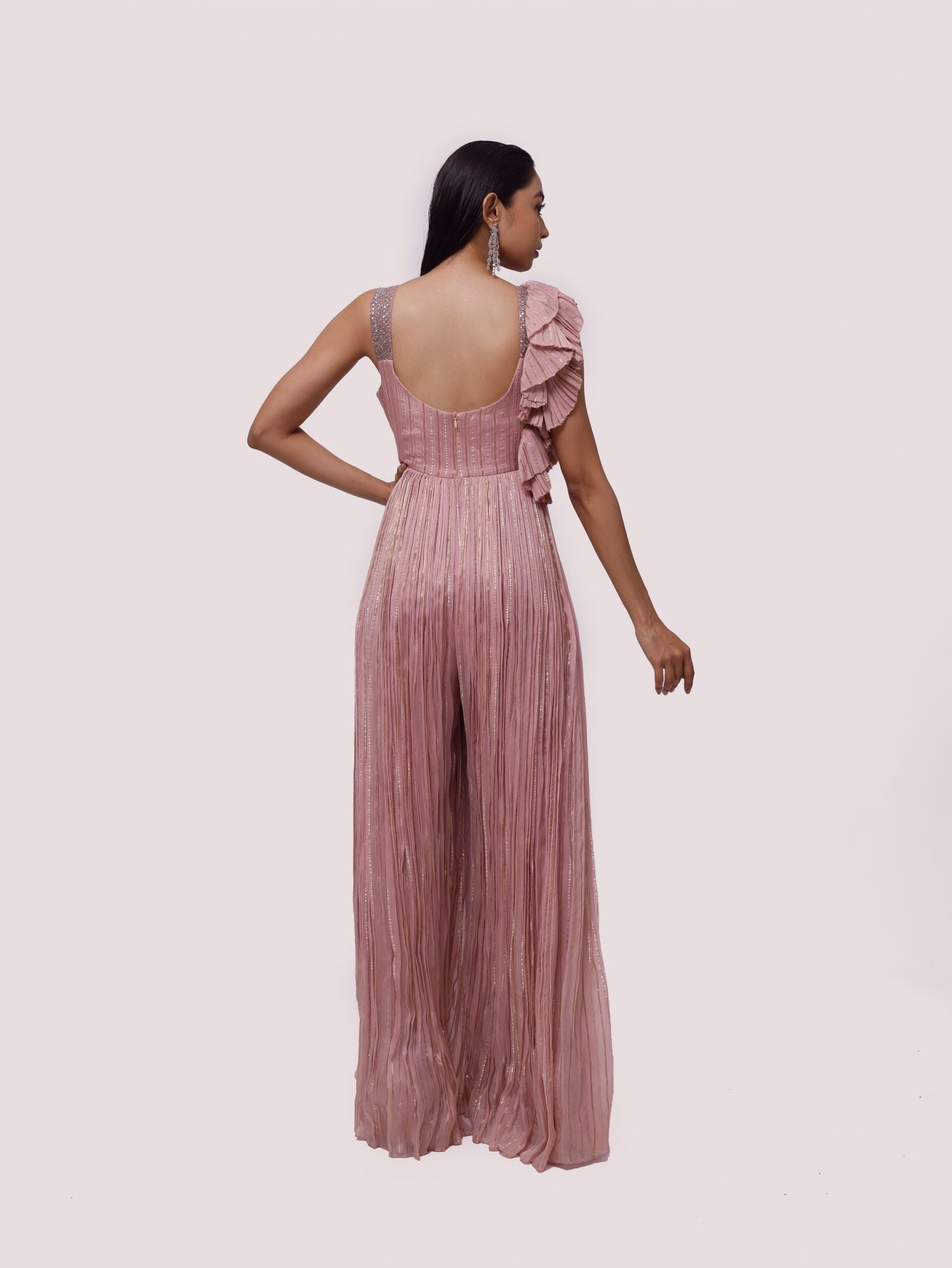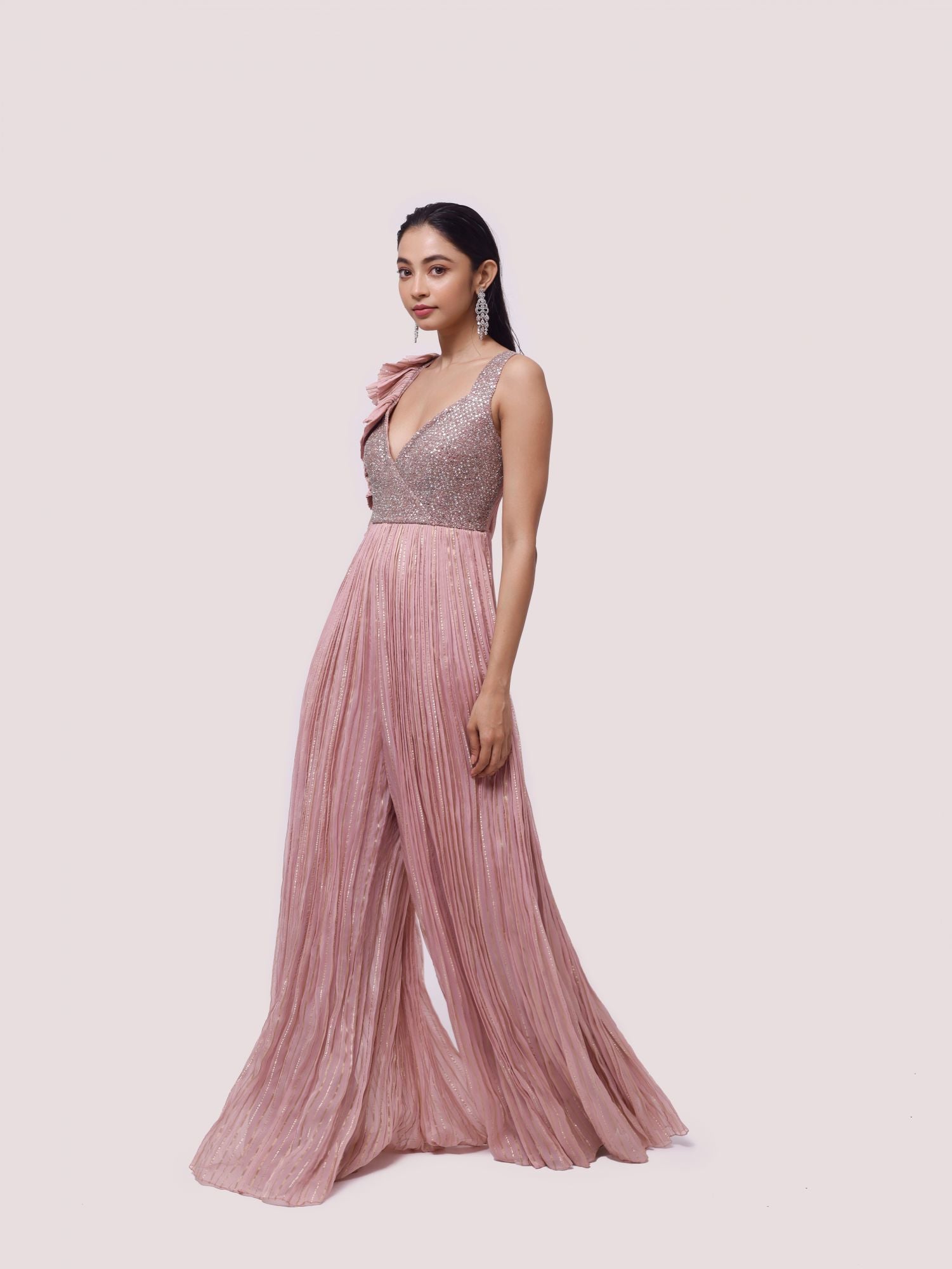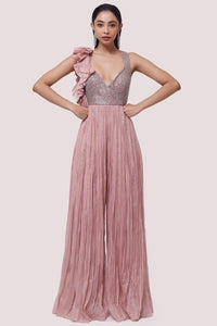 Keep it stylish on special occasions in this dusty pink embroidered organza jumpsuit. Shop online from Pure Elegance.