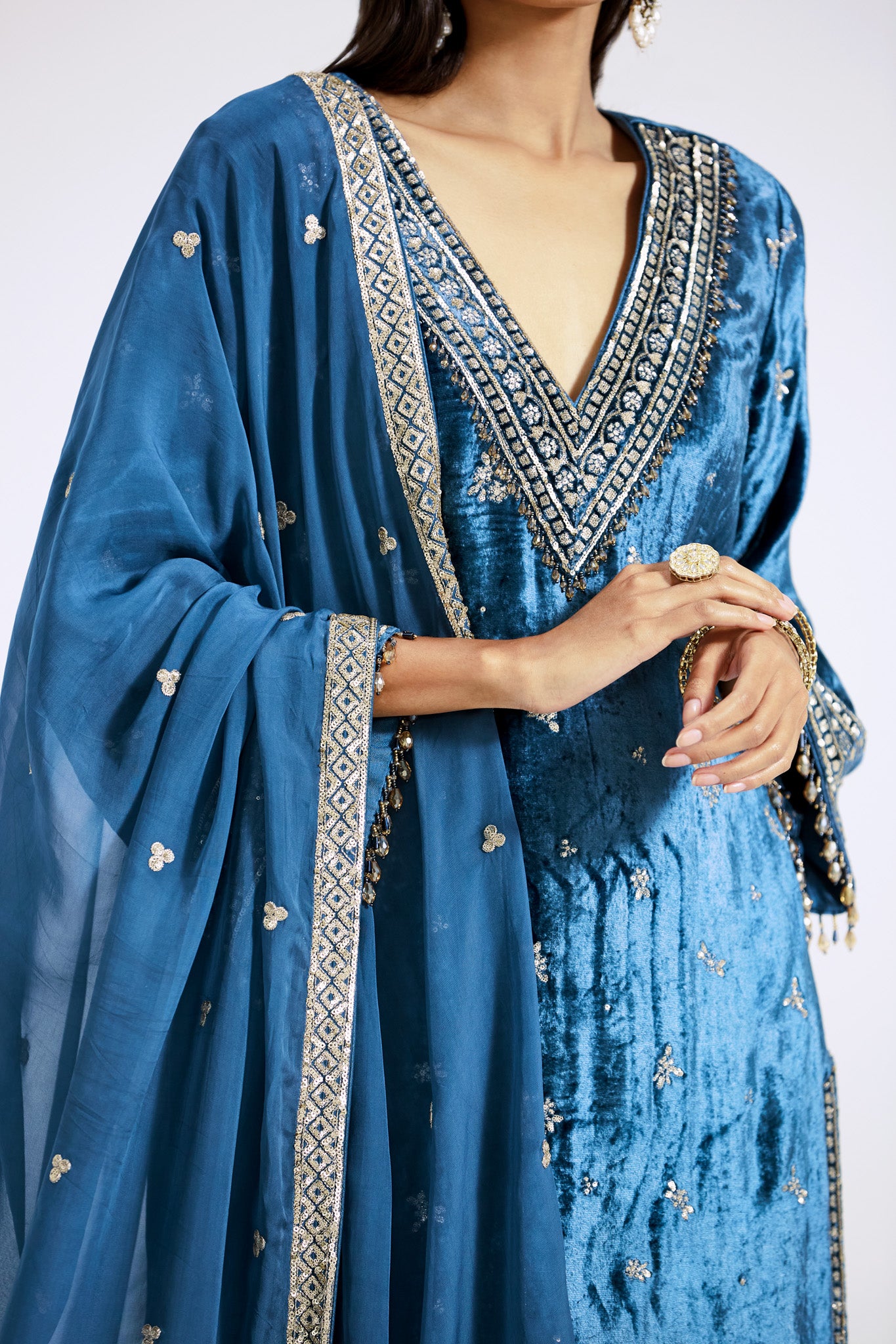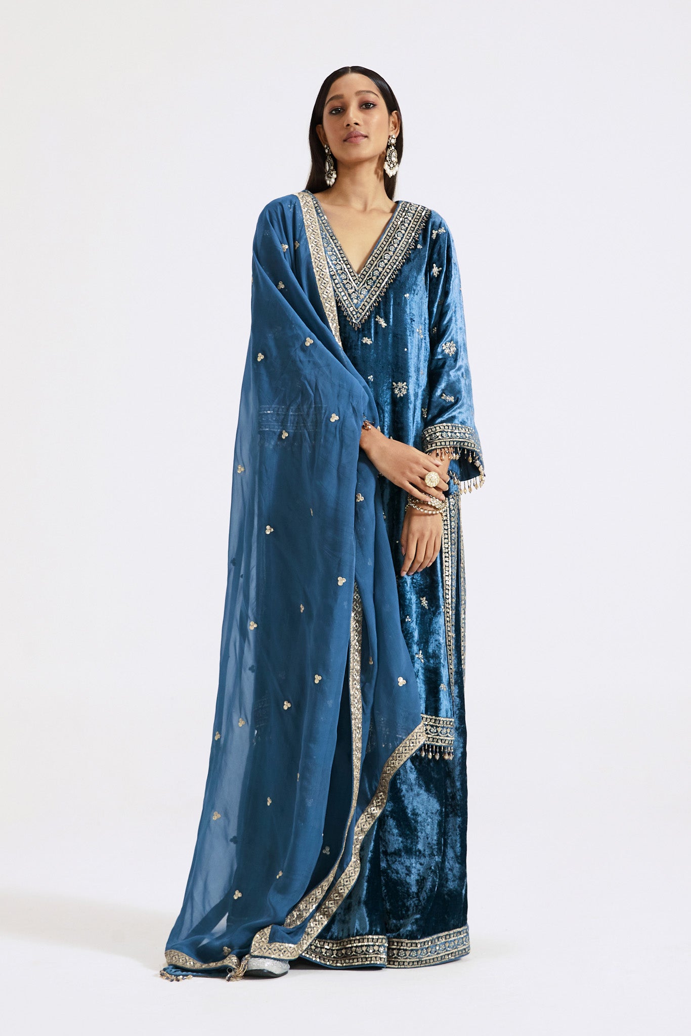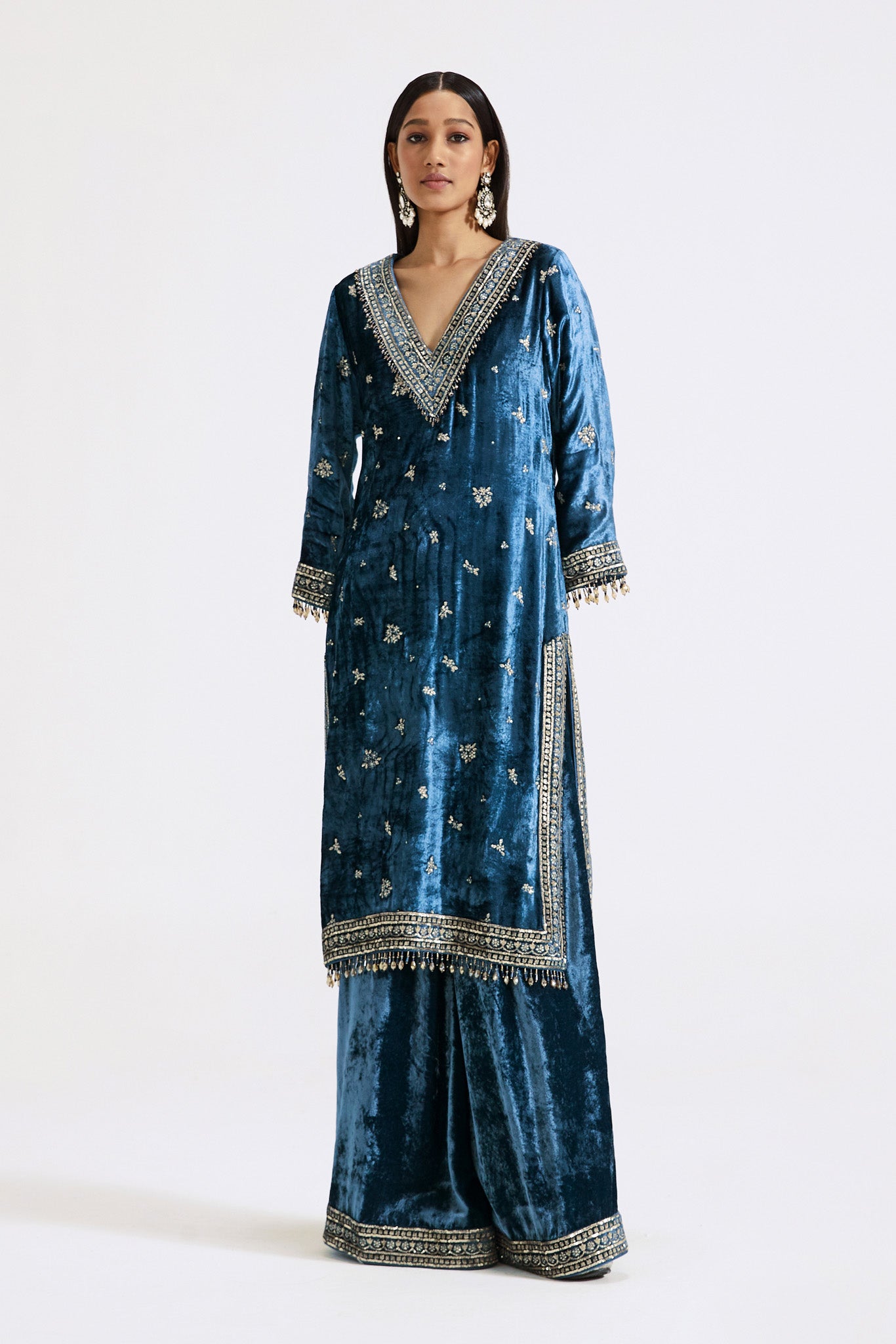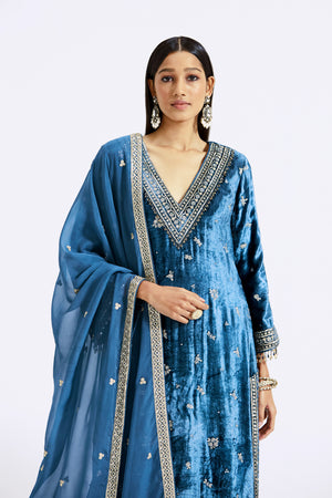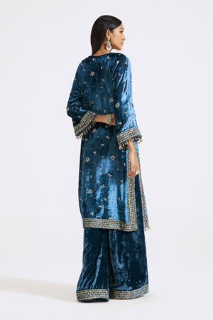 Keep it stylish on special occasions in this stunning blue velvet embroidered sharara suit. The suit comes with an embroidered dupatta. Shop online from Pure Elegance.