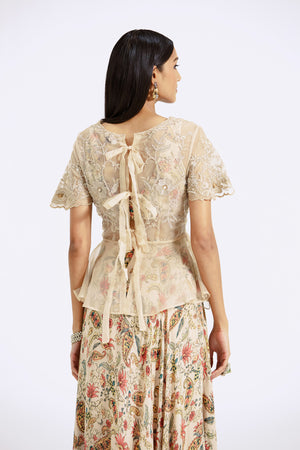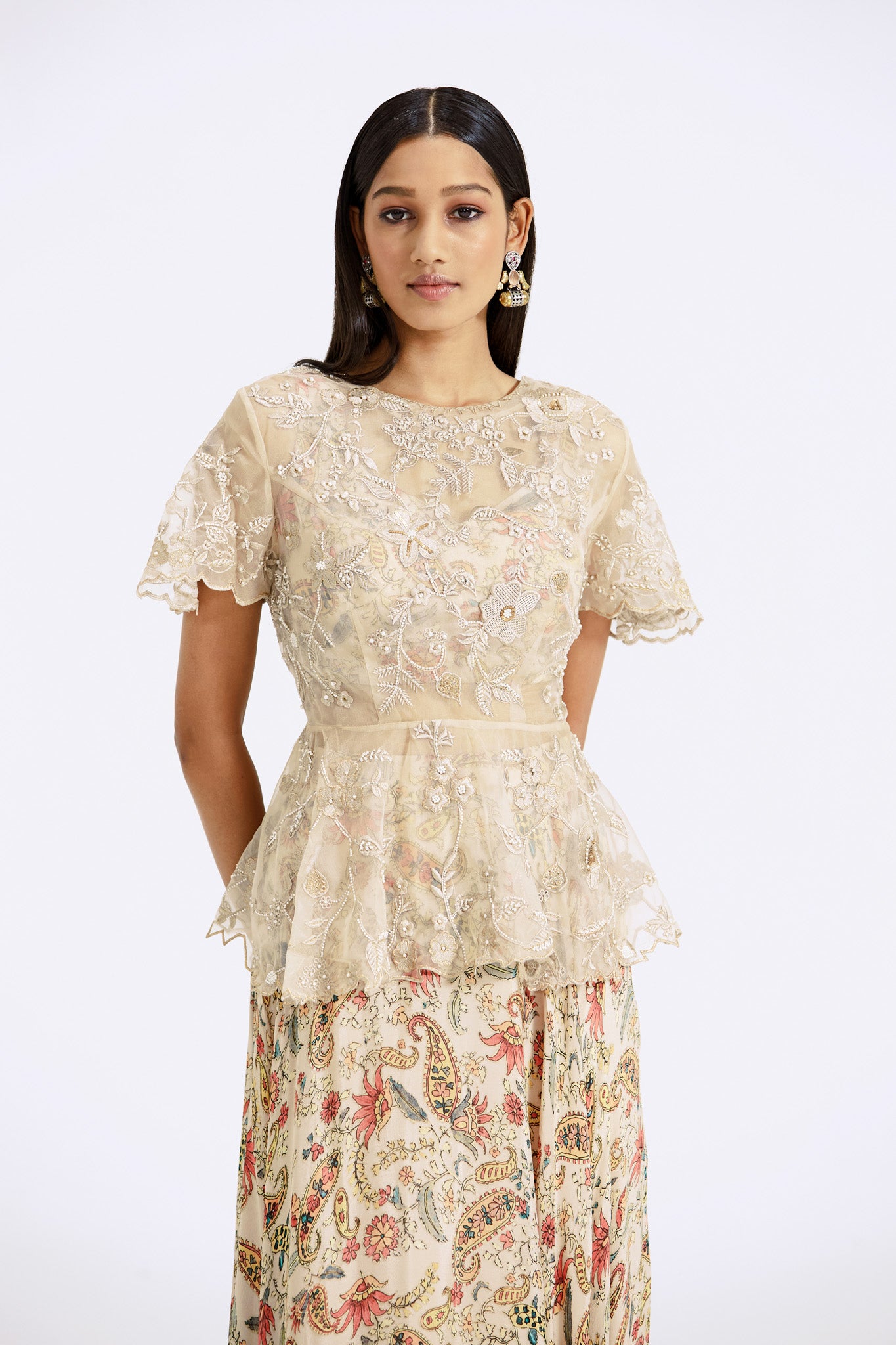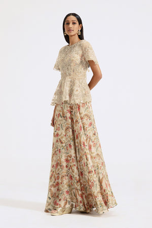Keep it stylish on special occasions in this cream printed and embroidered chinnon and organza skirt set. Shop online from Pure Elegance.