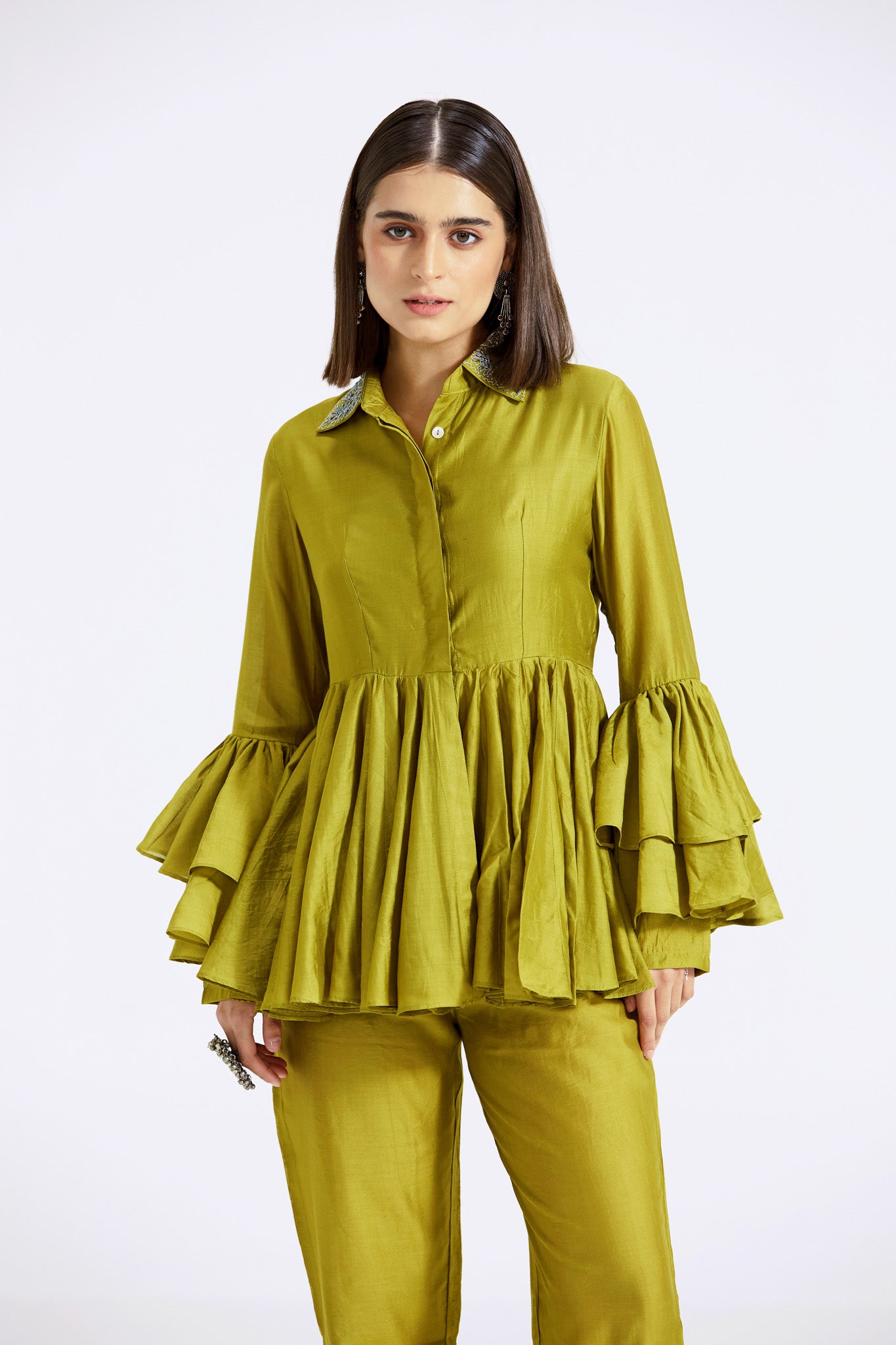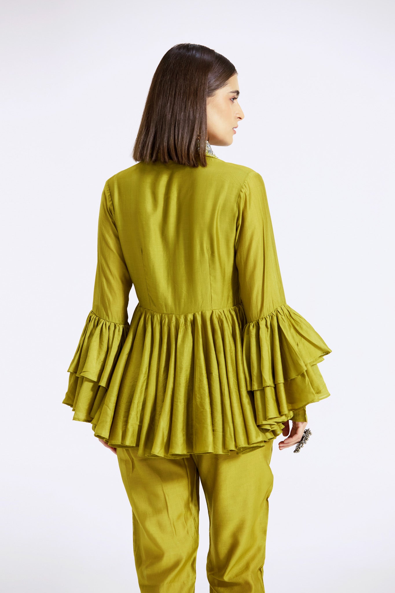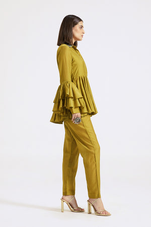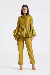 Keep it stylish on special occasions in this elegant olive green chanderi contemporary co-ord set. Shop online from Pure Elegance.