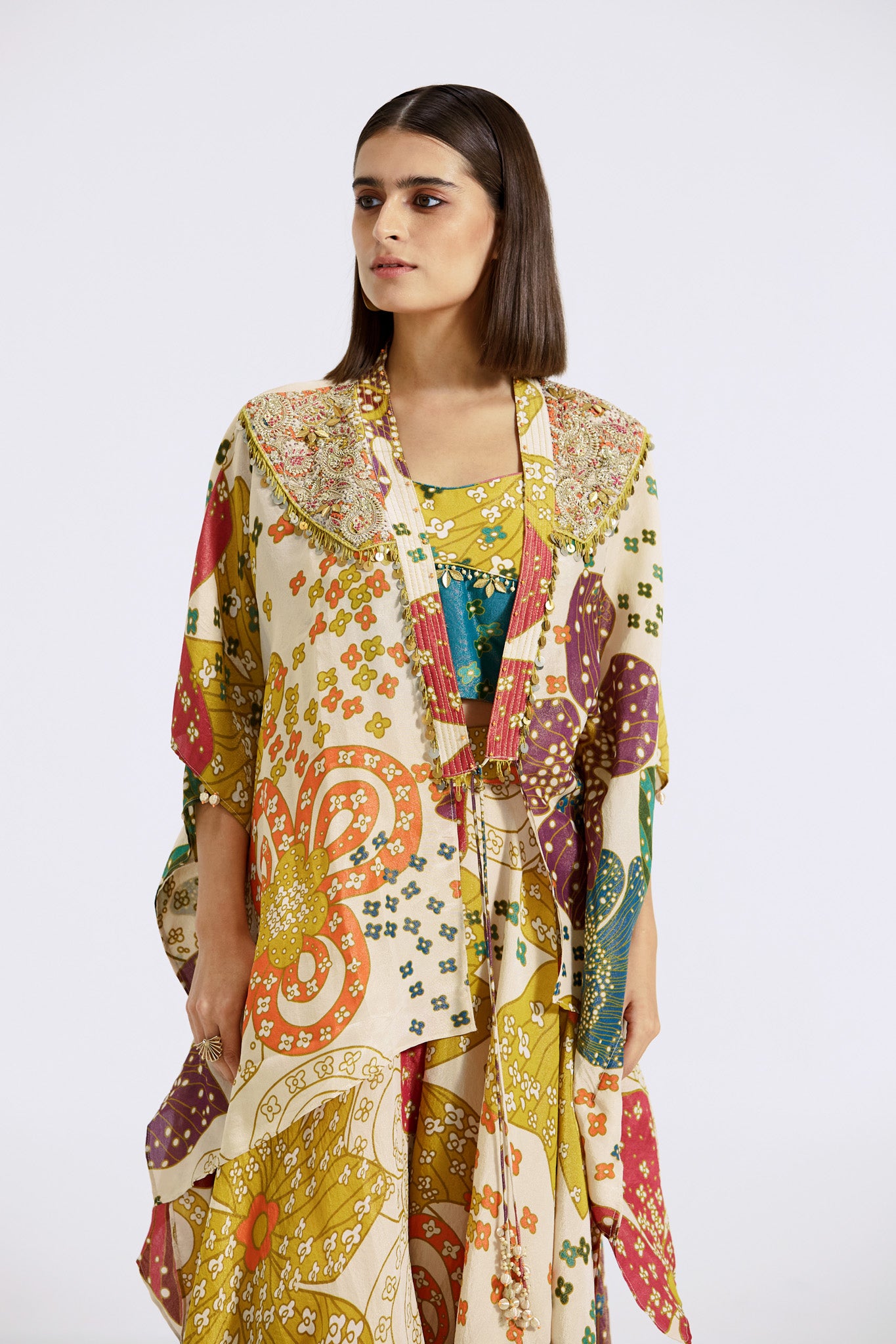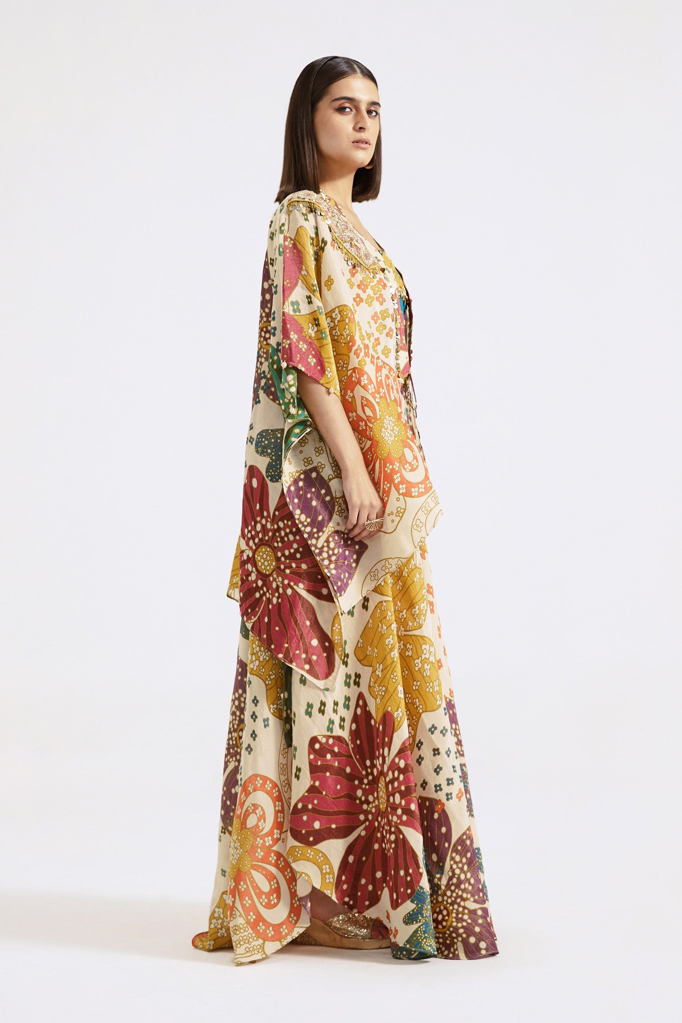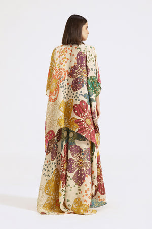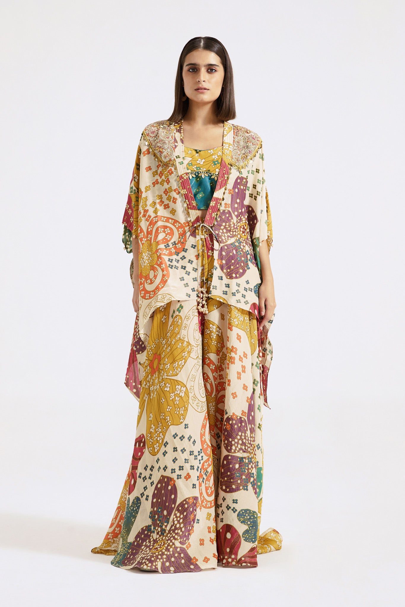 Keep it stylish on special occasions in this stunning multicolor printed and embroidered tissue contemporary sharara set. Shop online from Pure Elegance.