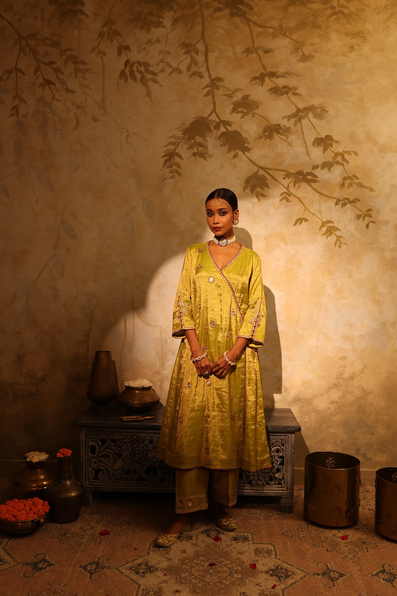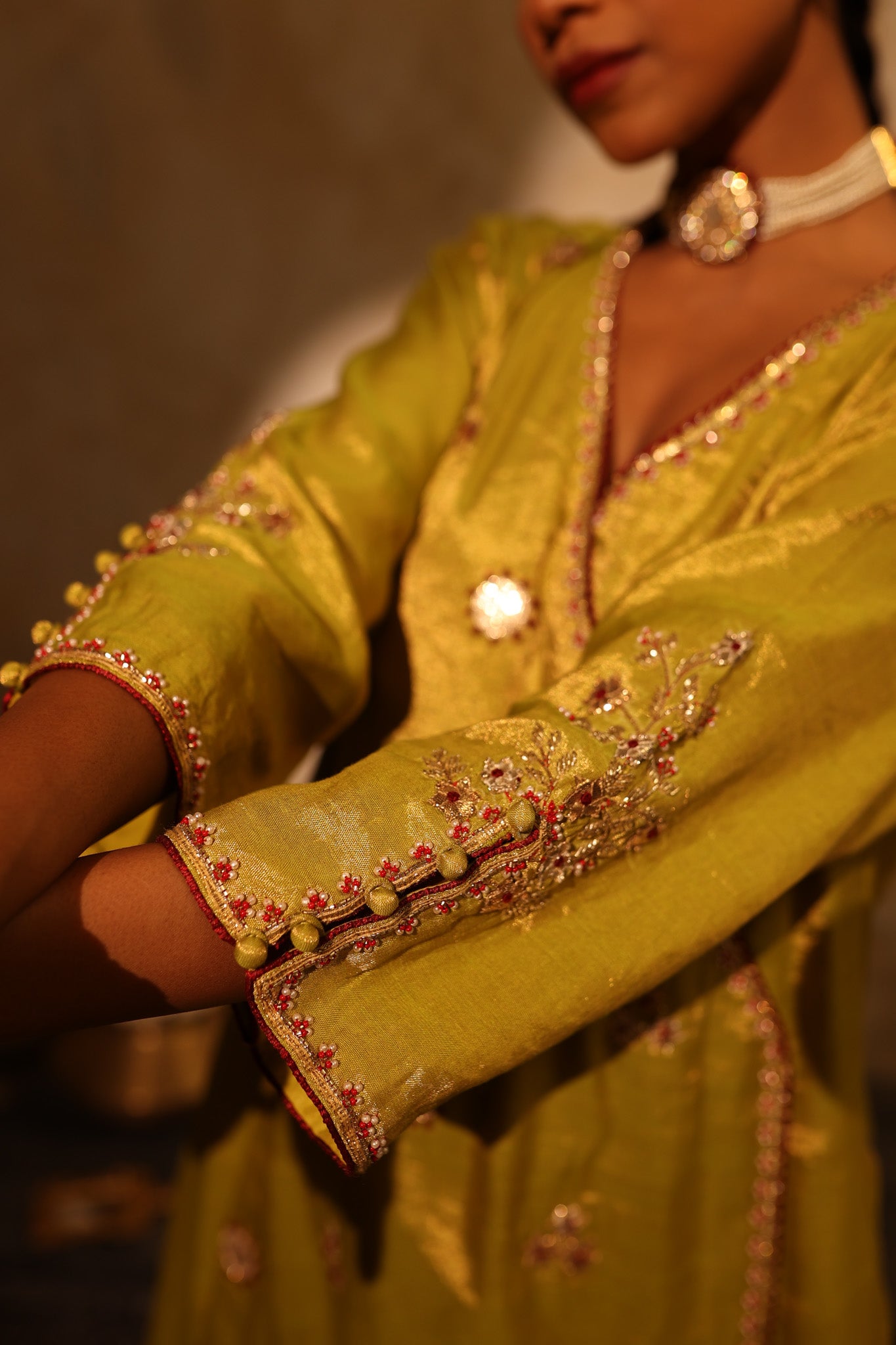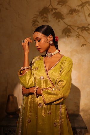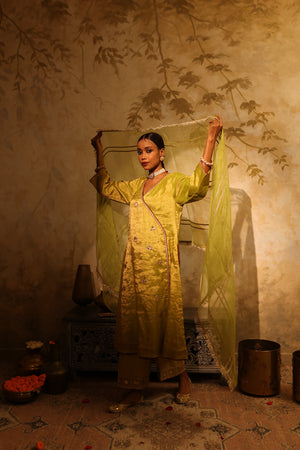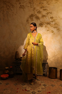 Stunning lime green embroidered tissue suit is perfect festive wear. It comes with matching pants and organza dupatta. Shop online from Pure Elegance.