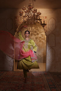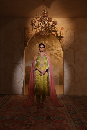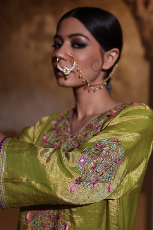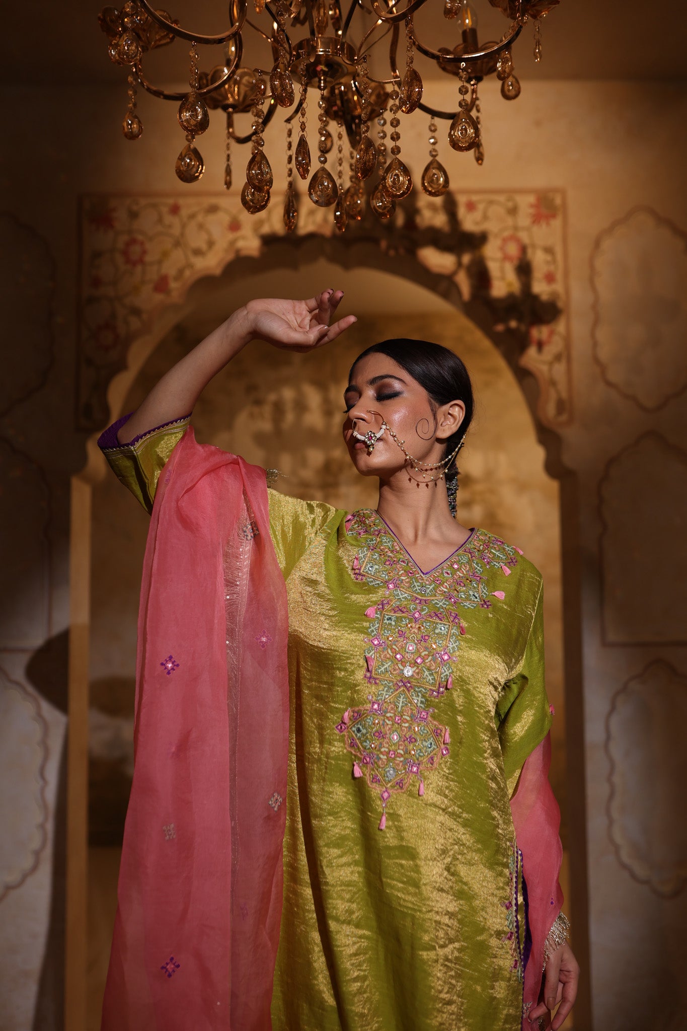 Stunning pista green tissue embroidered kurta set with dupatta is a perfect festive wear. Shop online from Pure Elegance.