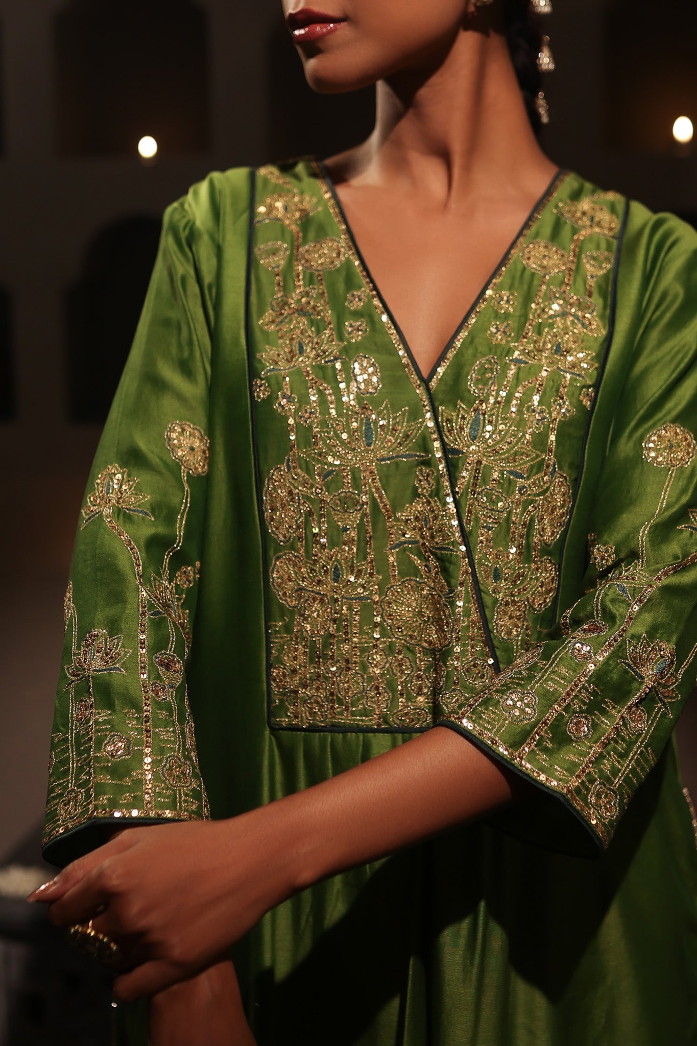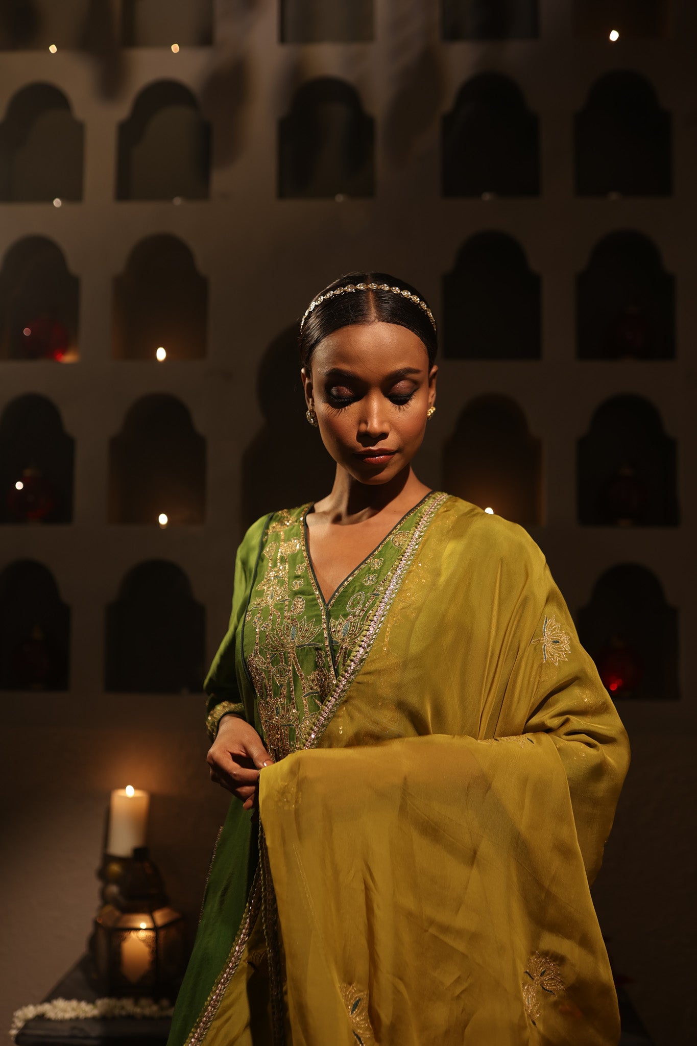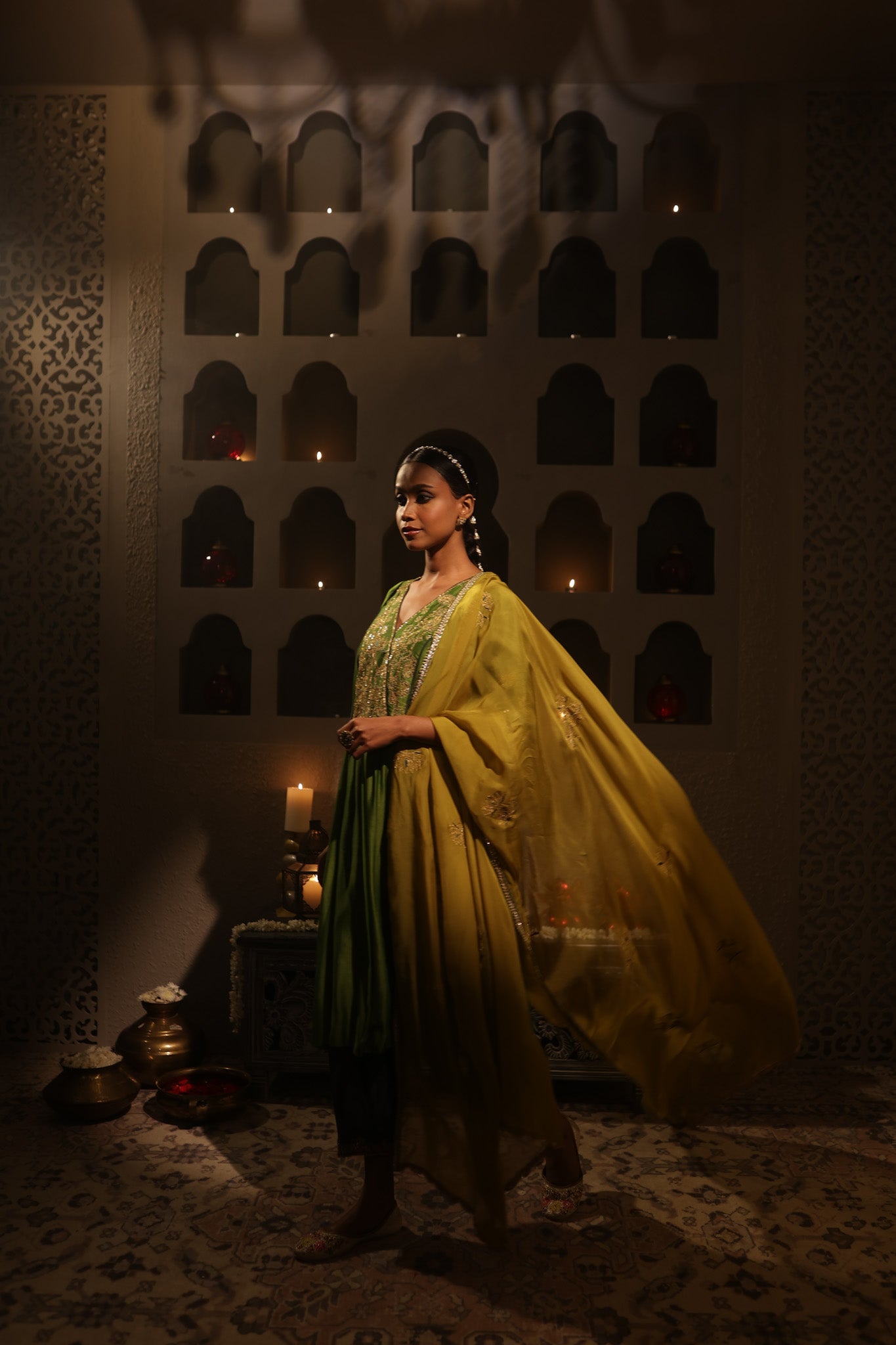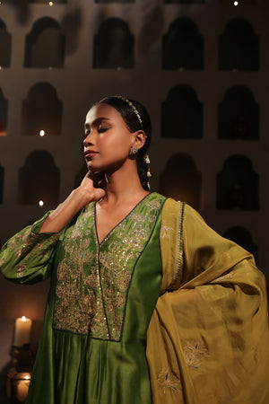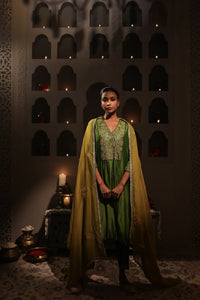 Stunning mehendi green chanderi embroidered suit is a perfect festive wear. It comes with a pista green dupatta. Shop online from Pure Elegance.