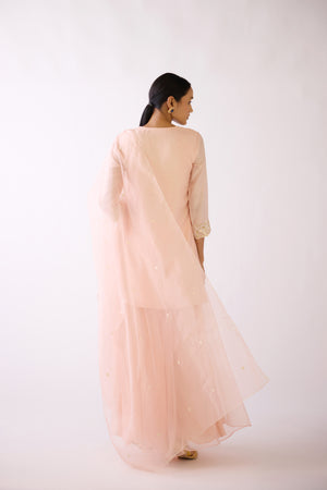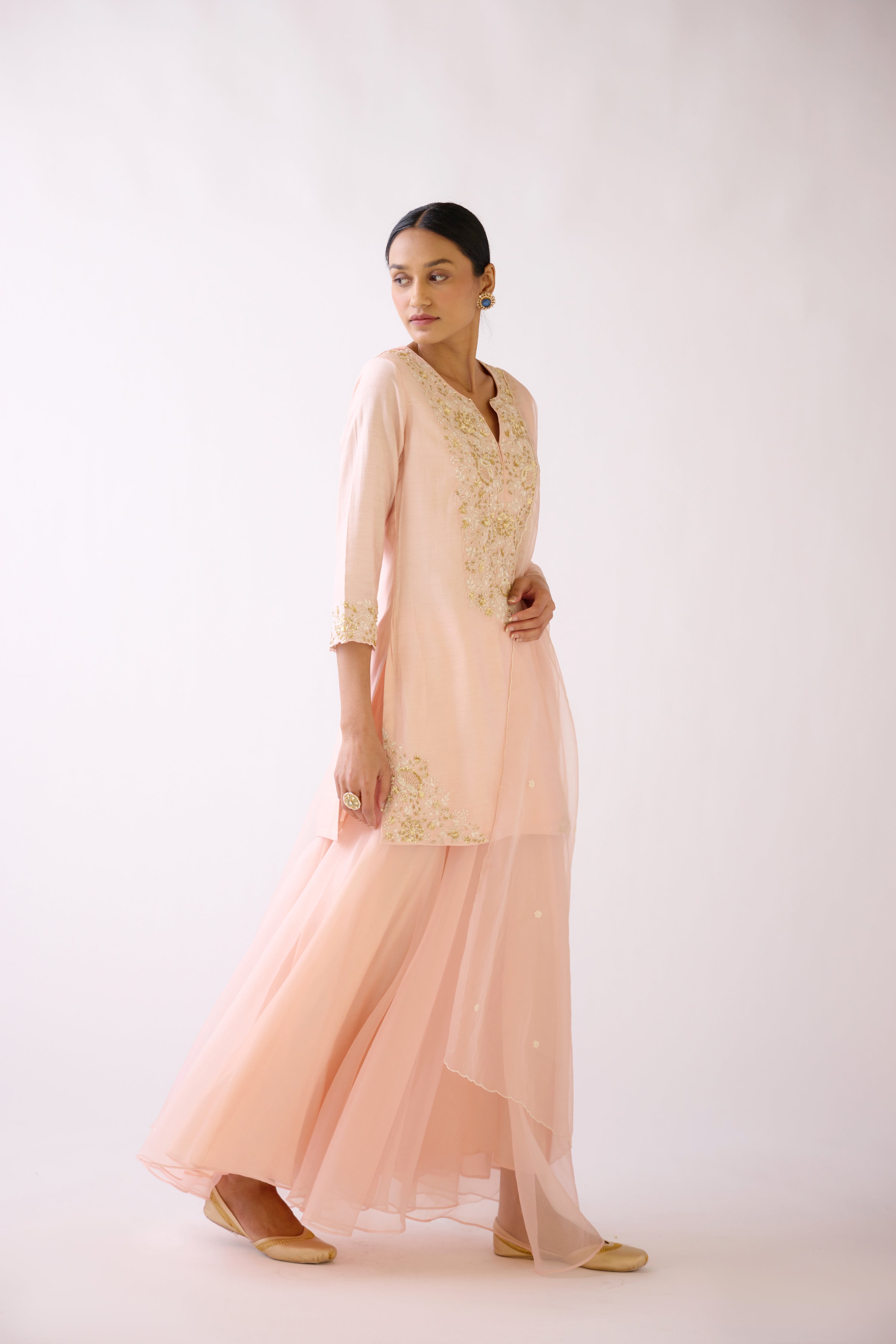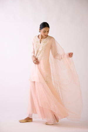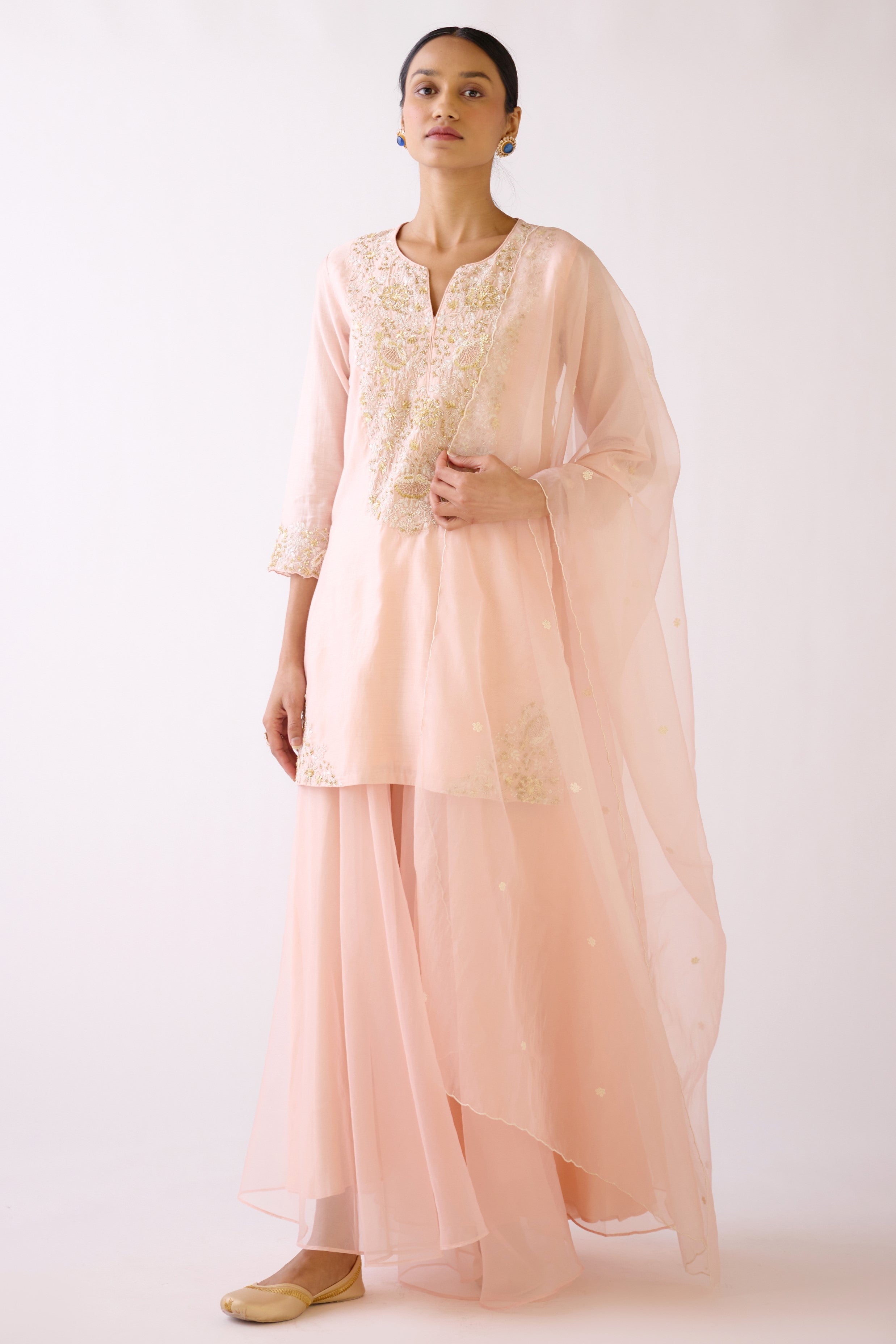 Stunning baby pink embroidered cotton silk sharara suit is a perfect festive wear. It comes with a matching dupatta. Shop online from Pure Elegance.