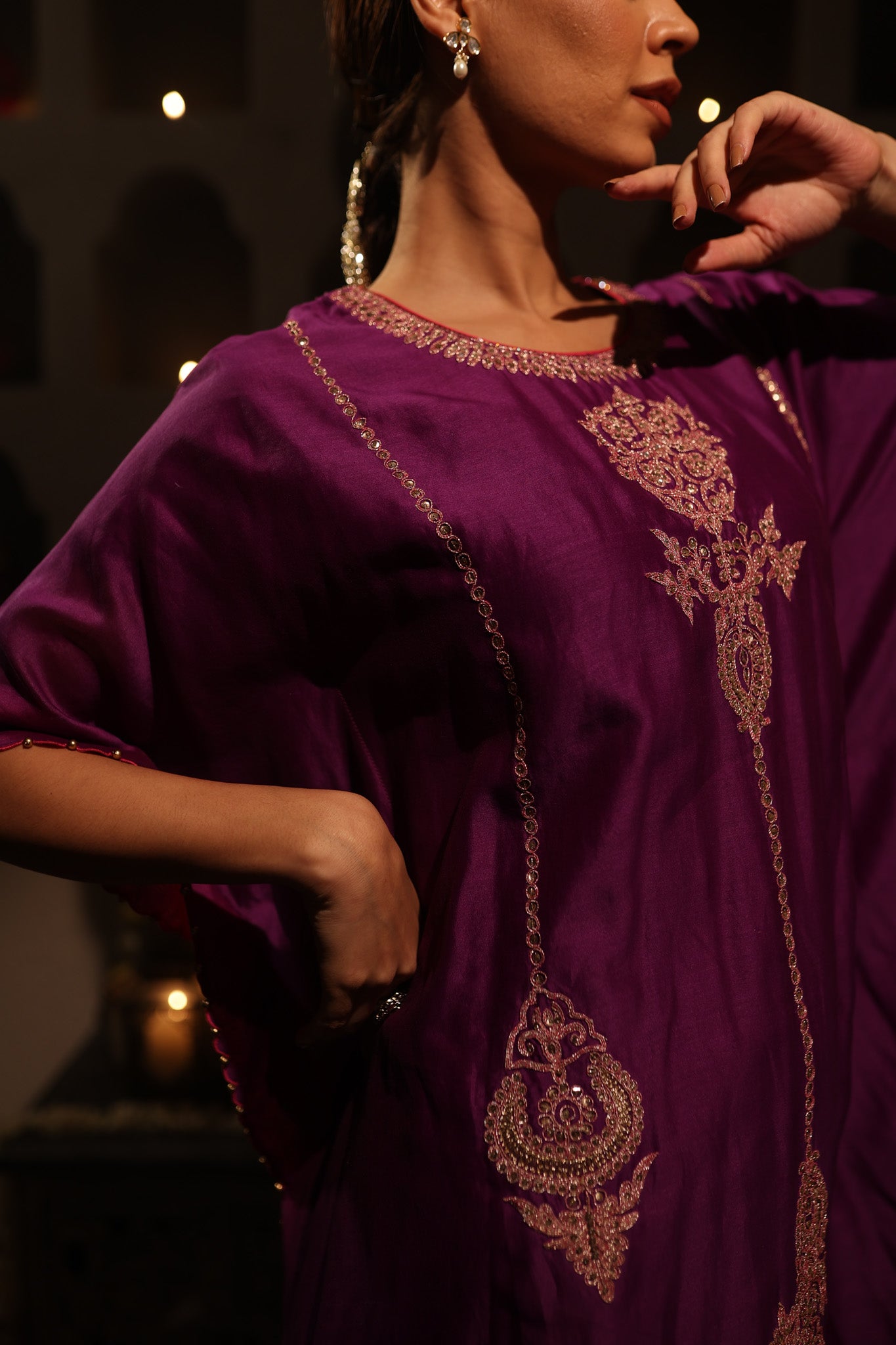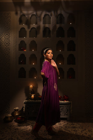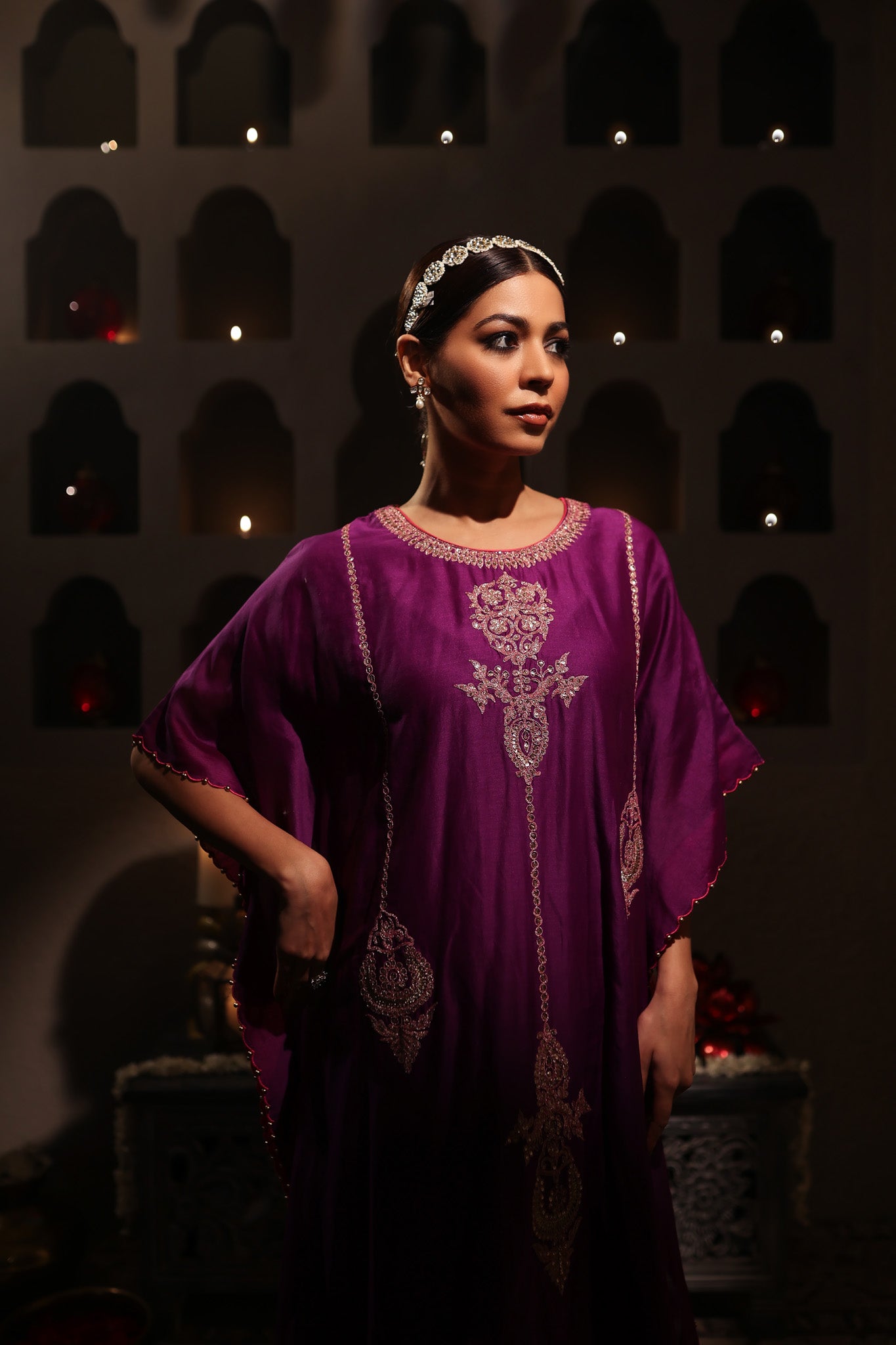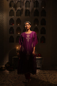 Stunning purple chanderi embroidered kaftaan suit is a perfect festive wear. Shop online from Pure Elegance.