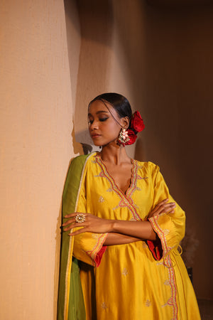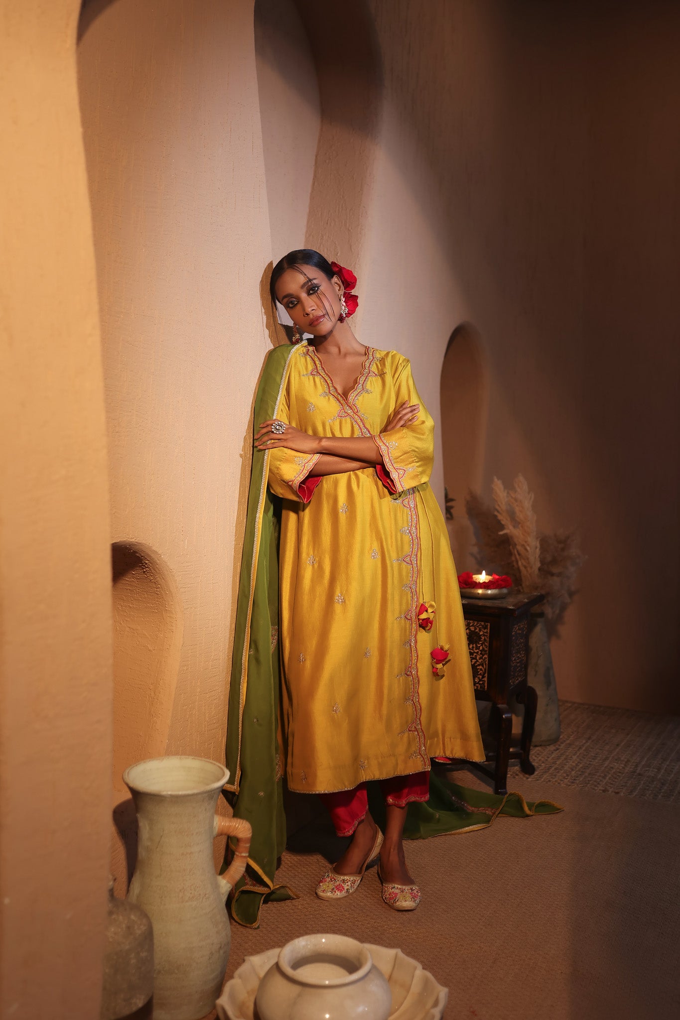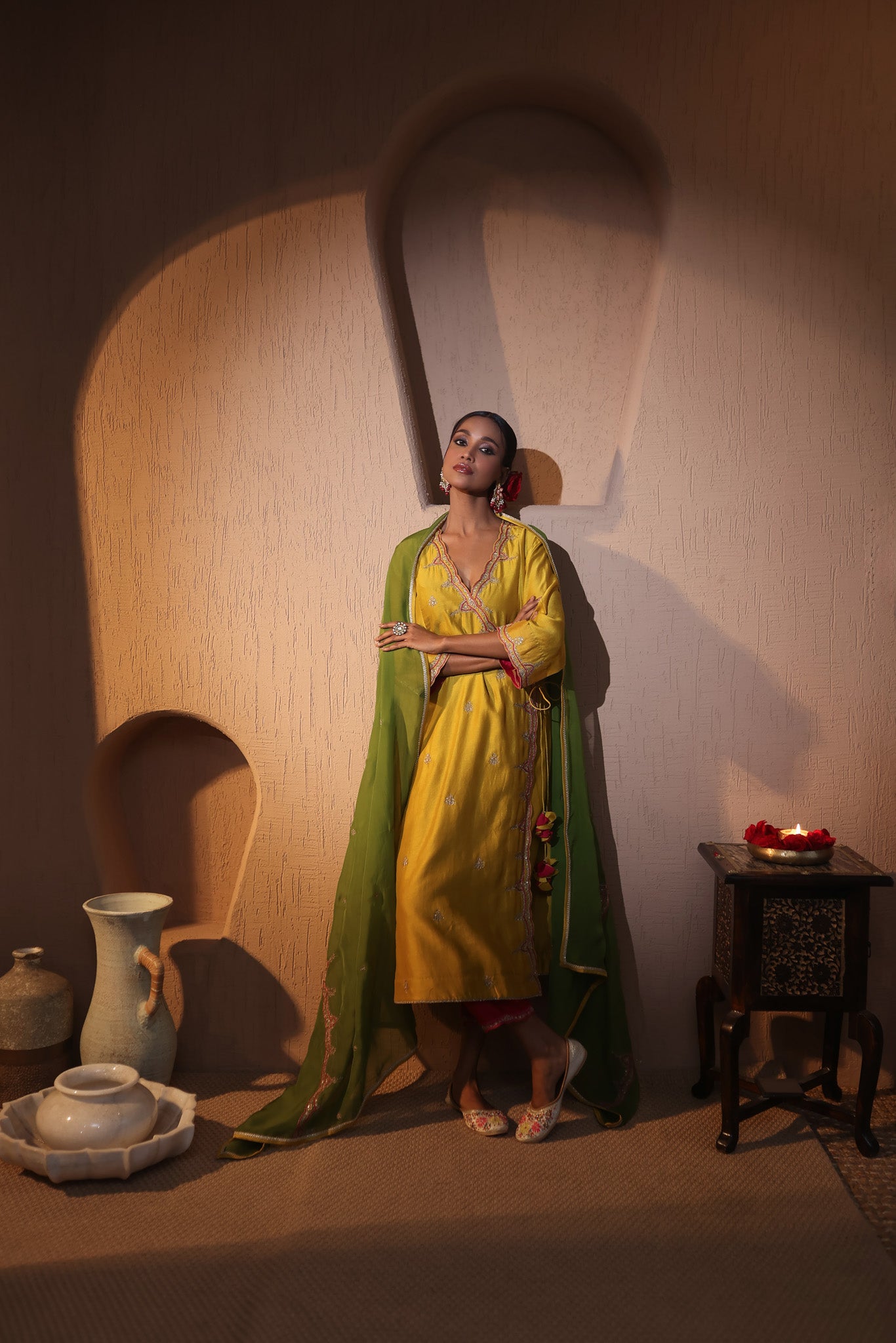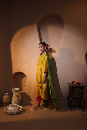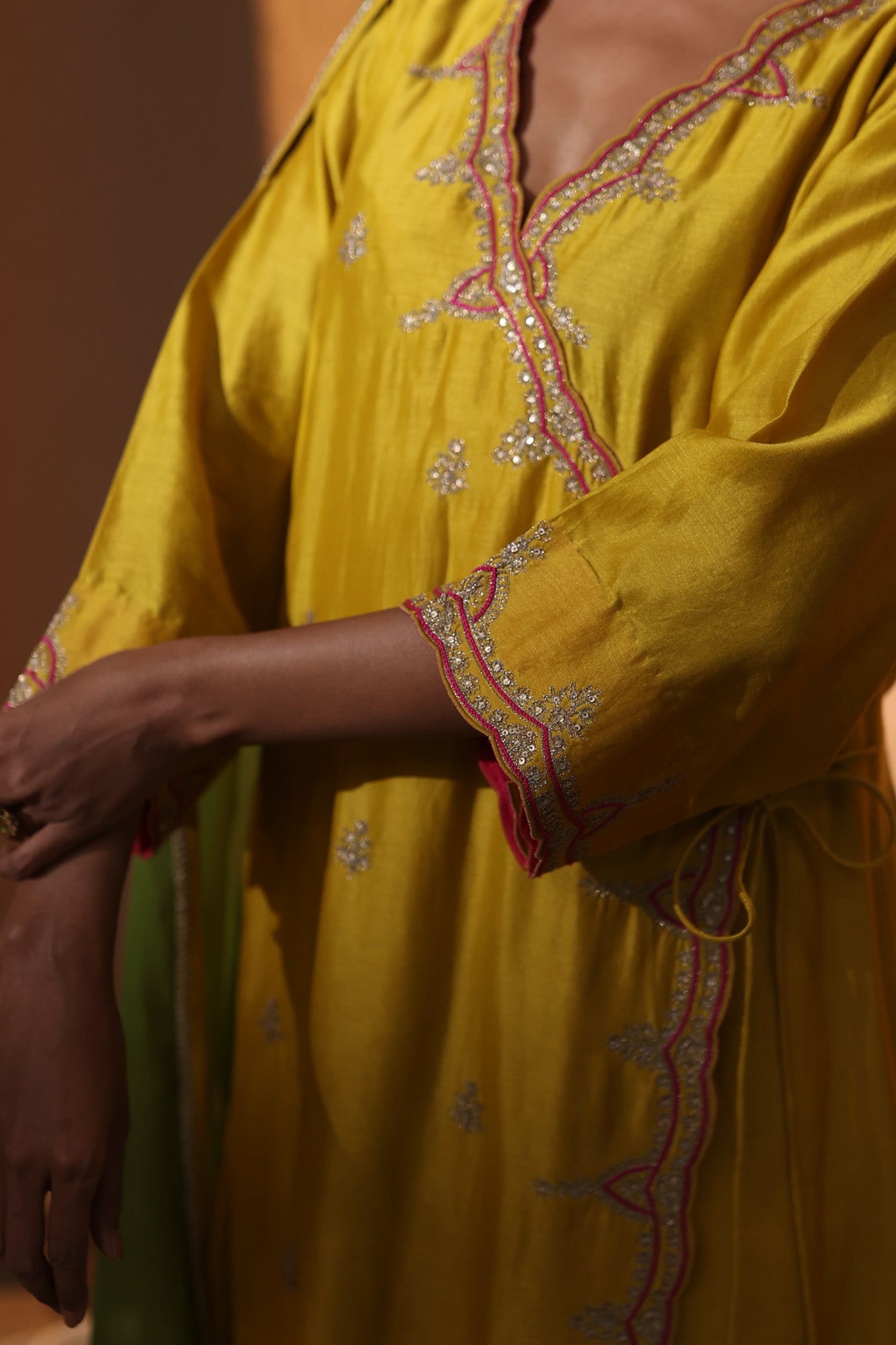 Stunning yellow embroidered chanderi suit is a perfect festive wear. It comes with a pink palazzo and green dupatta. Shop online from Pure Elegance.