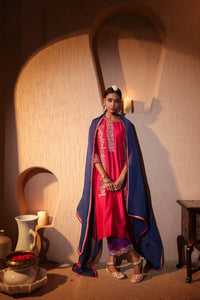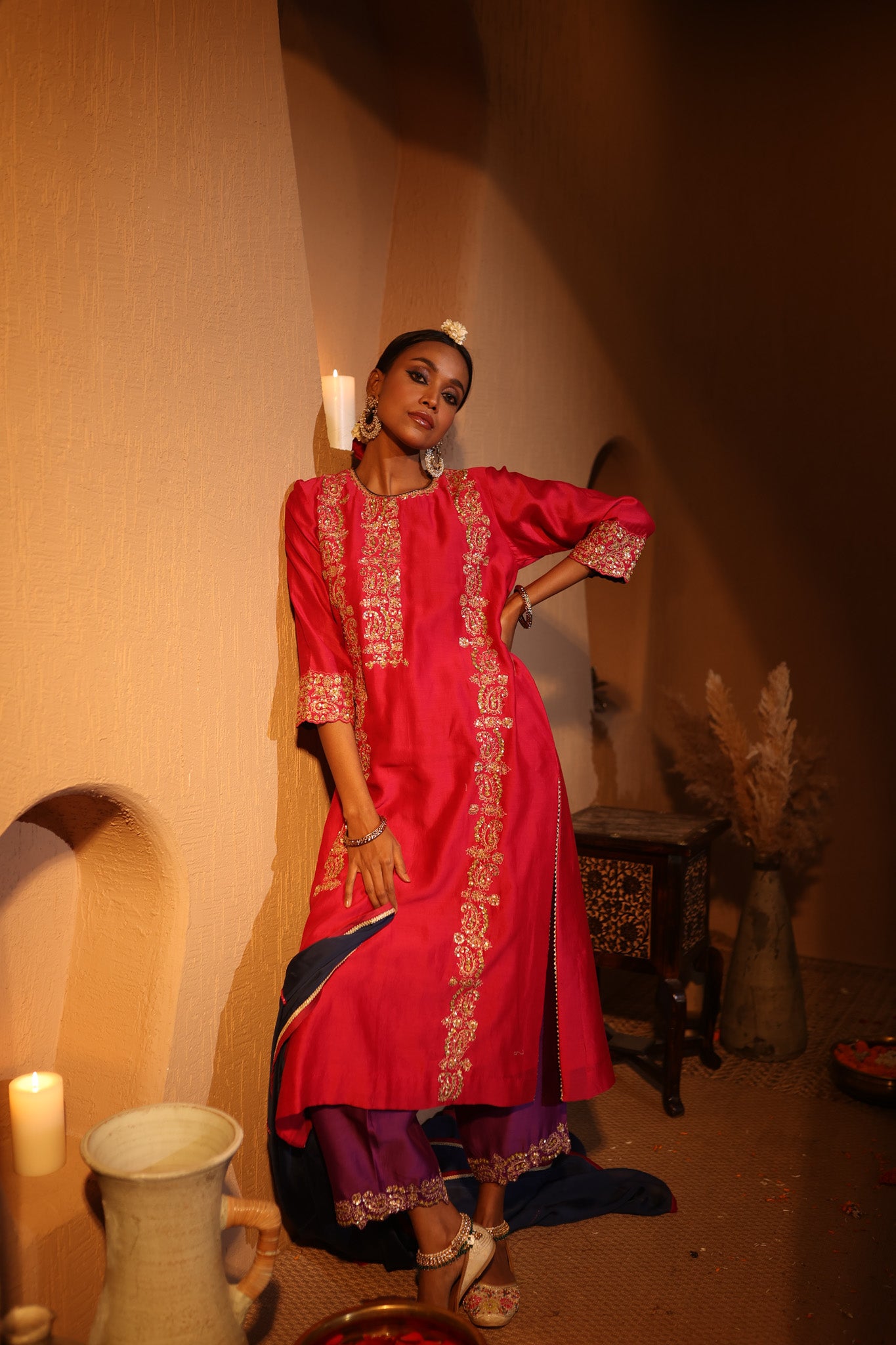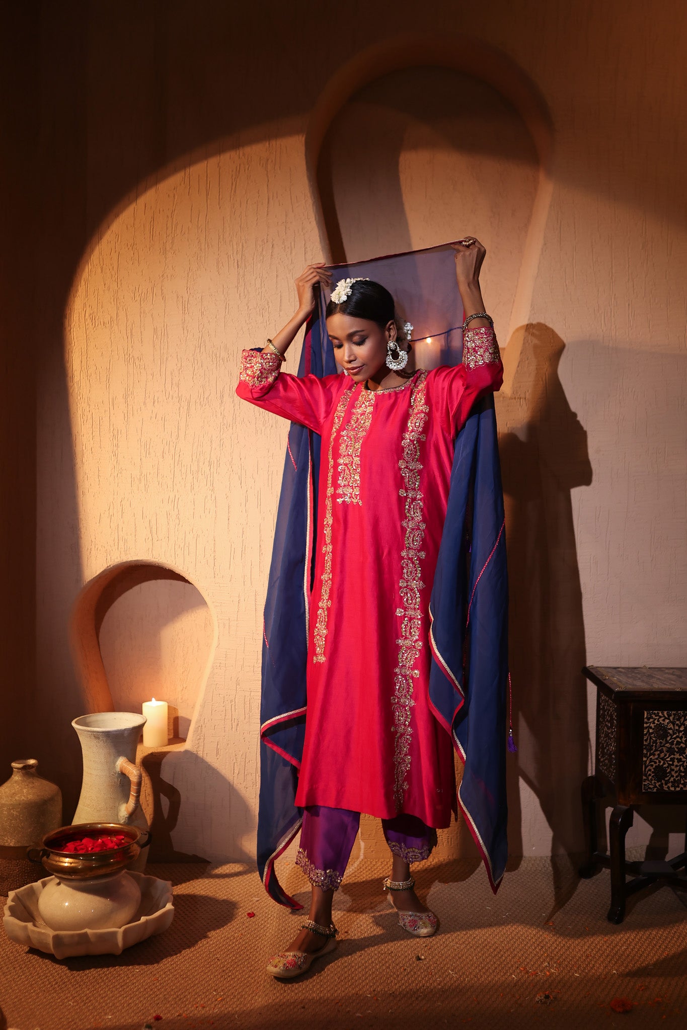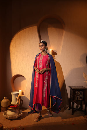 Stunning pink embroidered chanderi suit is a perfect festive wear. It comes with a purple palazzo and blue viscose organza dupatta. Shop online from Pure Elegance.