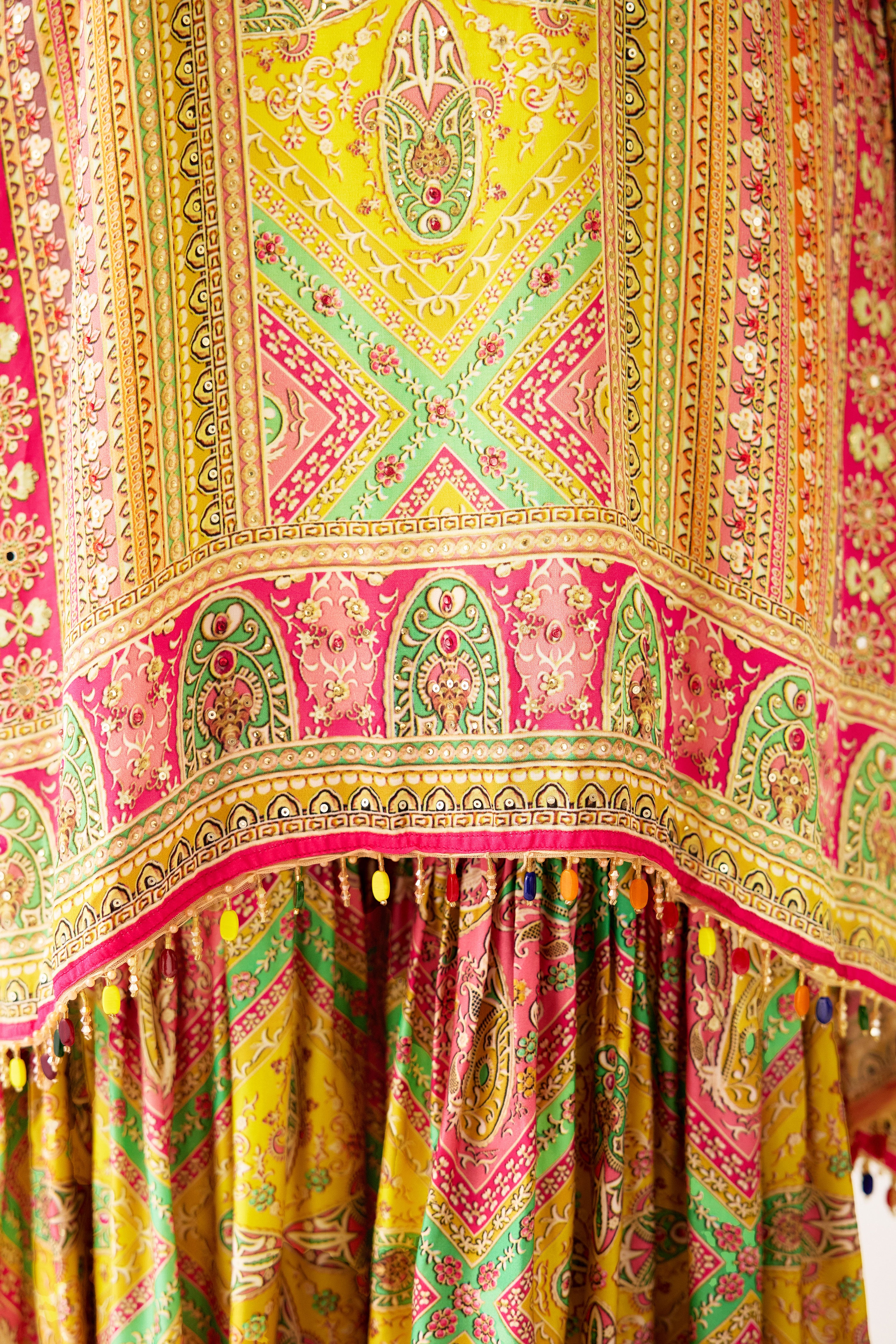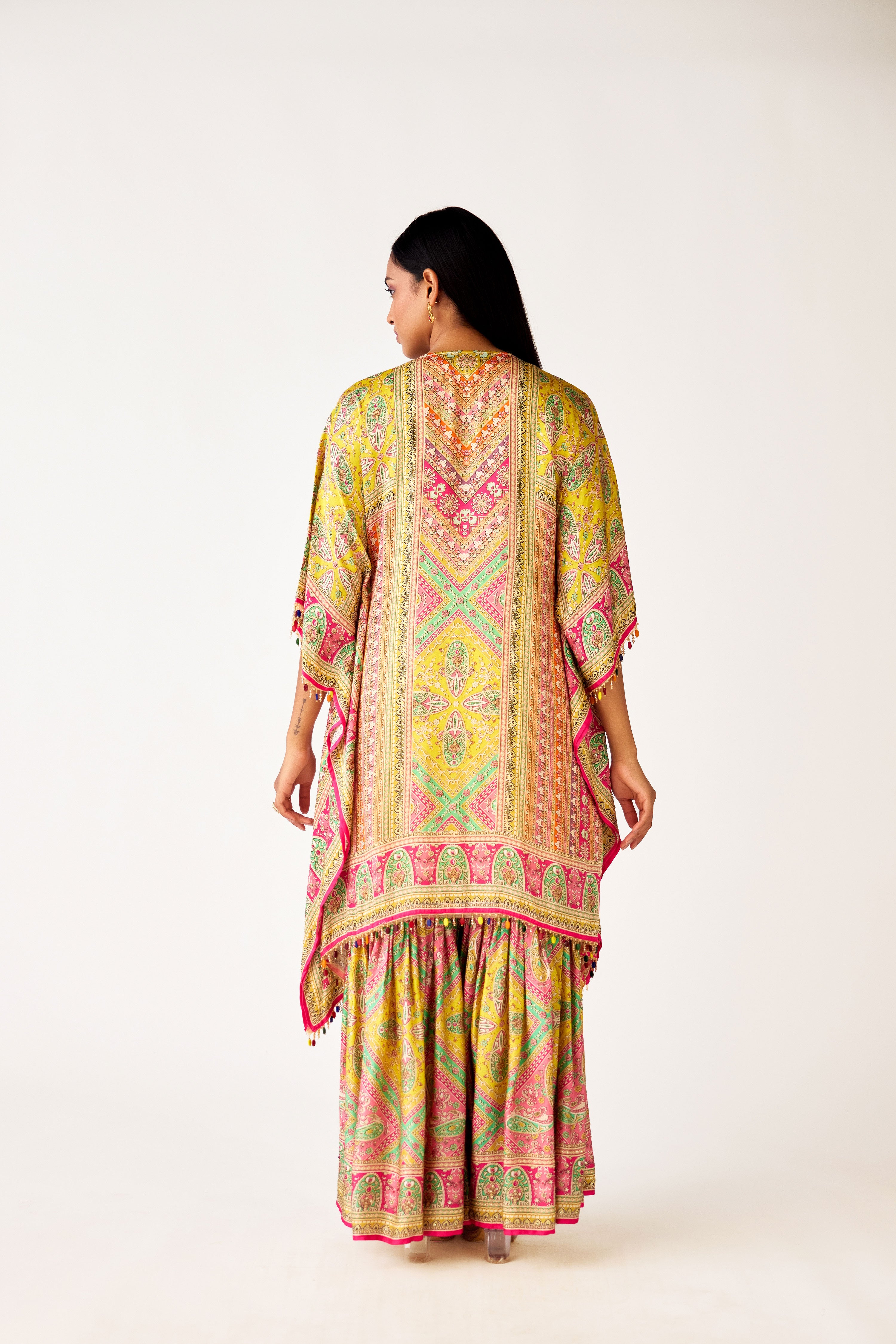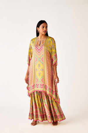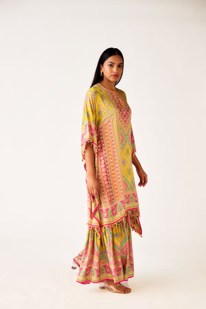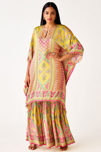 Stunning yellow printed modal satin kaftan set makes a perfect festive wear. Shop online from Pure Elegance.