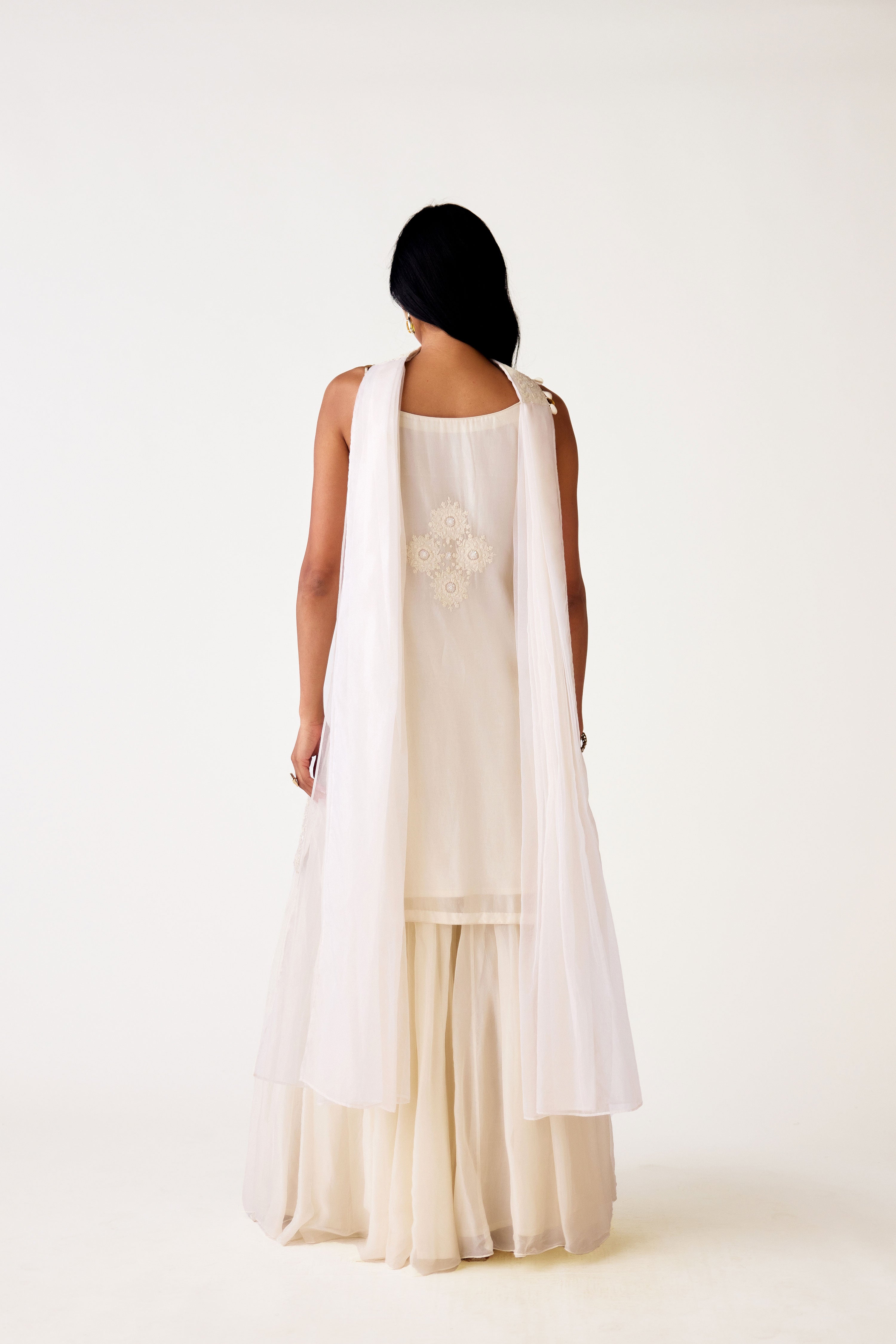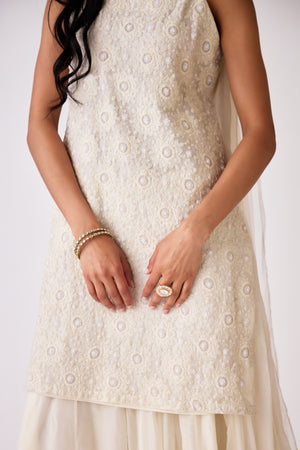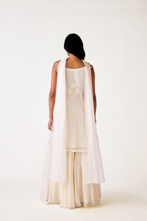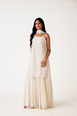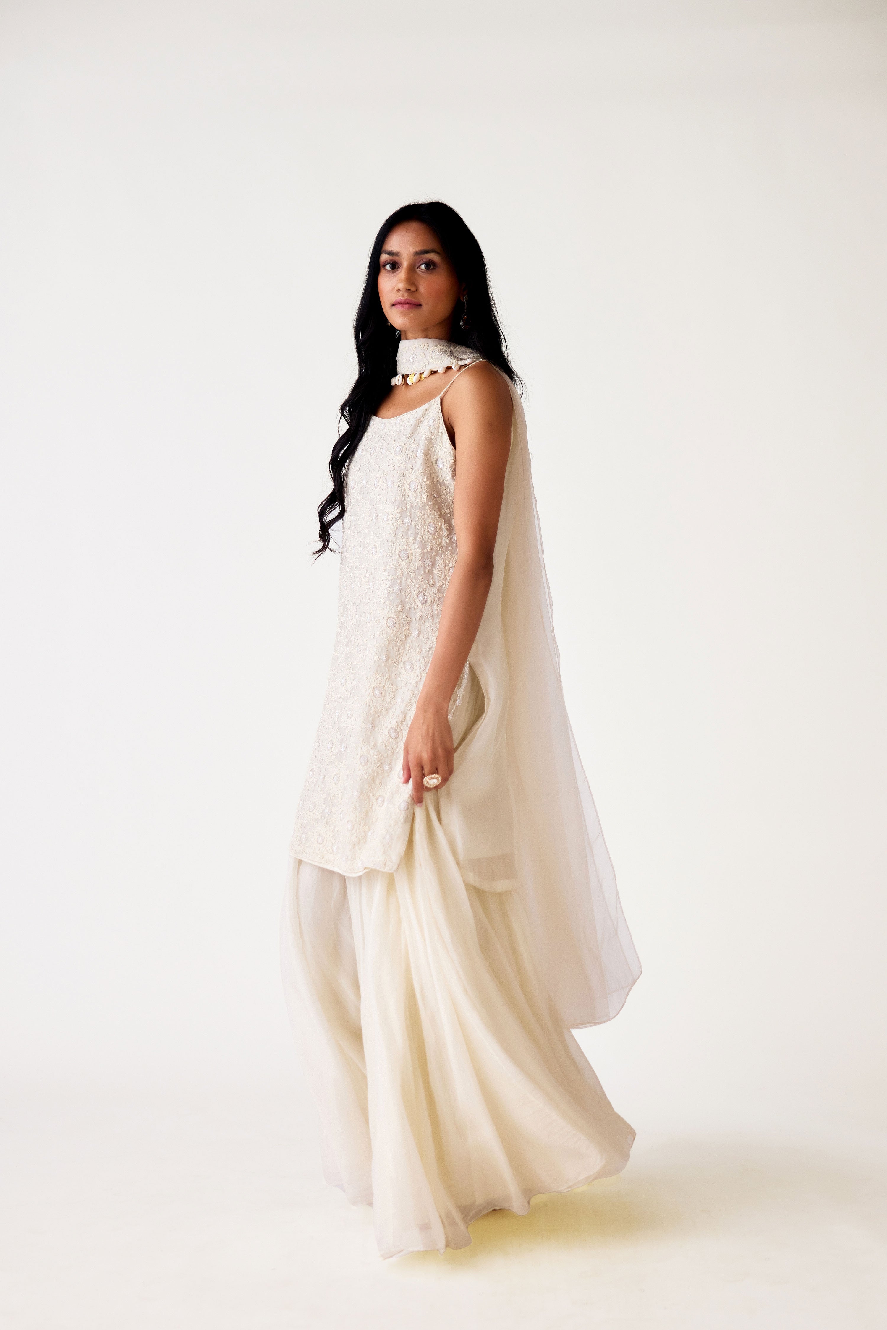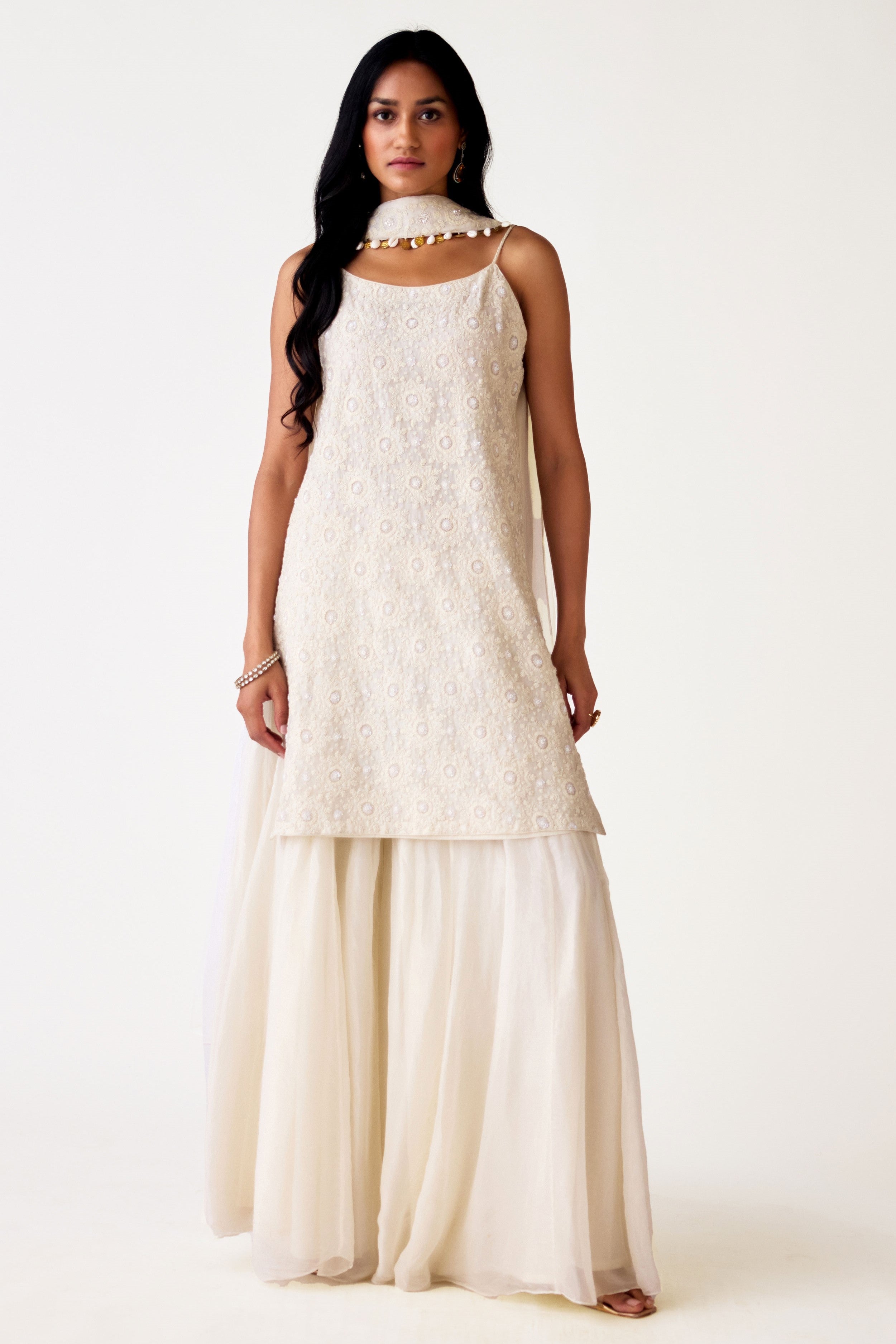 Stunning cream pearl and bead work organza sharara suit is a perfect festive wear. It comes with a matching dupatta. Shop online from Pure Elegance.