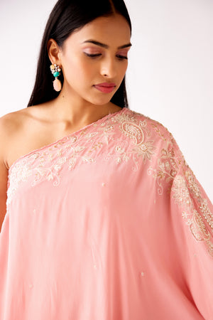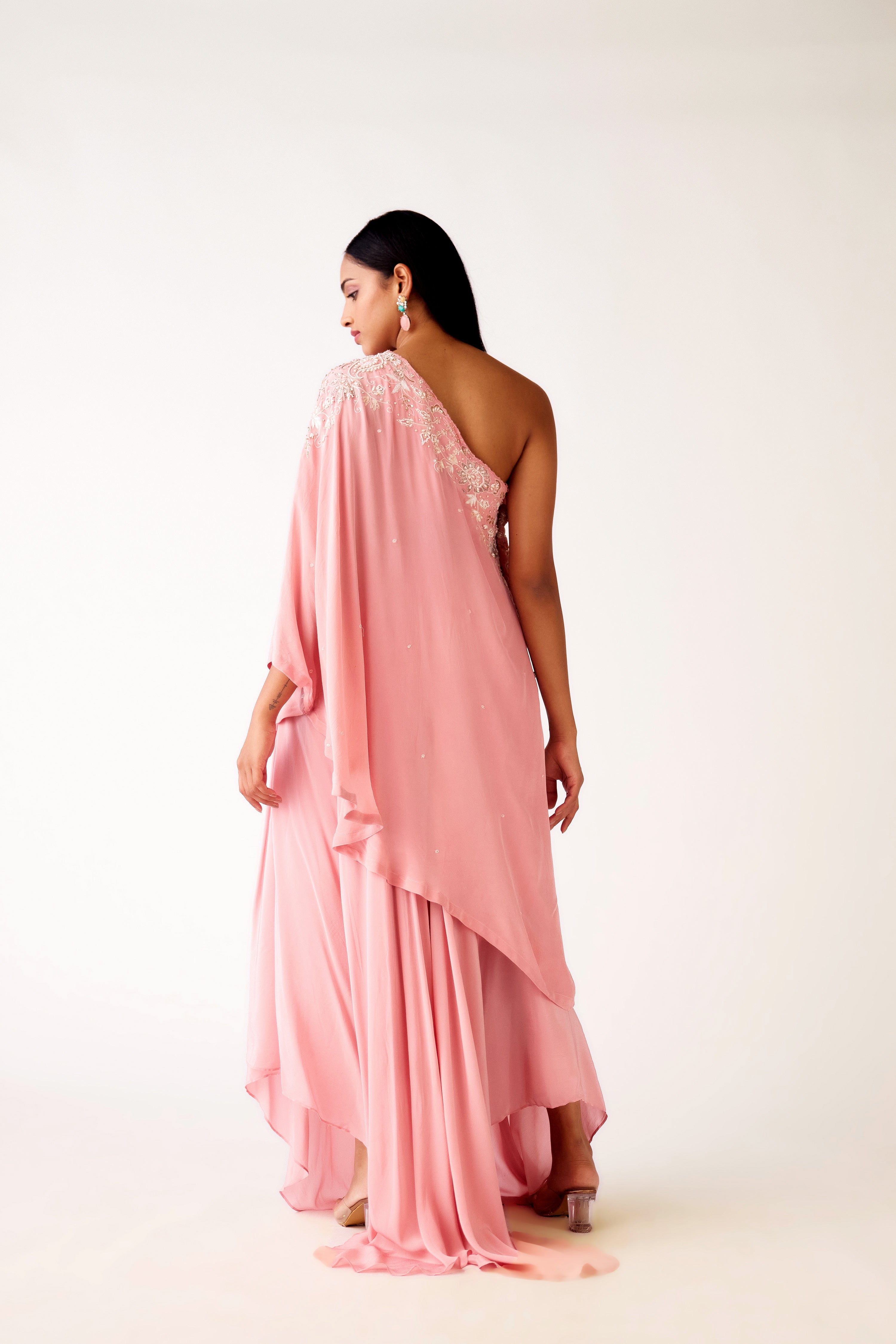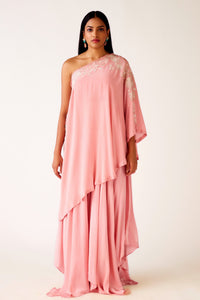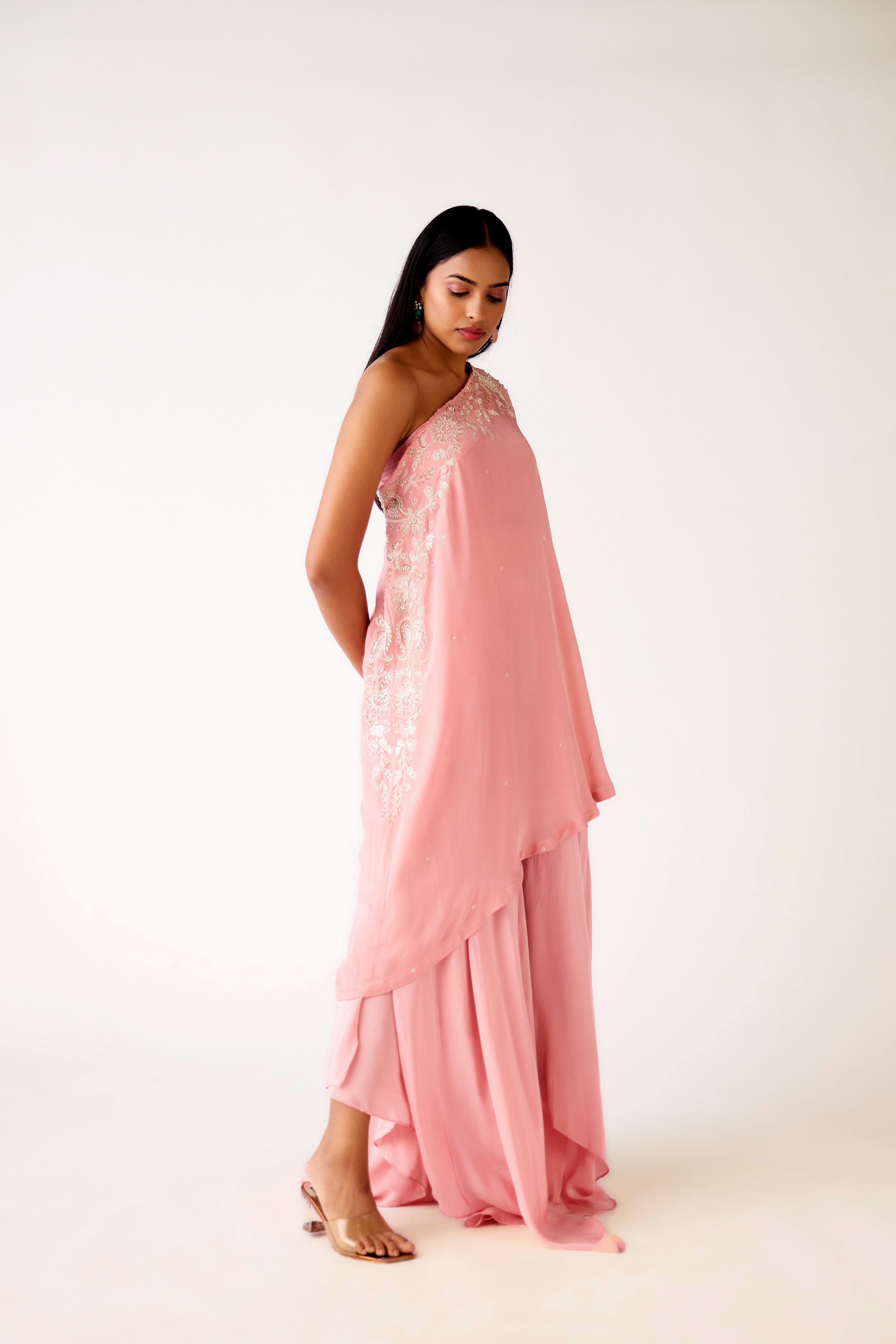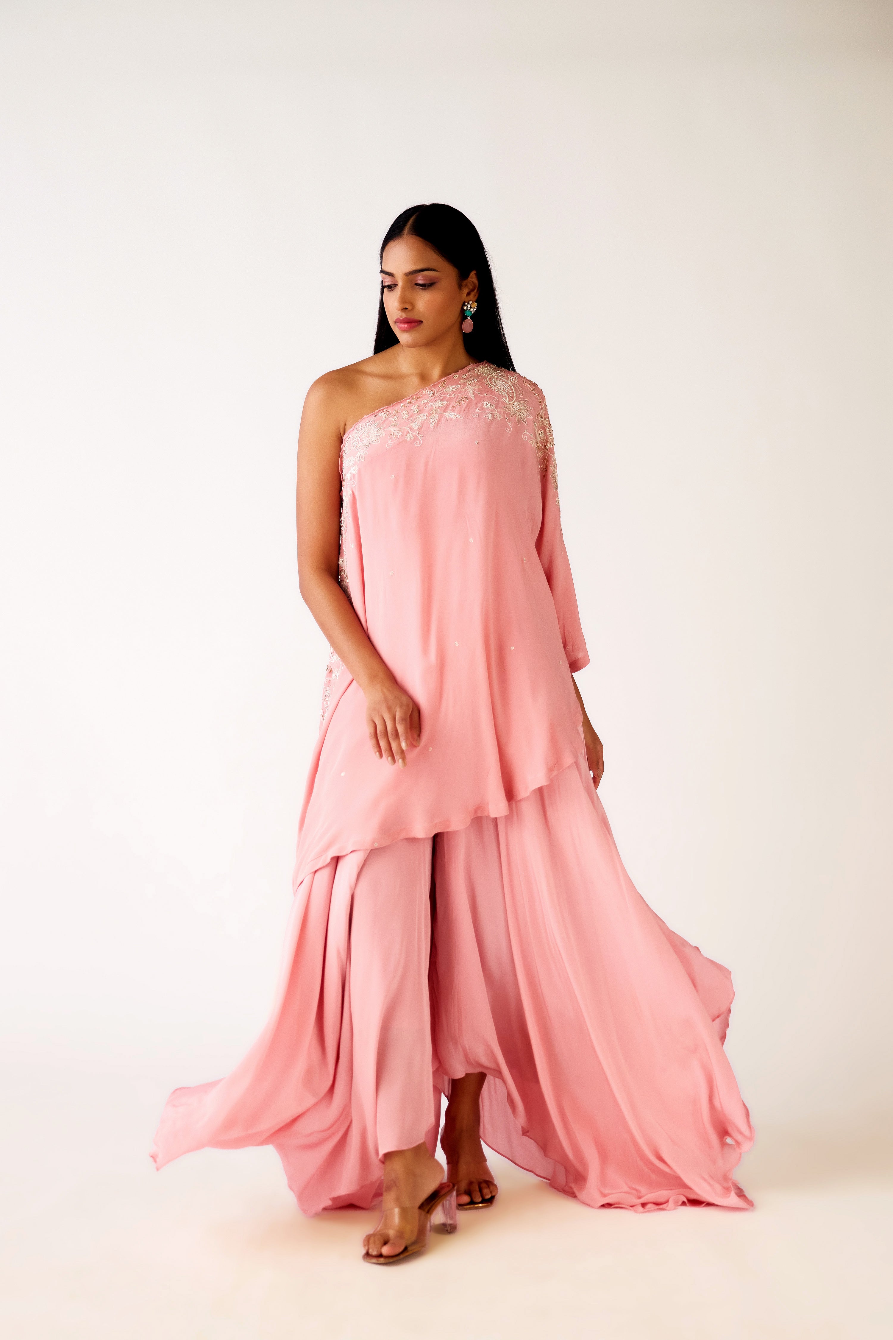 Stunning baby pink embroidered asymmetric georgette co-ord set is a stylish wear for special occasions. Shop online from Pure Elegance.
