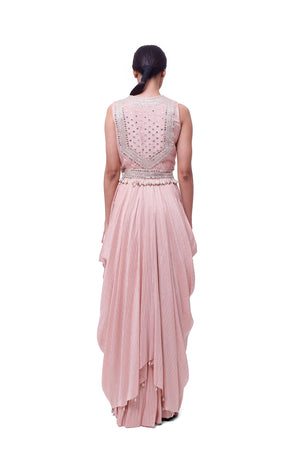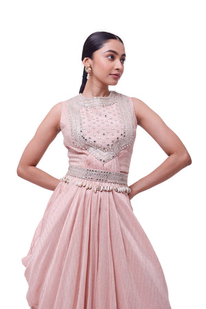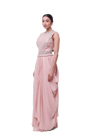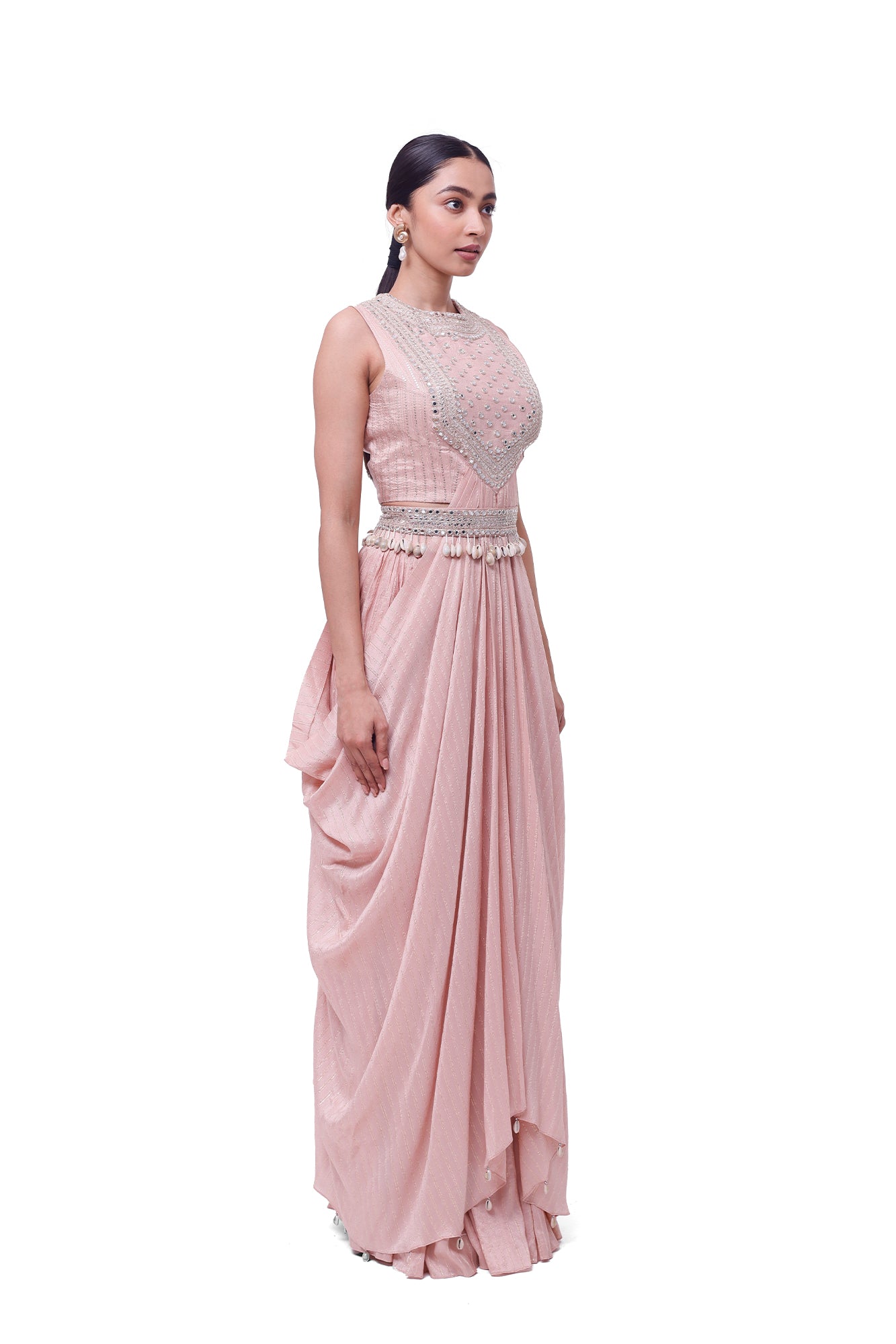 Stunning powder pink embroidered silk draped suit is a stylish wear for special occasions. Shop online from Pure Elegance.