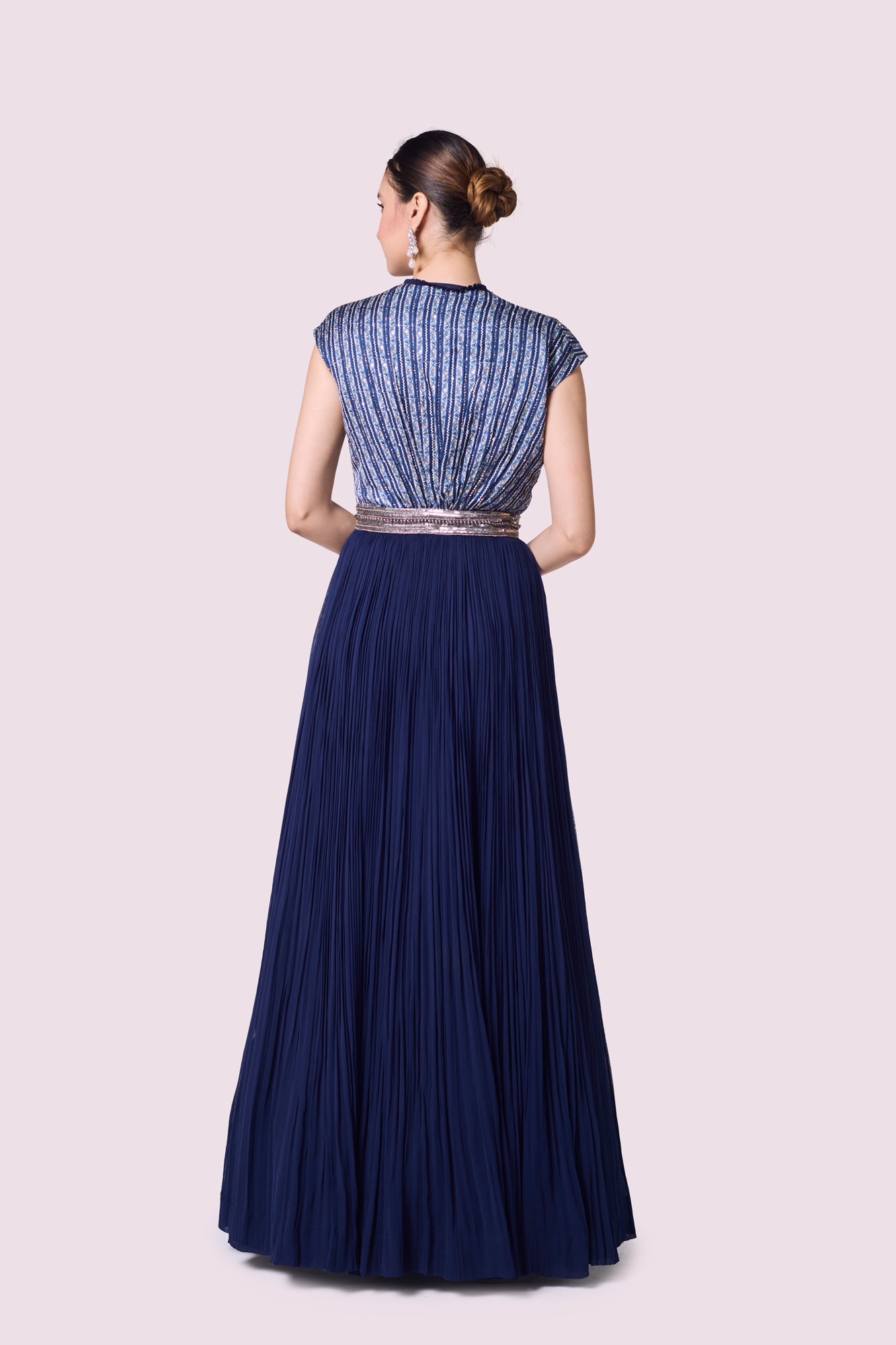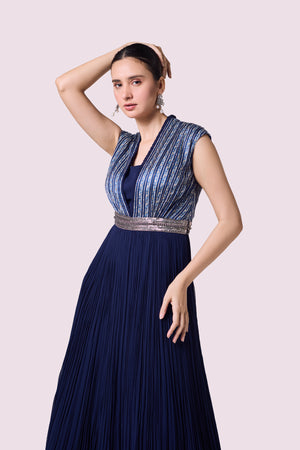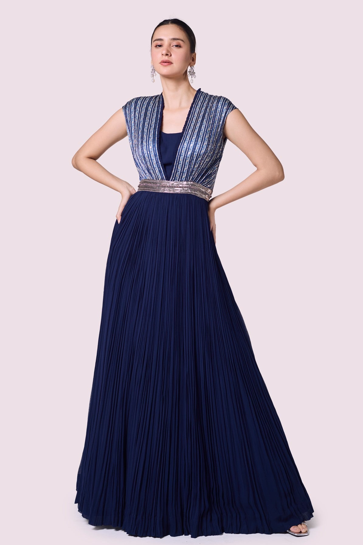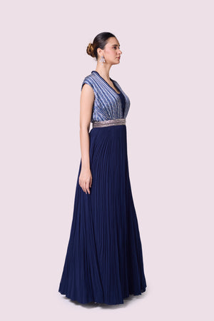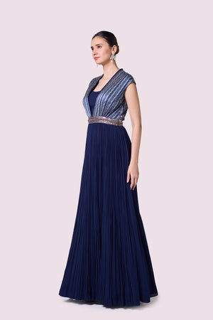Stunning navy blue georgette gown is a perfect choice for special occasions. It has a beautiful embellished body. Shop online from Pure Elegance.