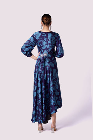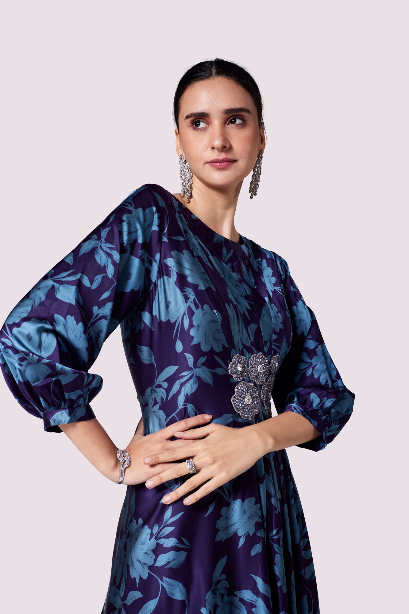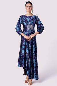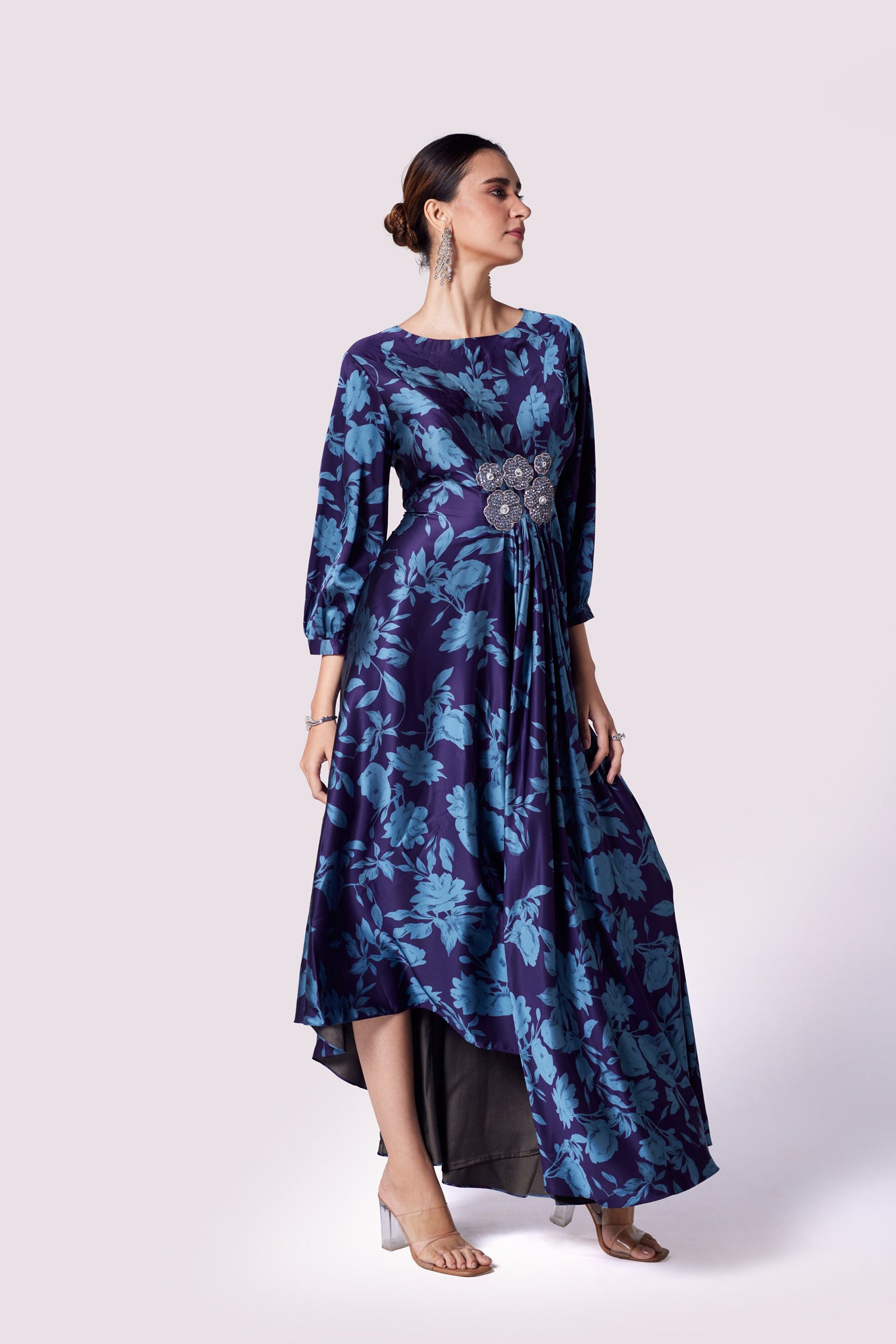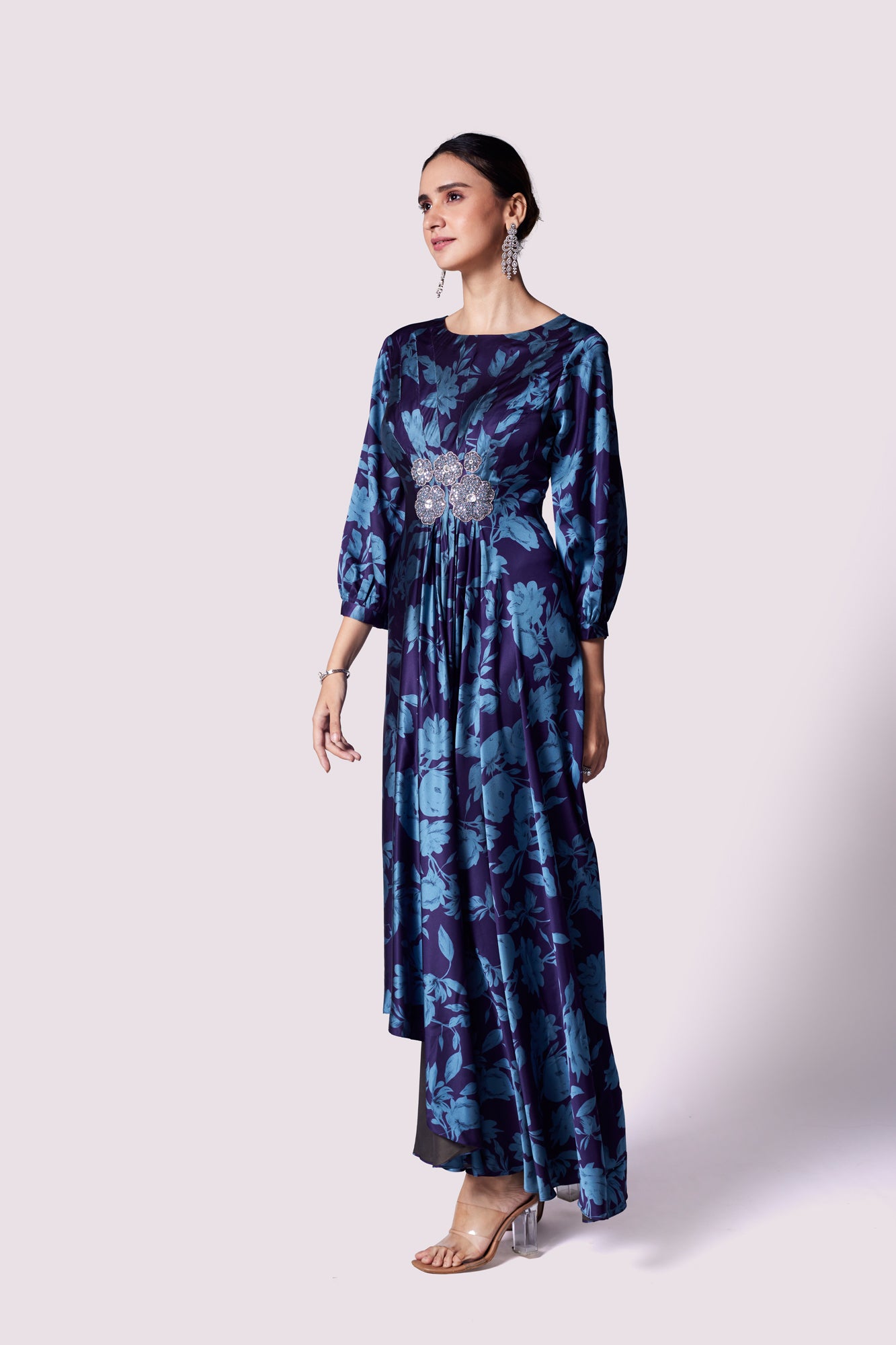 Stunning black co-ord set with grey and pink printed satin jacket is a perfect choice for special occasions. Shop online from Pure Elegance.