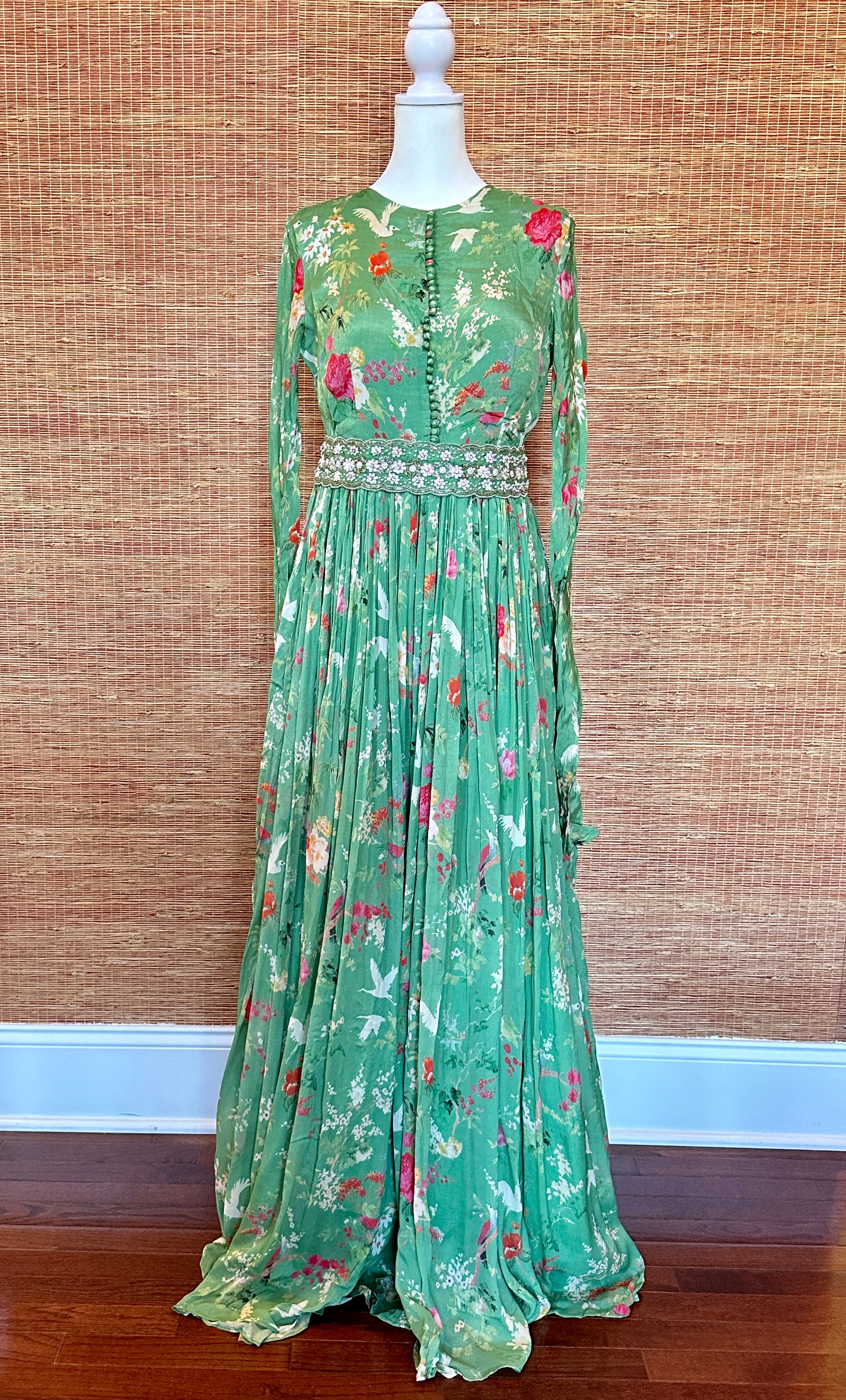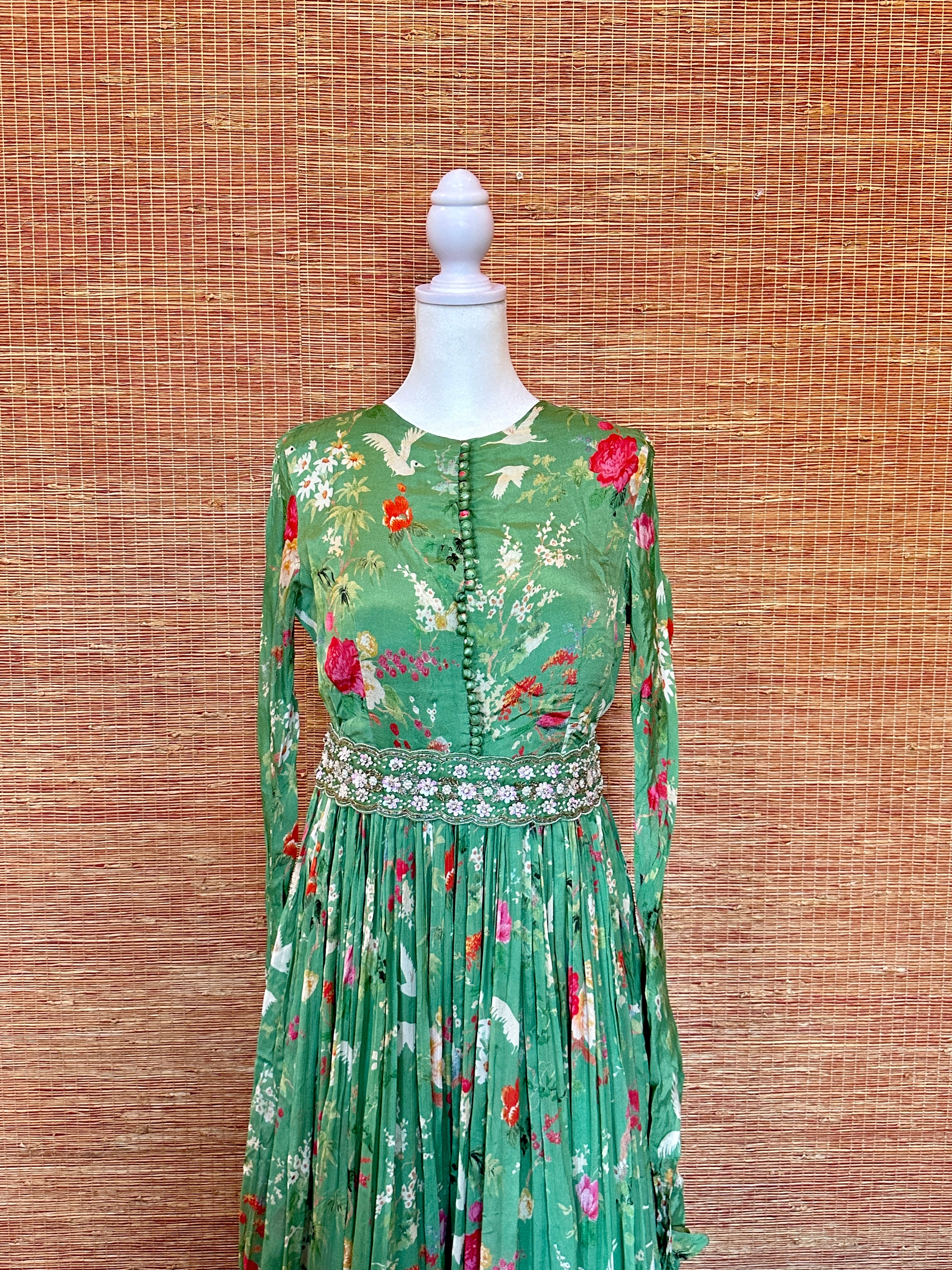 Beautiful sea green floral georgette dress with belt is a perfect choice for parties and festive occasions.