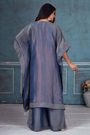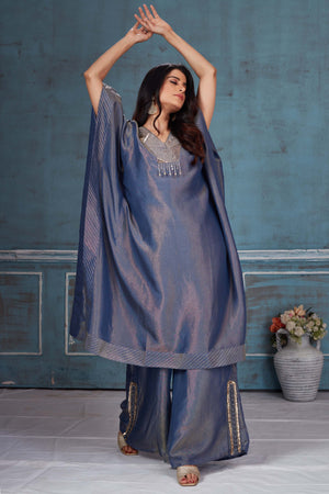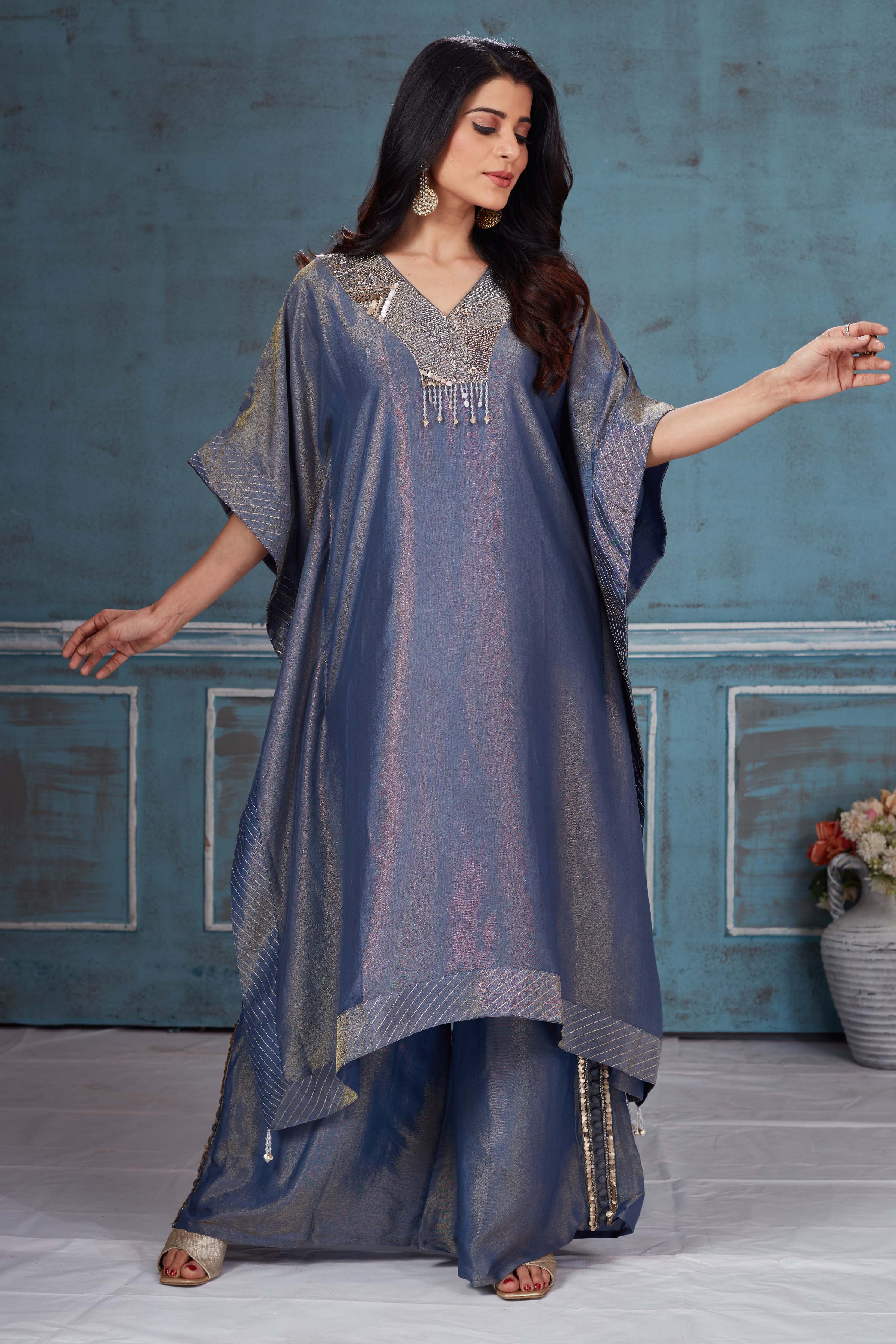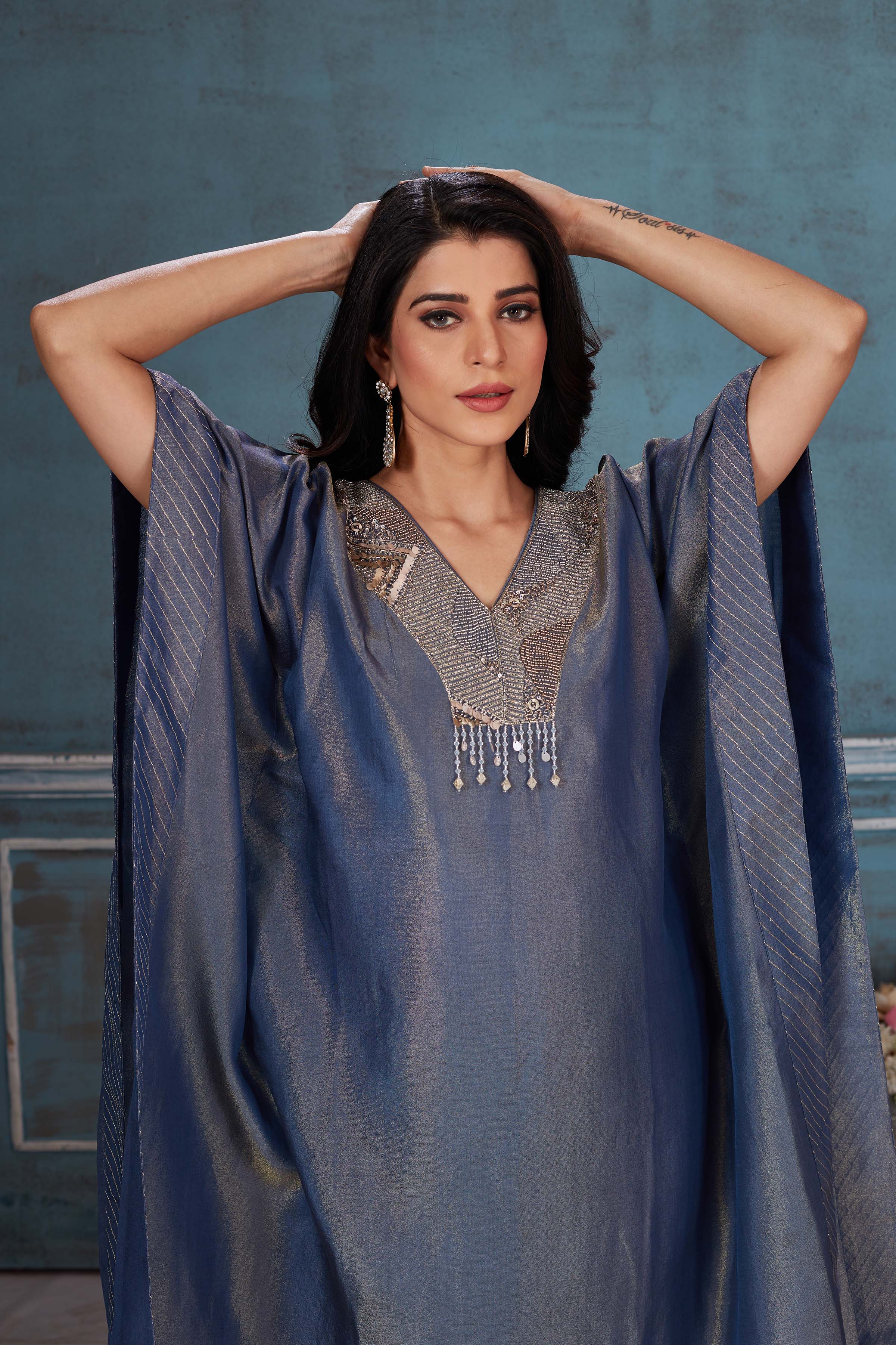 Turn heads at weddings and special occasions in this beautiful blue embroidered tissue georgette kaftan pant set.