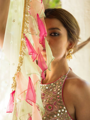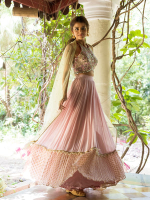 Here's is a perfect bridesmaids lehenga for all fashion girls! This beautiful light pink mirror work georgette lehenga comes with a frill dupatta and halter blouse.