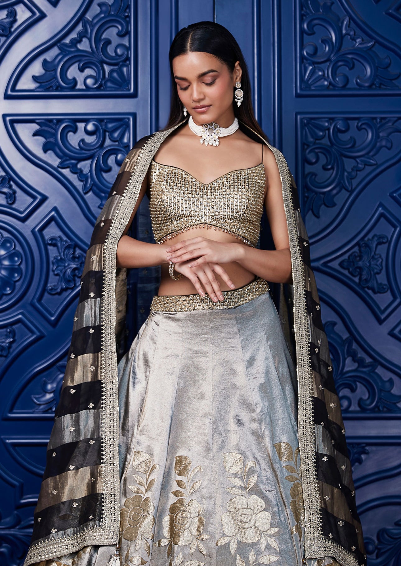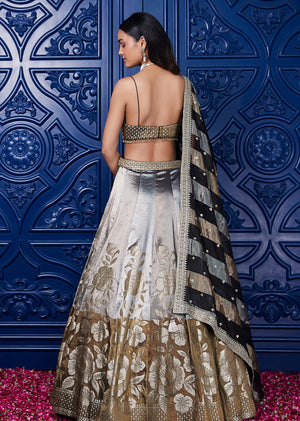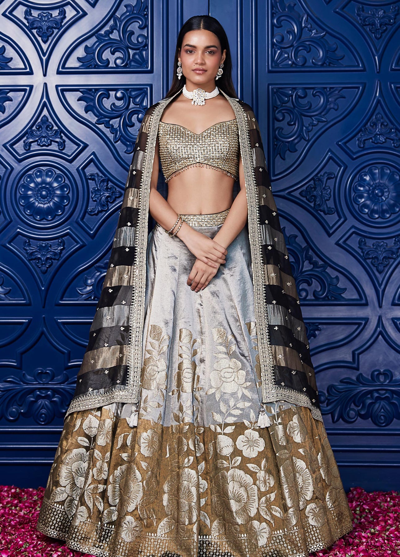 Give major fashion goals at weddings in this beautiful brown and grey Banarasi embroidered lehenga with dupatta.