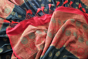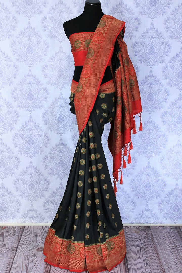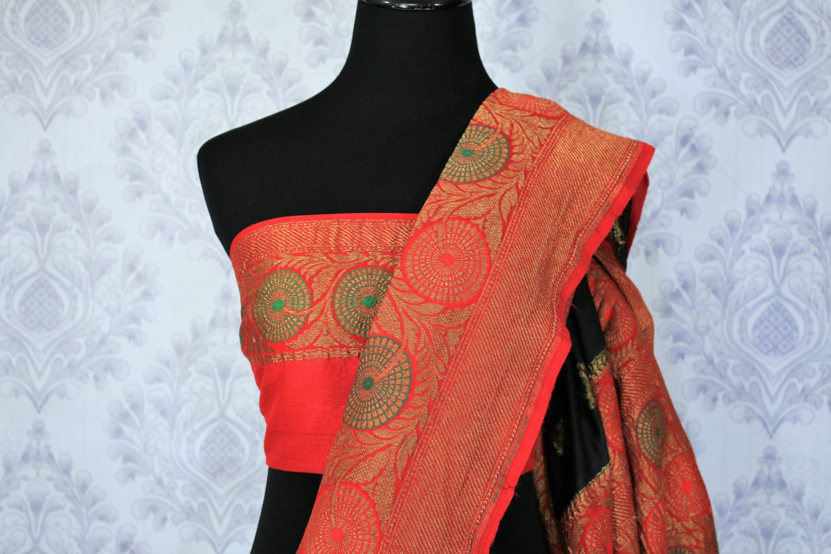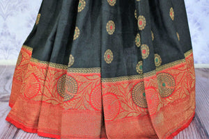 A classic black and red silk saree is every woman's dream ensemble. The designer muga banarsi silk saree with buta work and zari border is totally in vogue. Style this gorgeous sari with a designer red embroidered blouse and get ready to be poured with compliments galore. Shop designer silk sarees online or visit Pure Elegance store in USA.