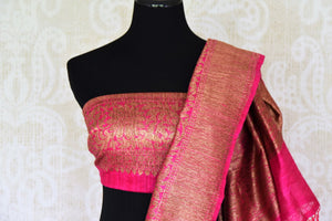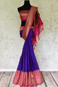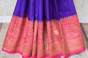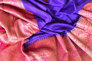 Grace the special occasion like festivity or wedding in our stunning blue matka banarsi silk sari. It comes with a gorgeous pink zari border and a contrasting pink zari woven blouse to complement the ensemble. Shop handcrafted silk sari, linen saree, chiffon sari online or visit Pure Elegance store, USA.