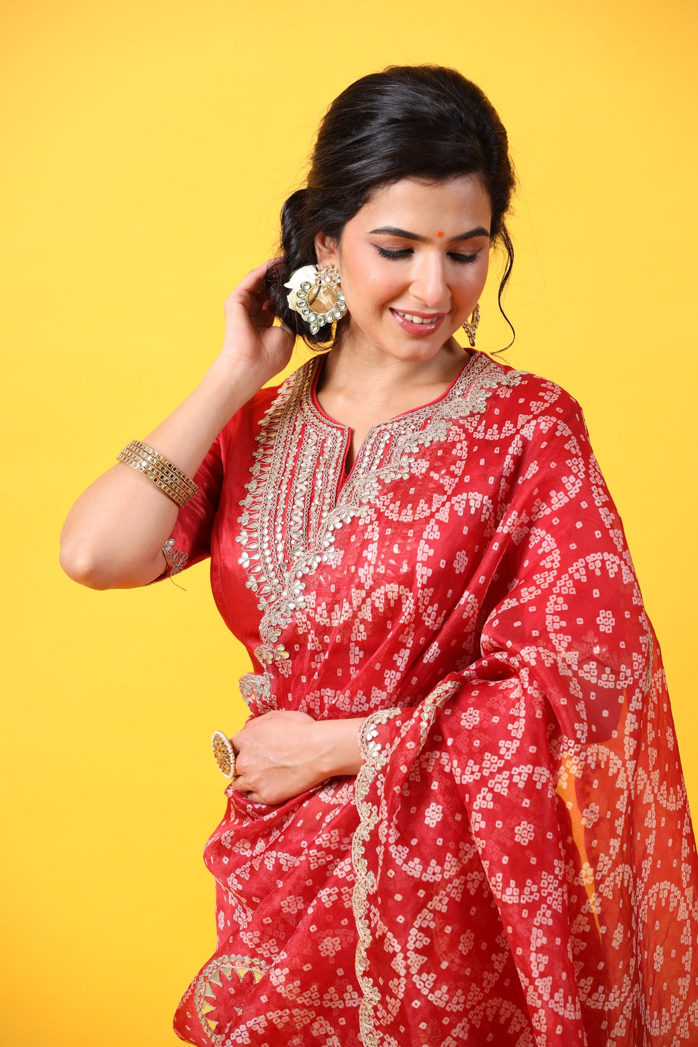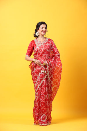 Ravishing cream embroidered georgette Banarasi saree for weddings! The saree s embroidered with a red zari border and pallu. It comes with an embroidered red Banarasi blouse. Shop online from Pure Elegance.