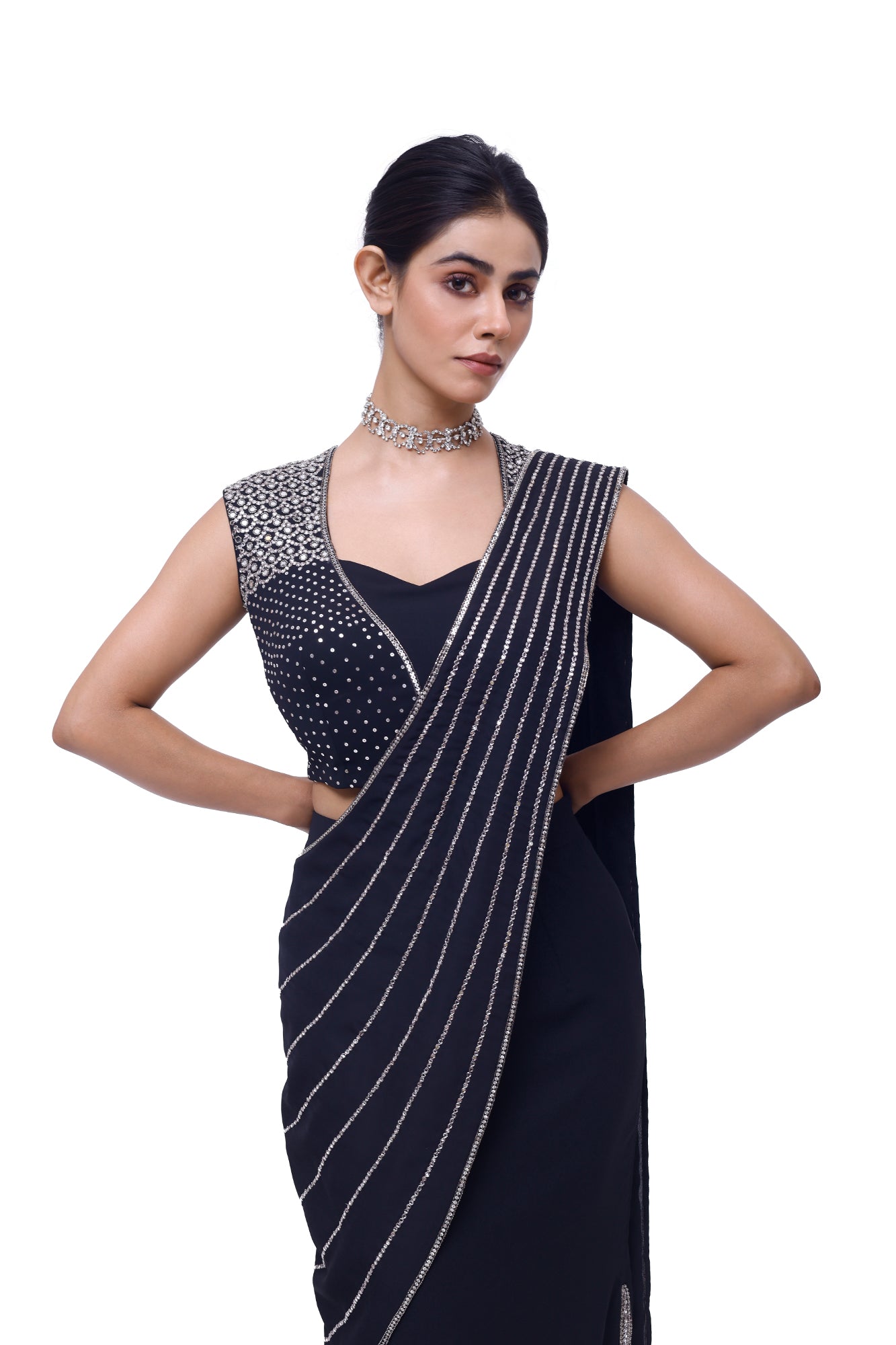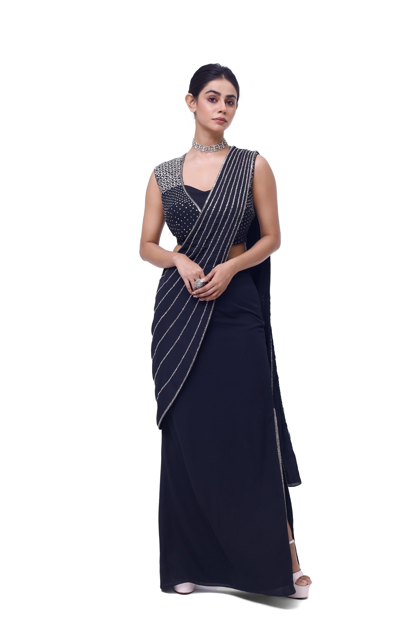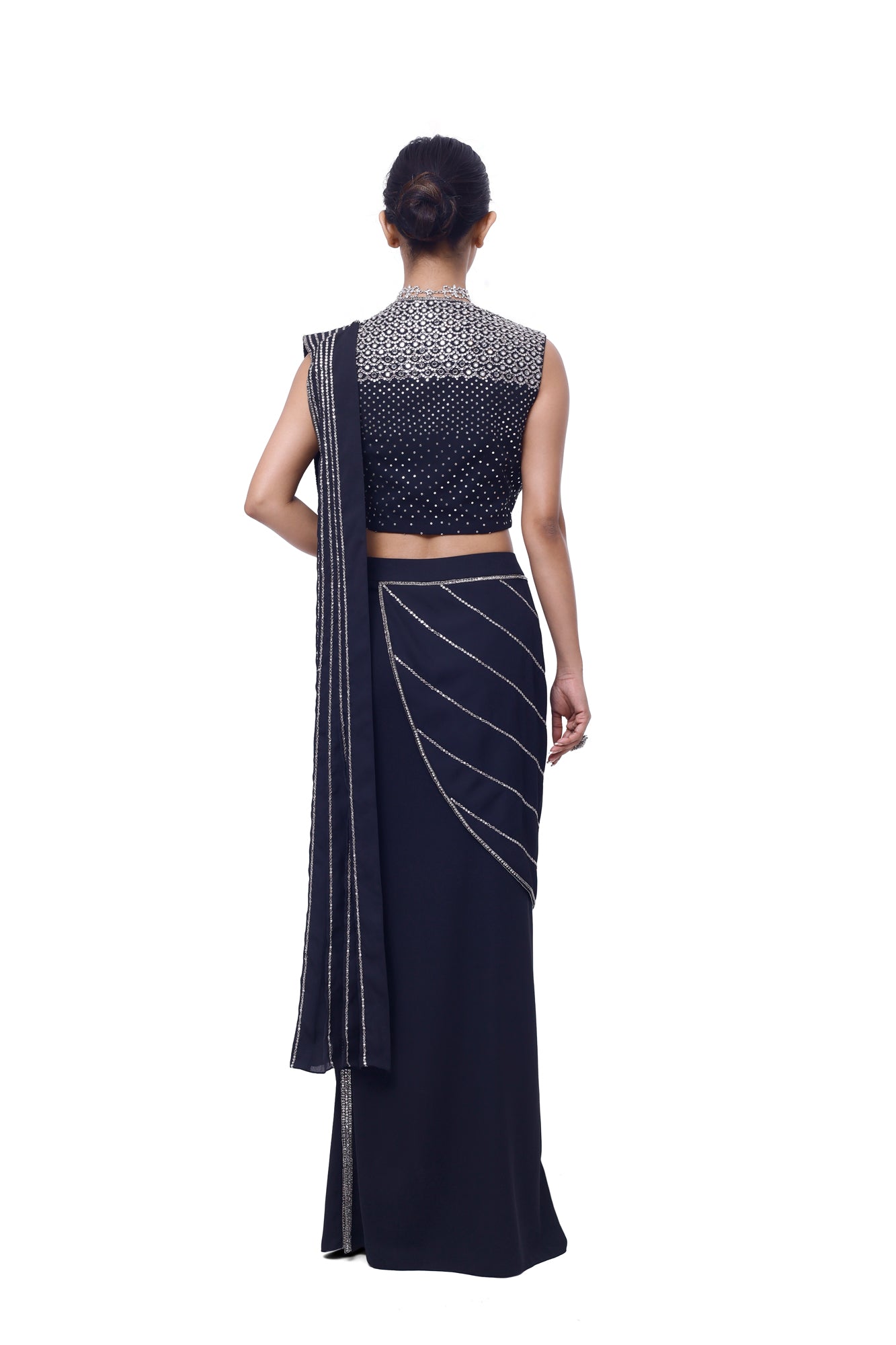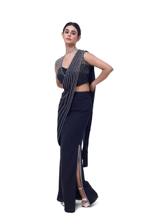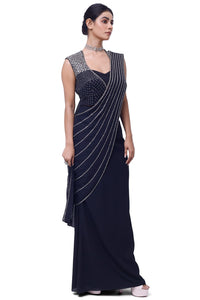 Stylish navy blue side slit draped georgette saree is sure to grab eye balls at parties and special occasions! Shop designer saris online in the USA from Pure Elegance.
