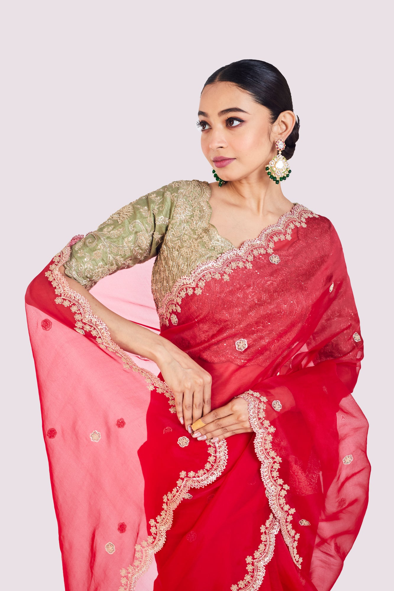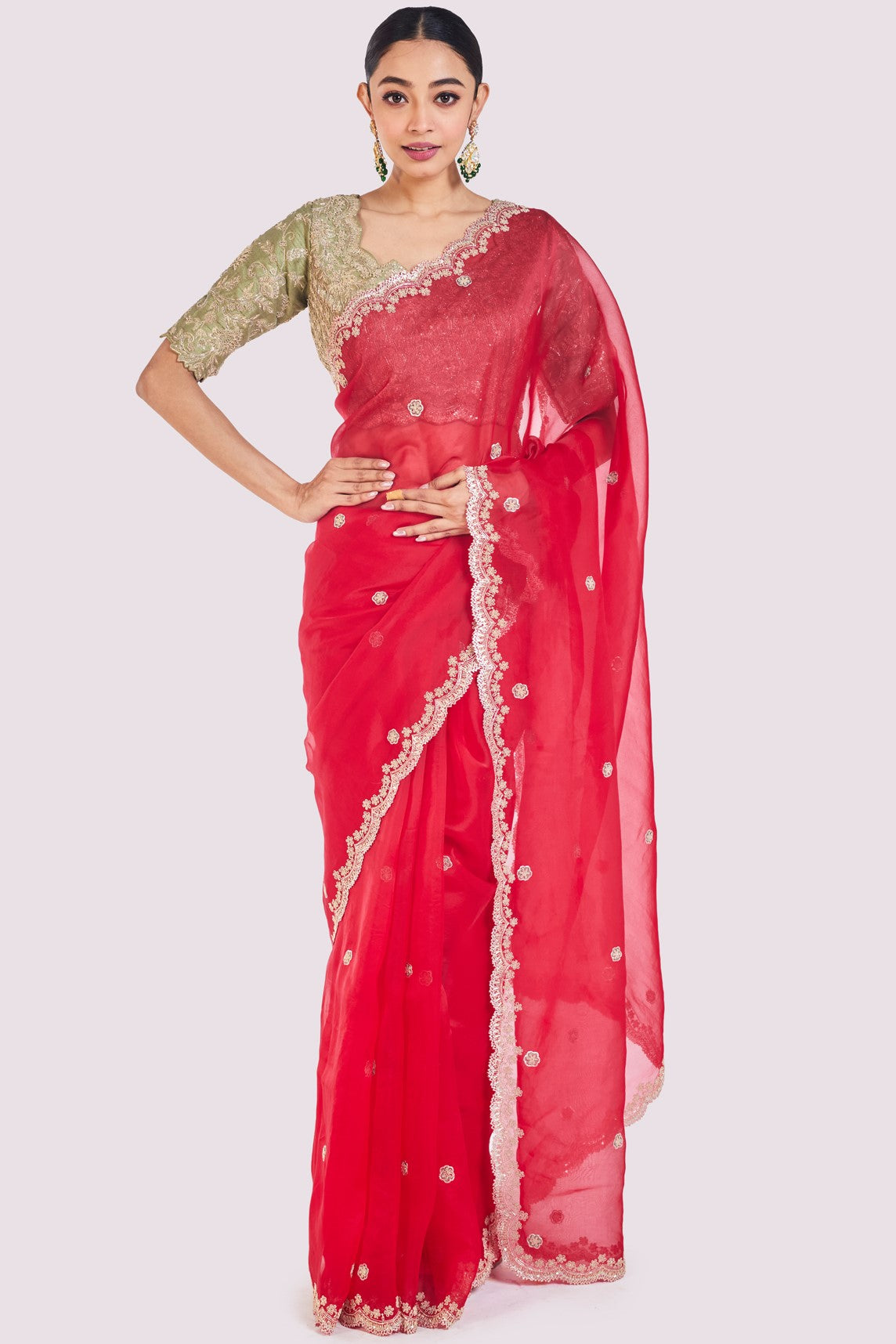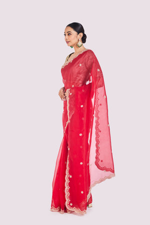 Beautiful red embroidered organza saree is sure to grab eye balls at weddings and special occasions! It comes with a green embroidered raw silk blouse. Shop designer saris online in the USA from Pure Elegance.
