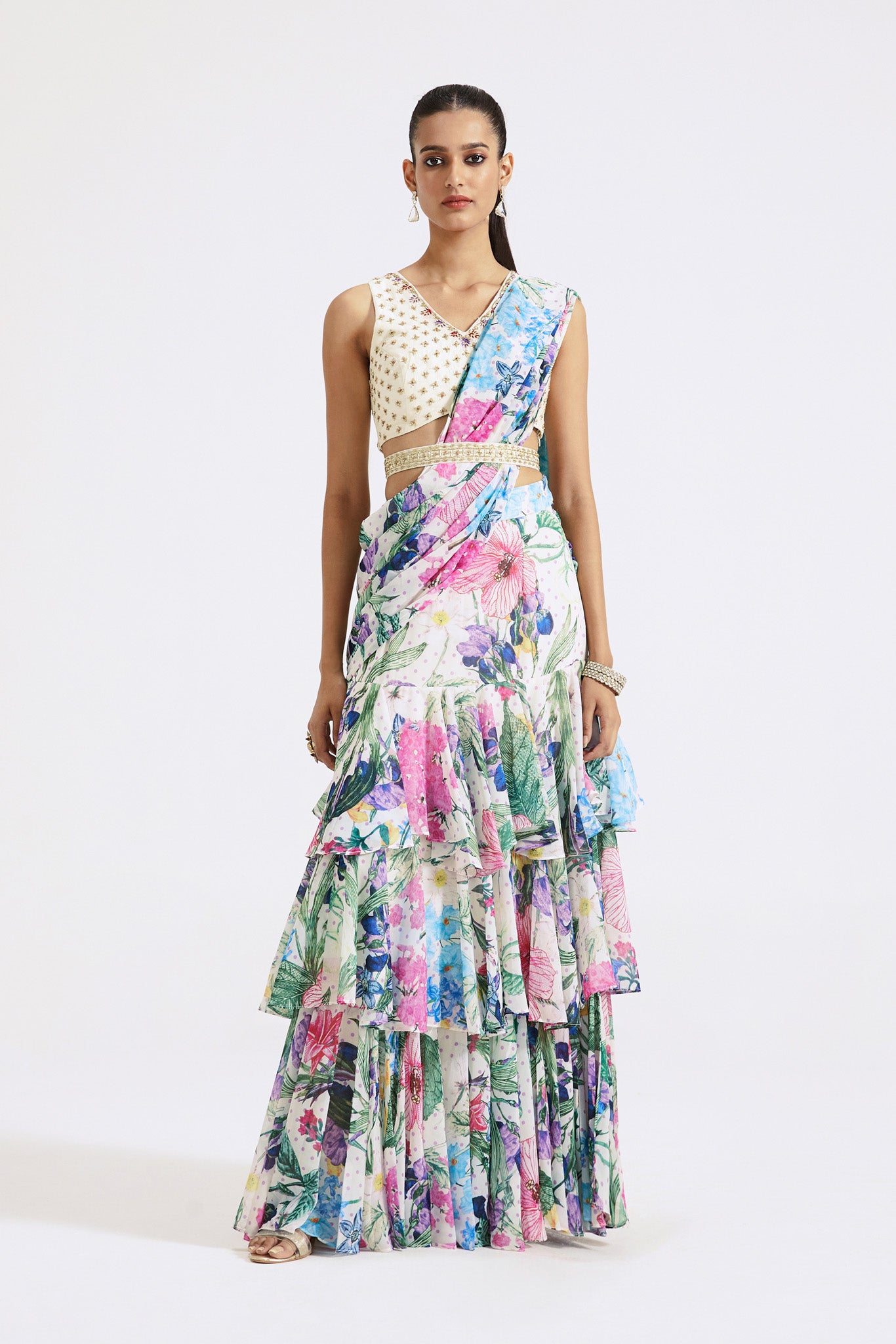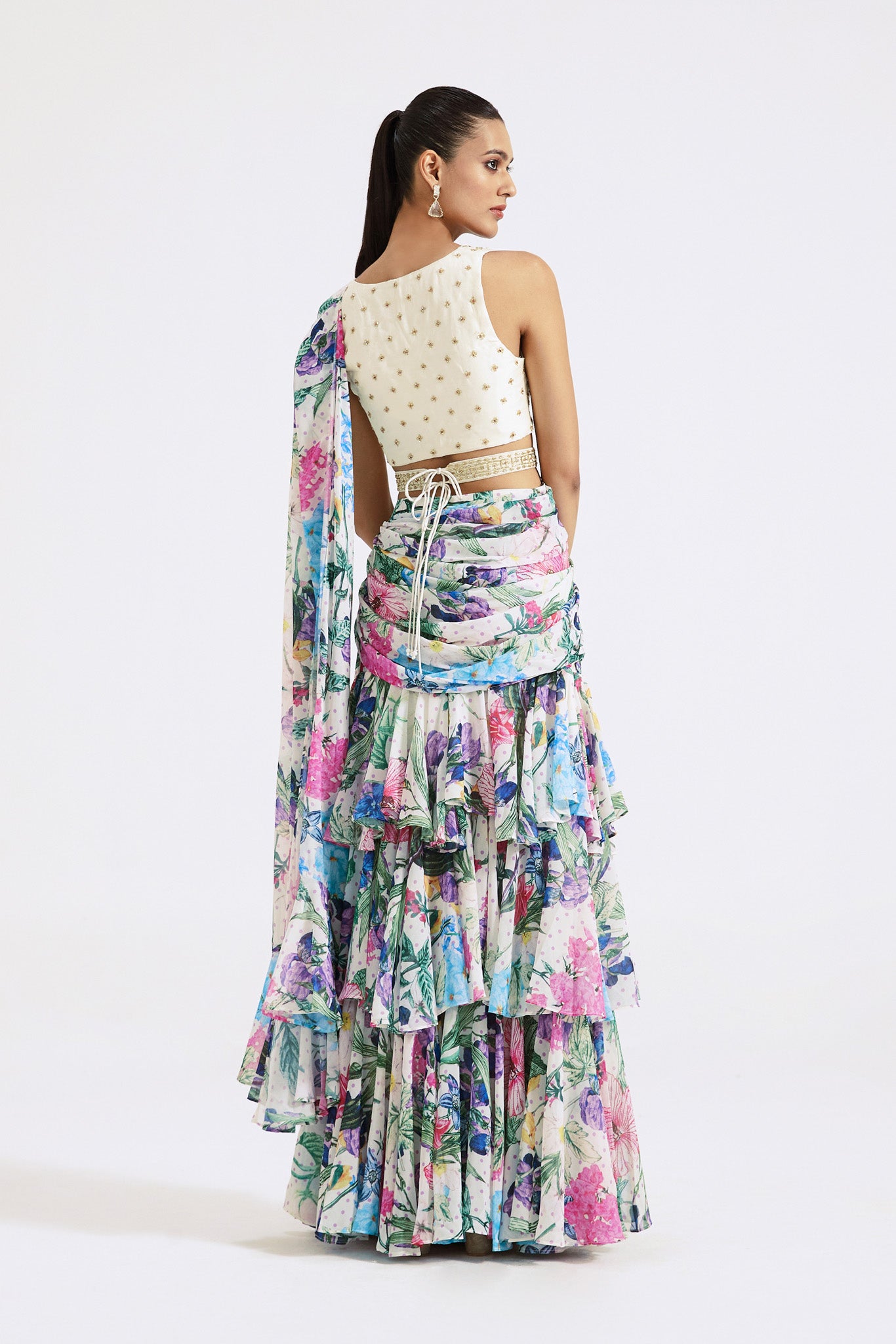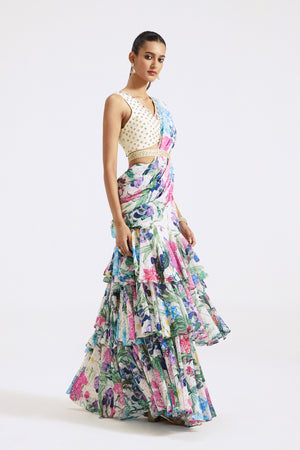 Stylish ivory floral print georgette pre-draped saree is sure to grab eye balls at weddings and special occasions! It comes with a saree blouse and belt. Shop designer saris online in the USA from Pure Elegance.