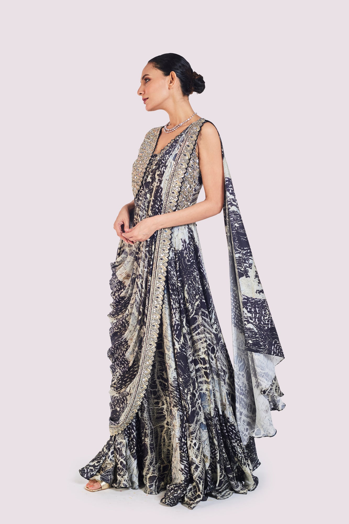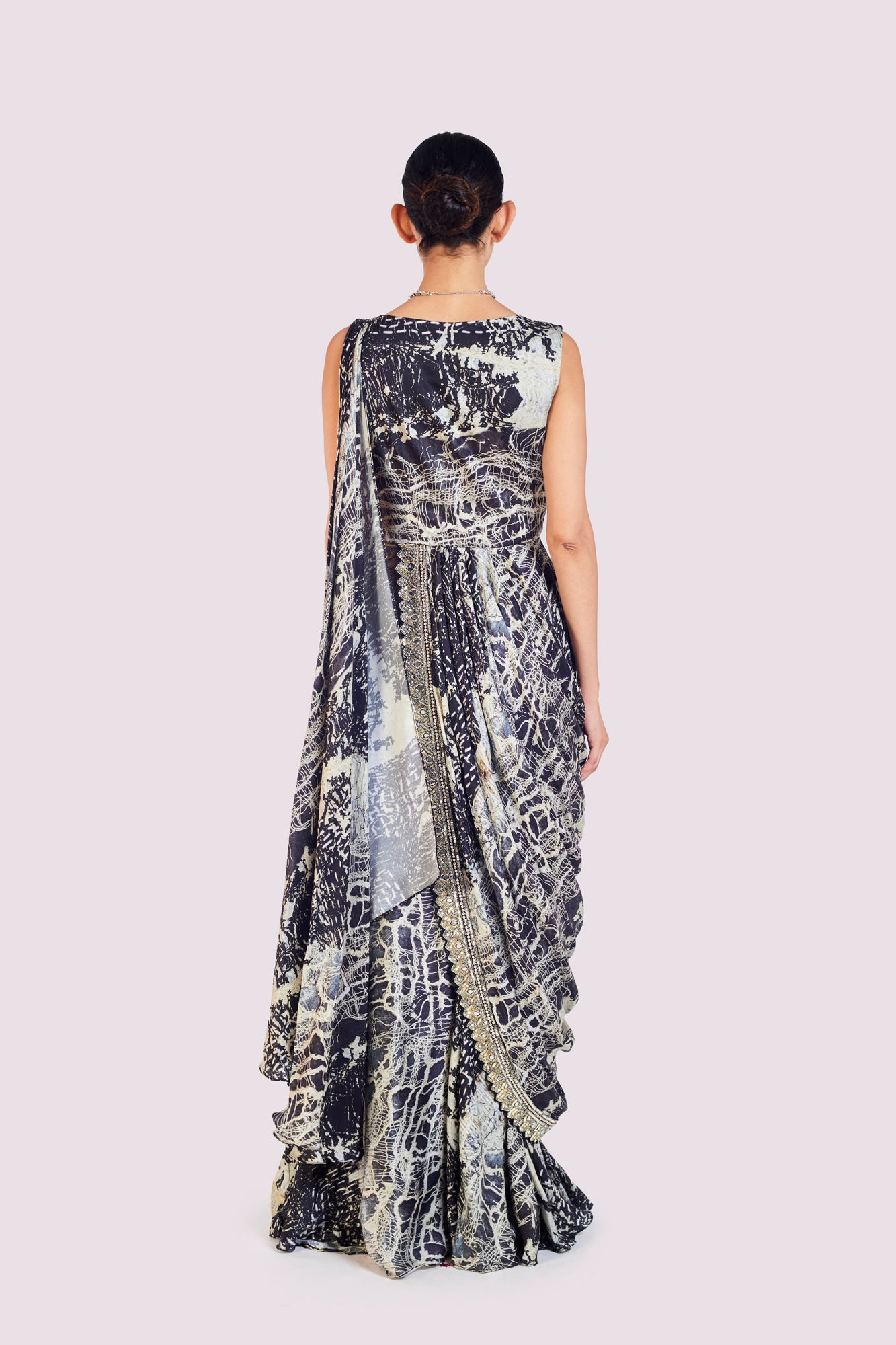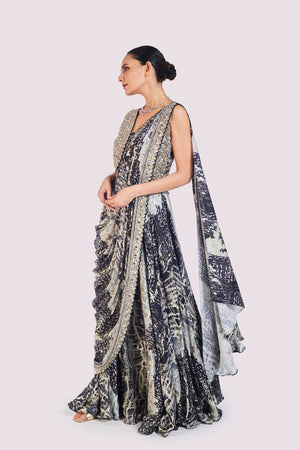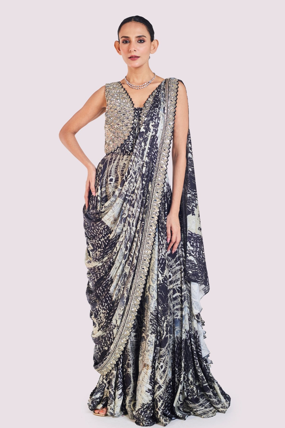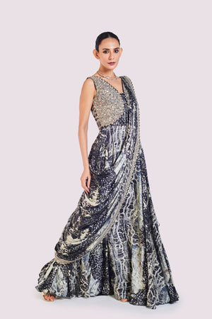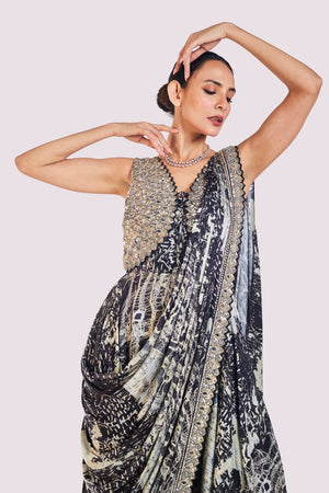 Beautiful black embellished abstract print pre-stitched satin saree is a perfect choice for a wedding guest look! It comes with an embroidered blouse. Shop designer saris online in the USA from Pure Elegance.