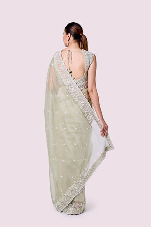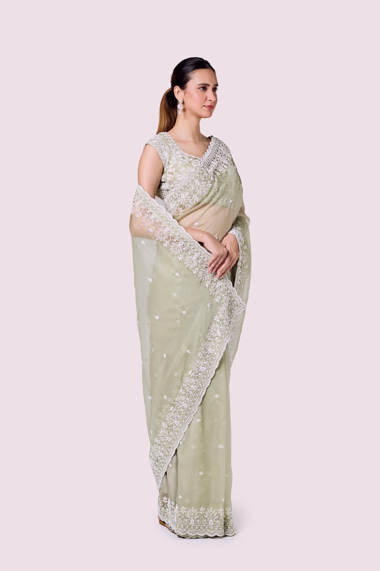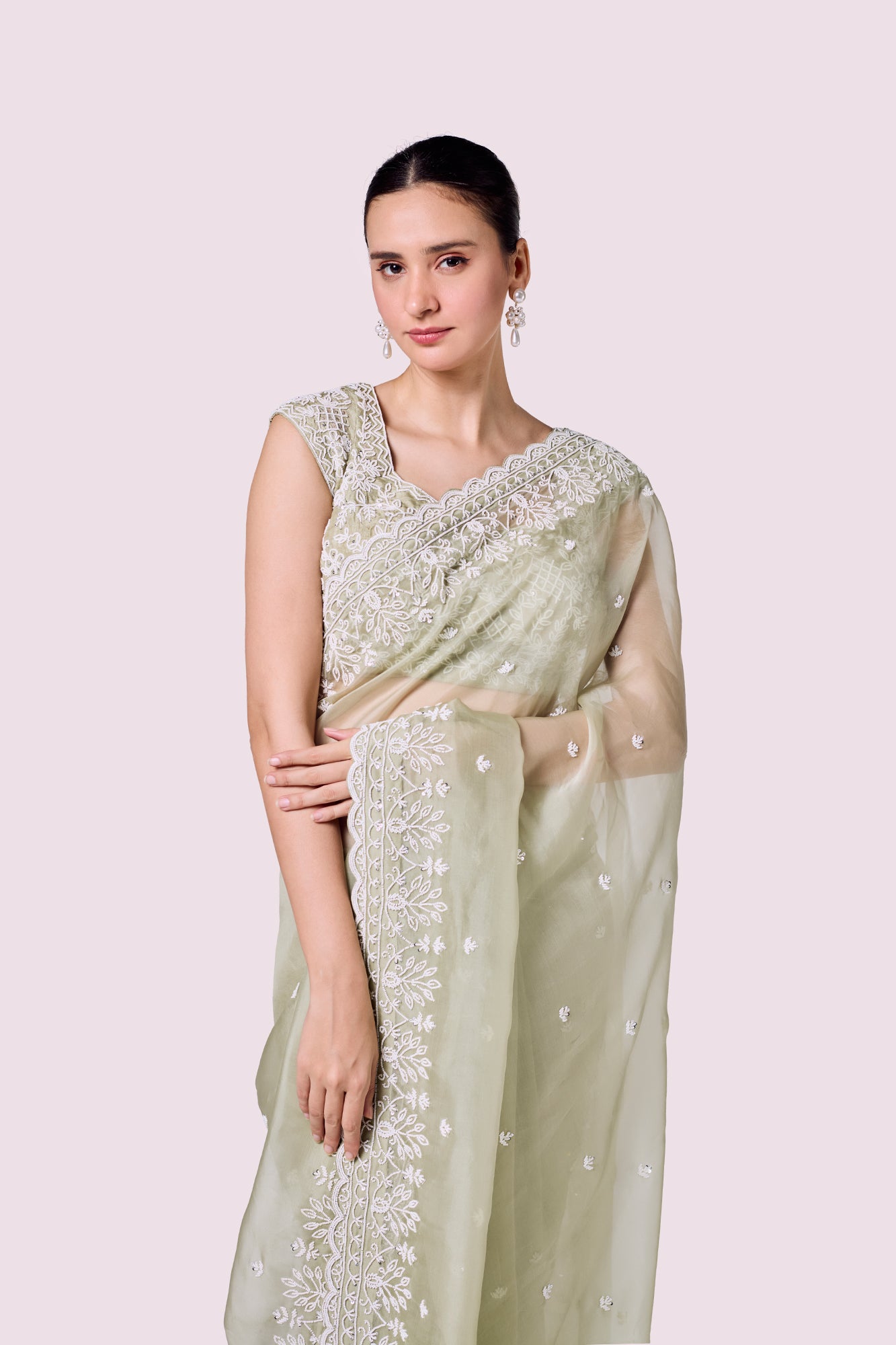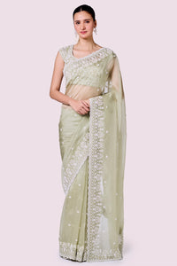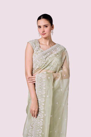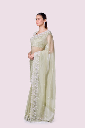 Beautiful pista green organza saree with heavy embroidered border is a perfect choice for a wedding guest look! It comes with an embroidered designer blouse. Shop designer saris online in the USA from Pure Elegance.