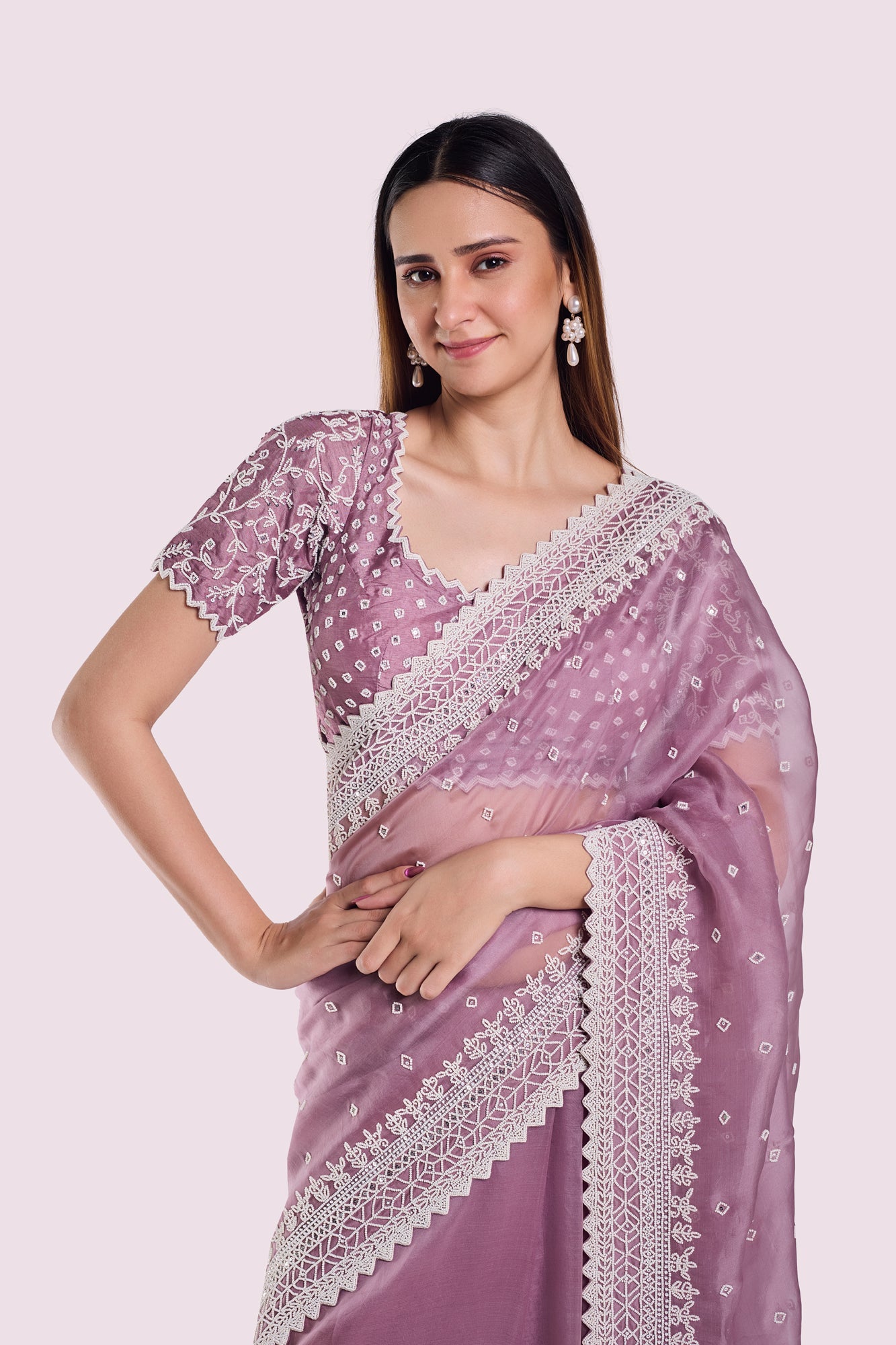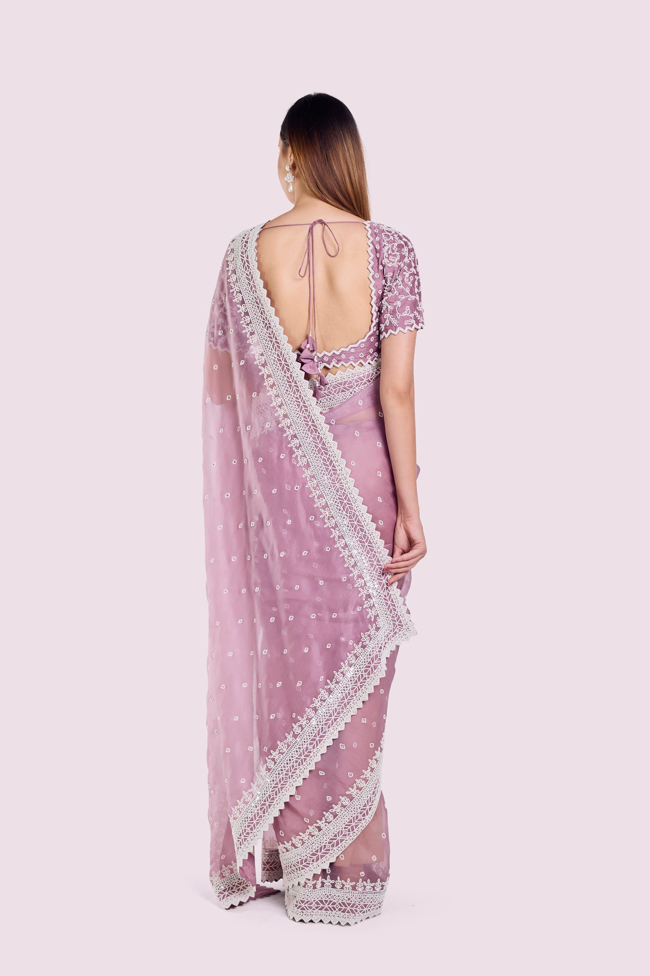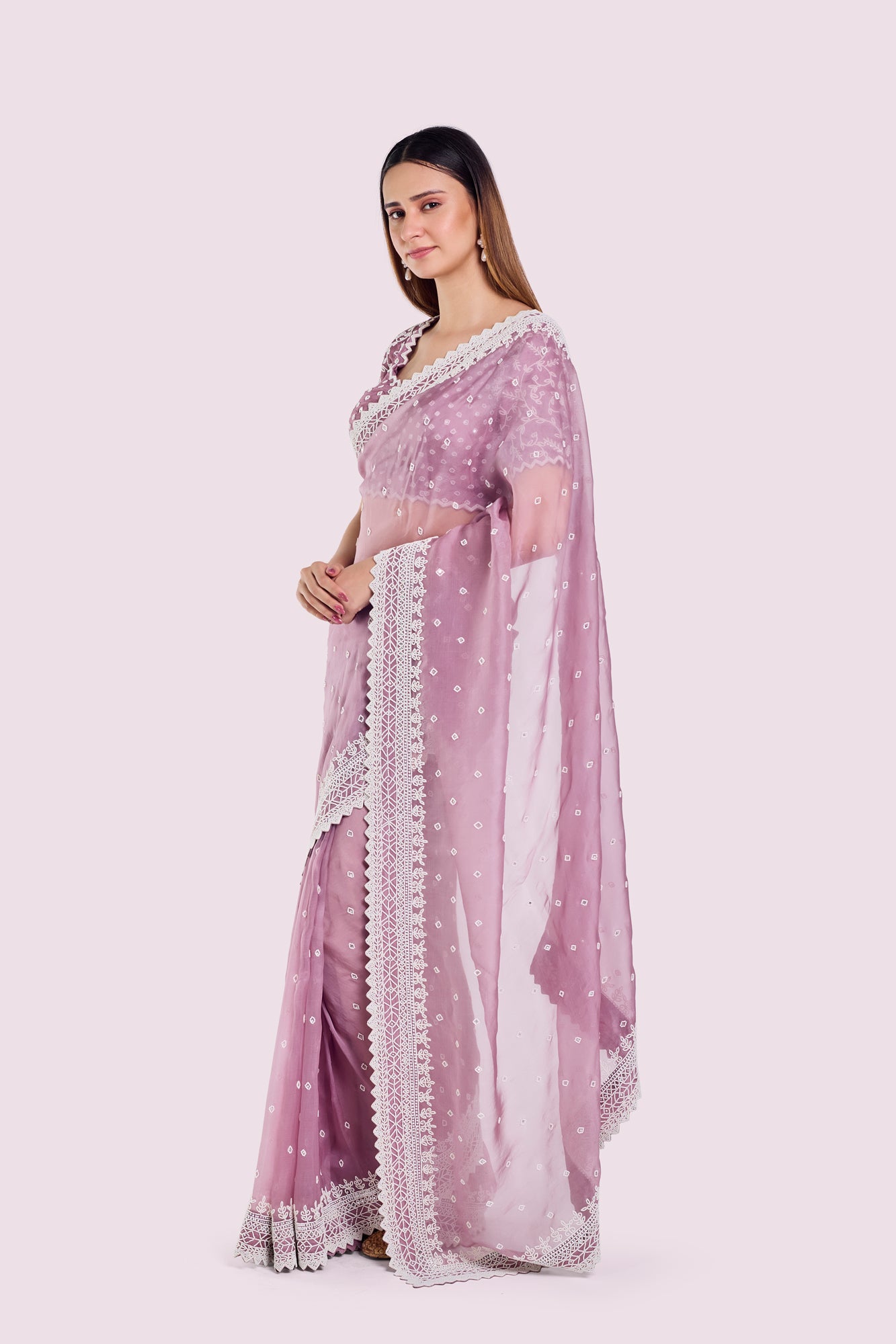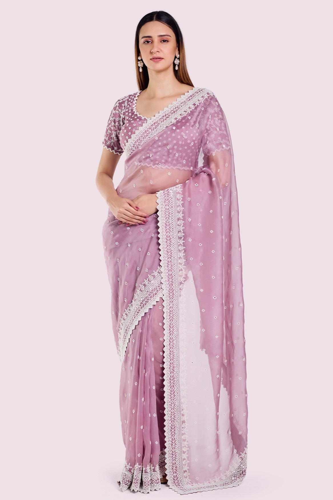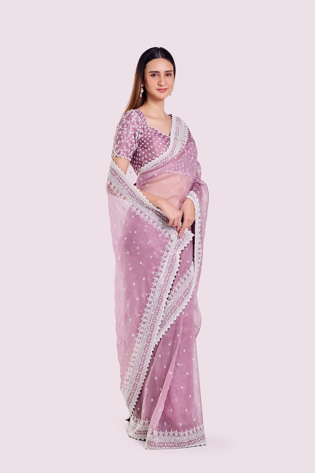 Beautiful lilac embroidered organza saree is a perfect choice for a wedding guest look! It comes with an embroidered designer blouse. Shop designer saris online in the USA from Pure Elegance.