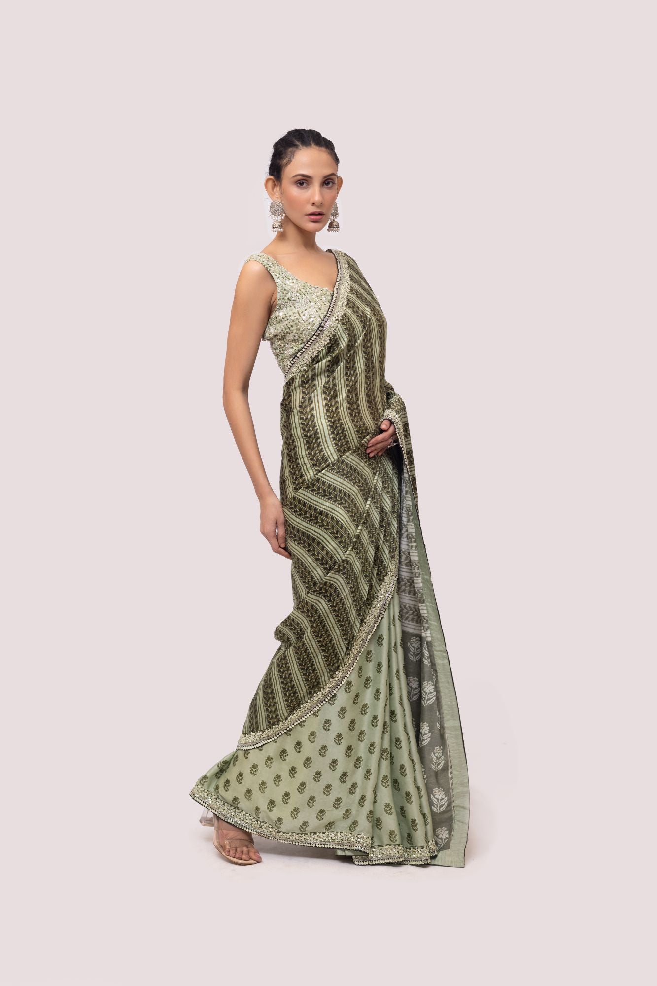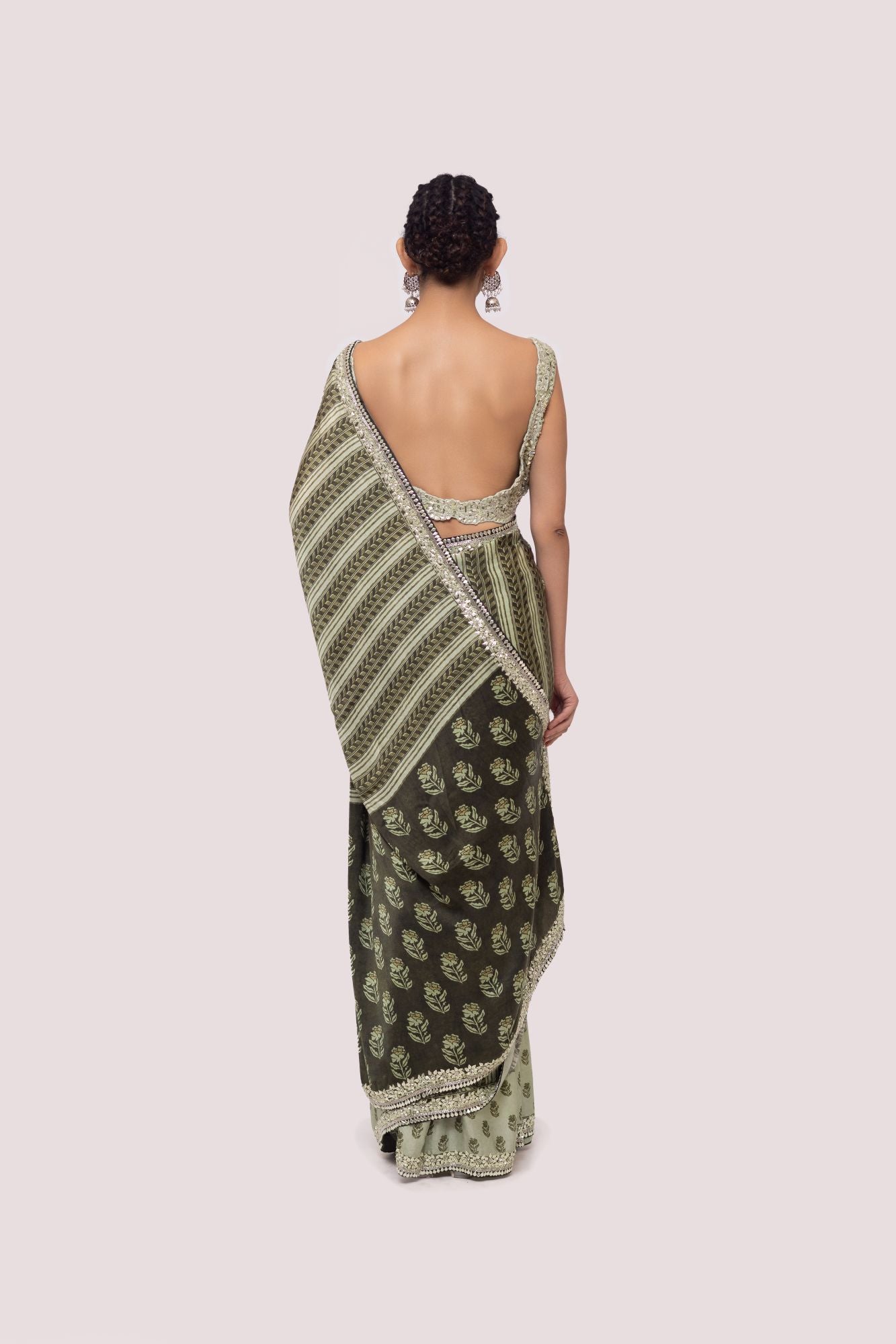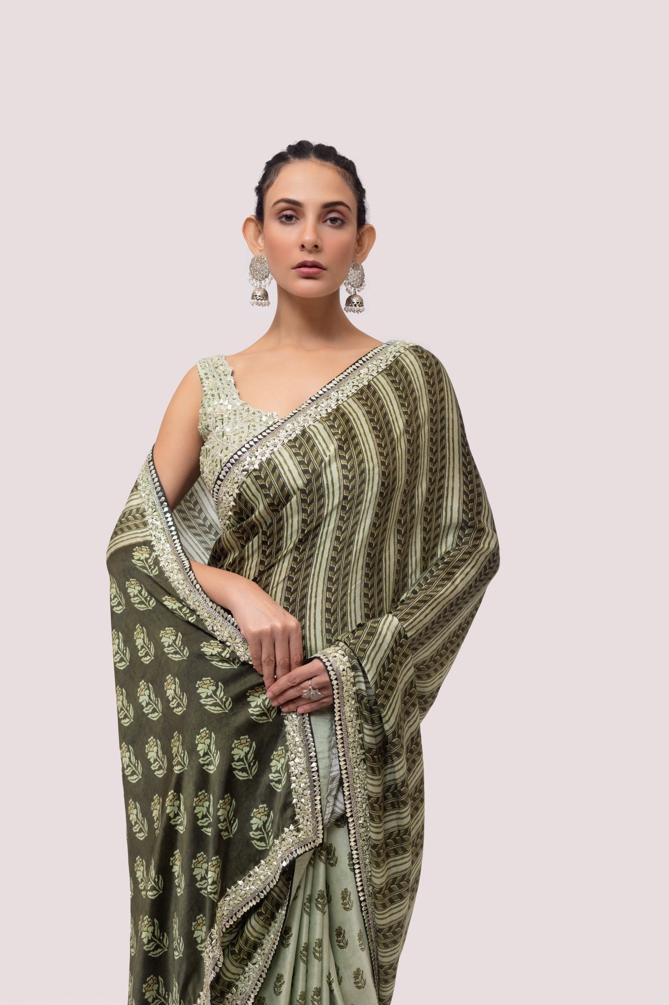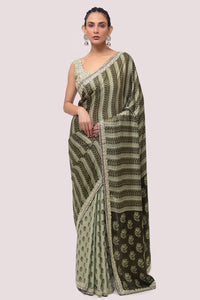 Beautiful olive green printed embroidered organza saree with sequin cutdana embroidery. It comes with a beautiful saree blouse. Shop designer saris online in USA from Pure Elegance.
