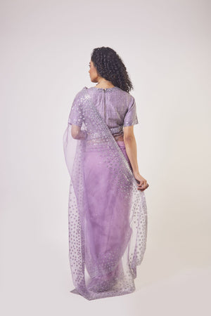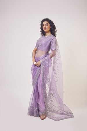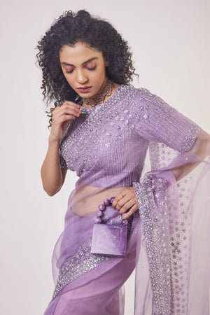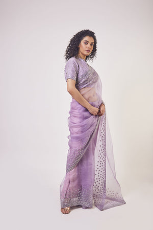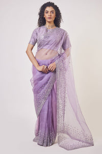 Beautiful lavender embroidered organza saree with stone, cut dana, pearl and tikki work. It comes with designer saree blouse and saree belt. Shop designer saris online in USA from Pure Elegance.