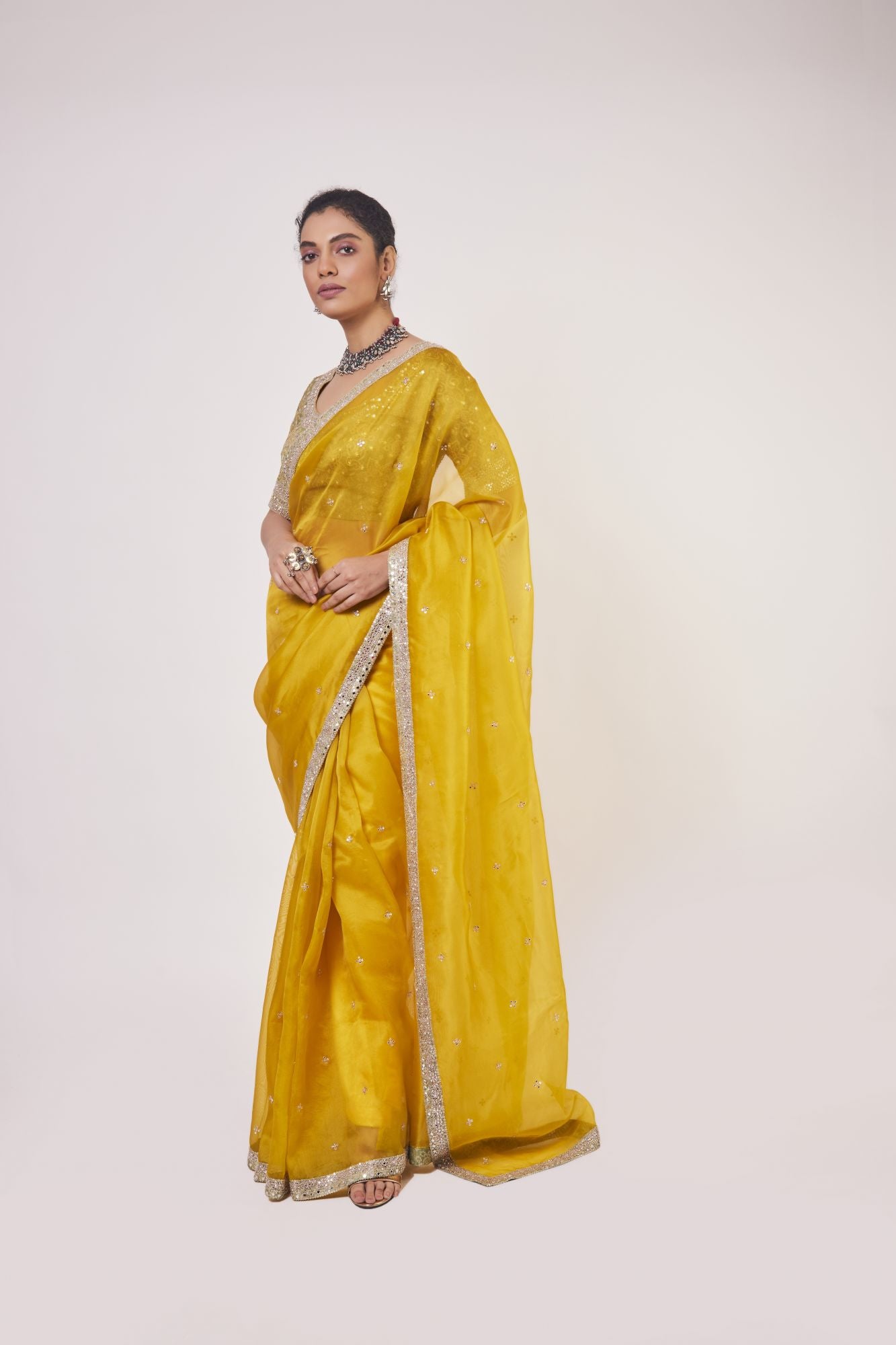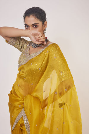 Beautiful mustard aari work organza saree. It comes with embroidered saree blouse. Shop designer saris online in USA from Pure Elegance.