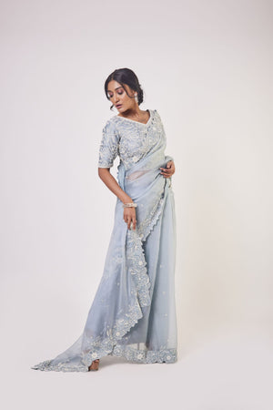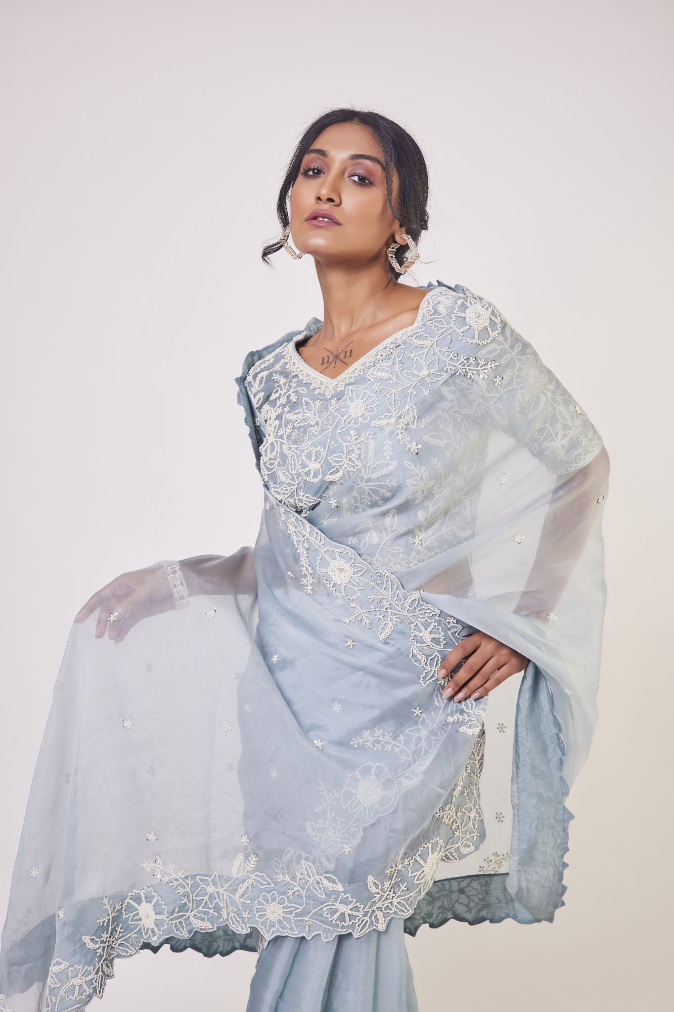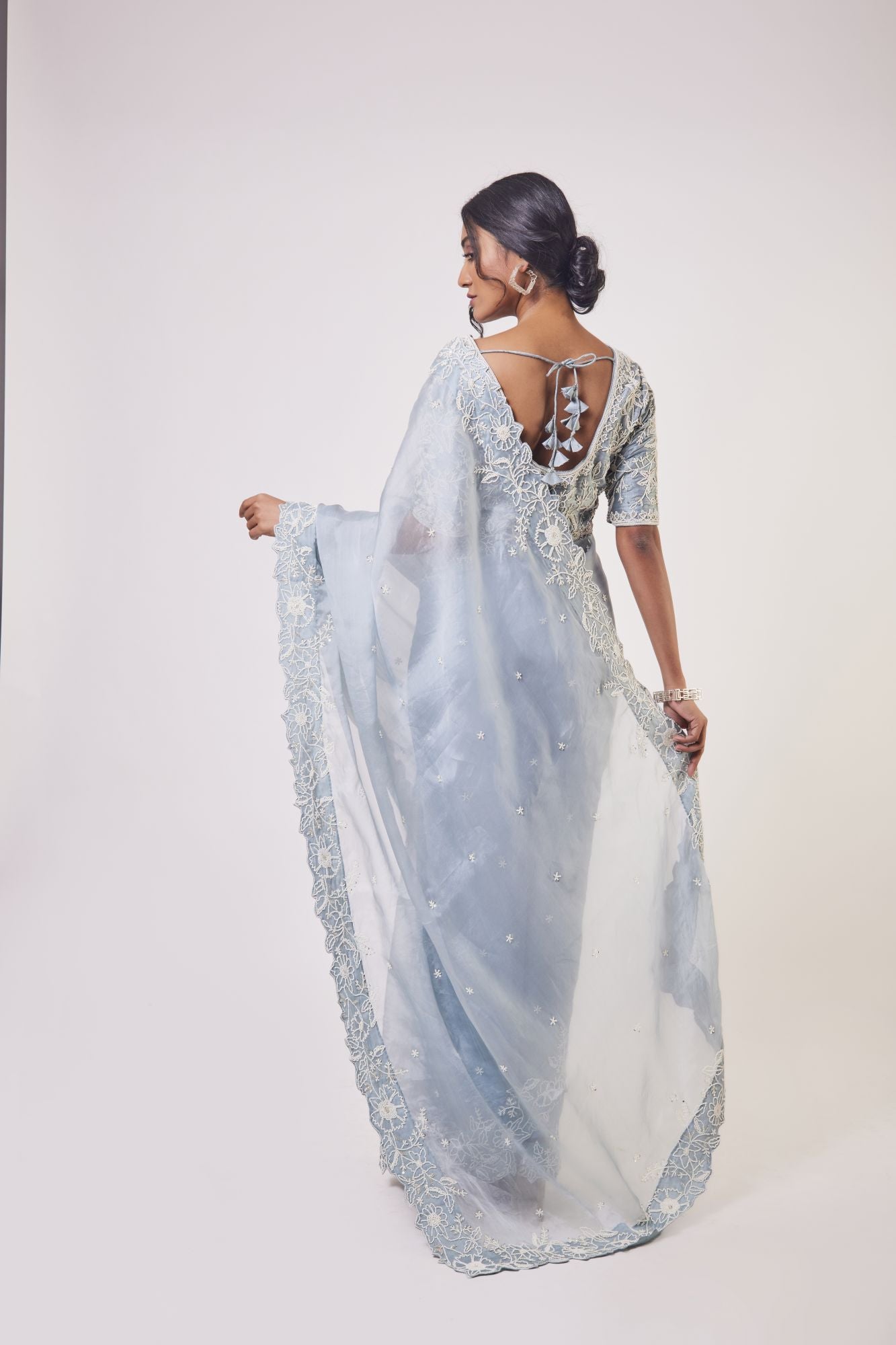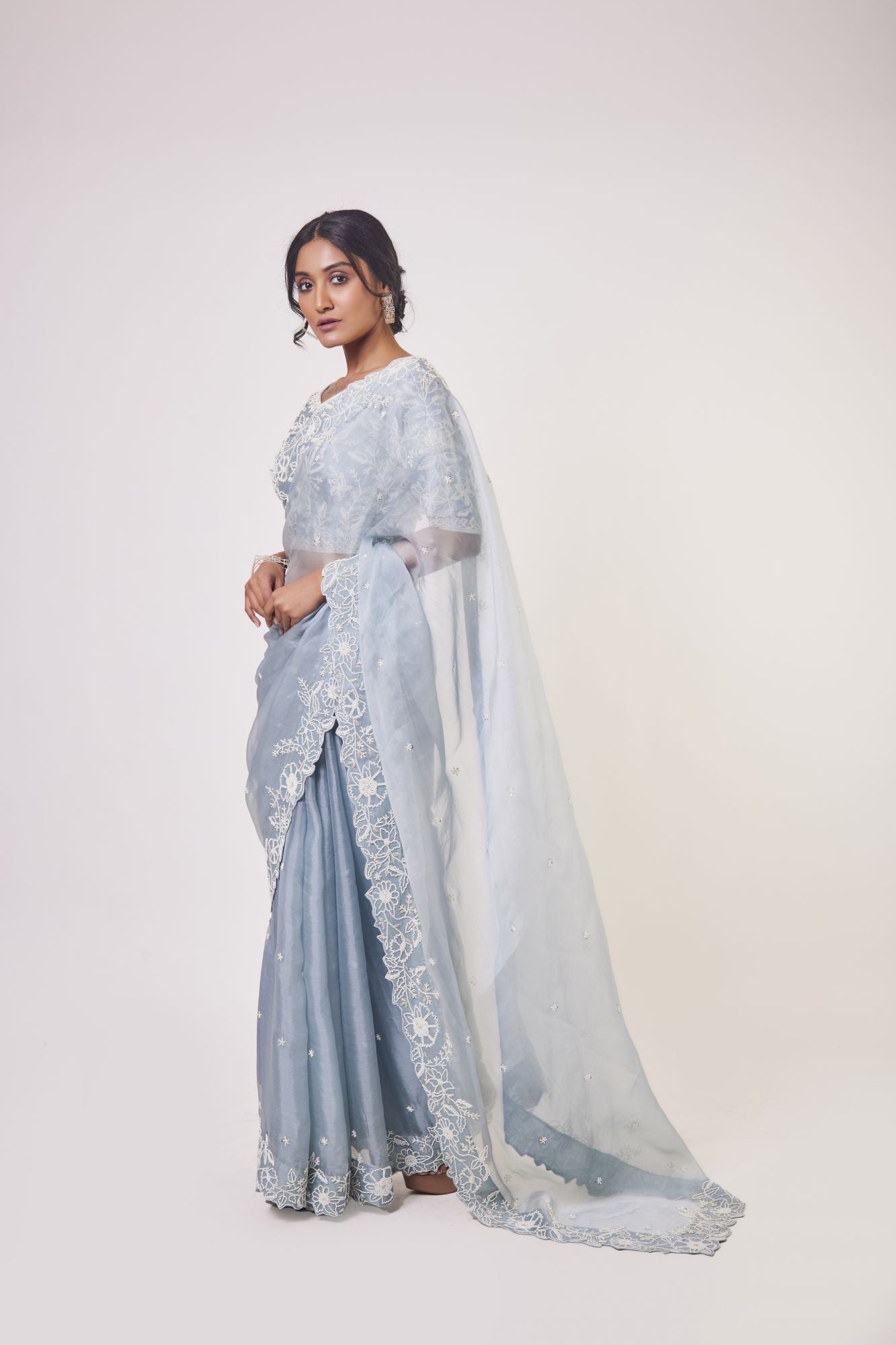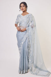 Beautiful doctor blue embroidered organza saree with cutdana, tikki and pearl work. It comes with embroidered saree blouse. Shop designer saris online in USA from Pure Elegance.