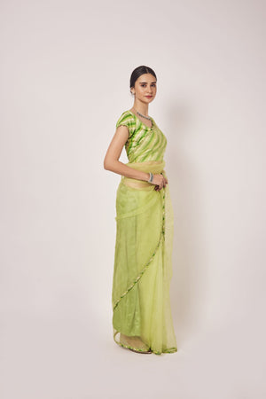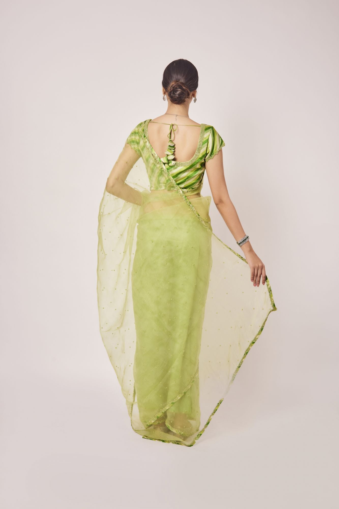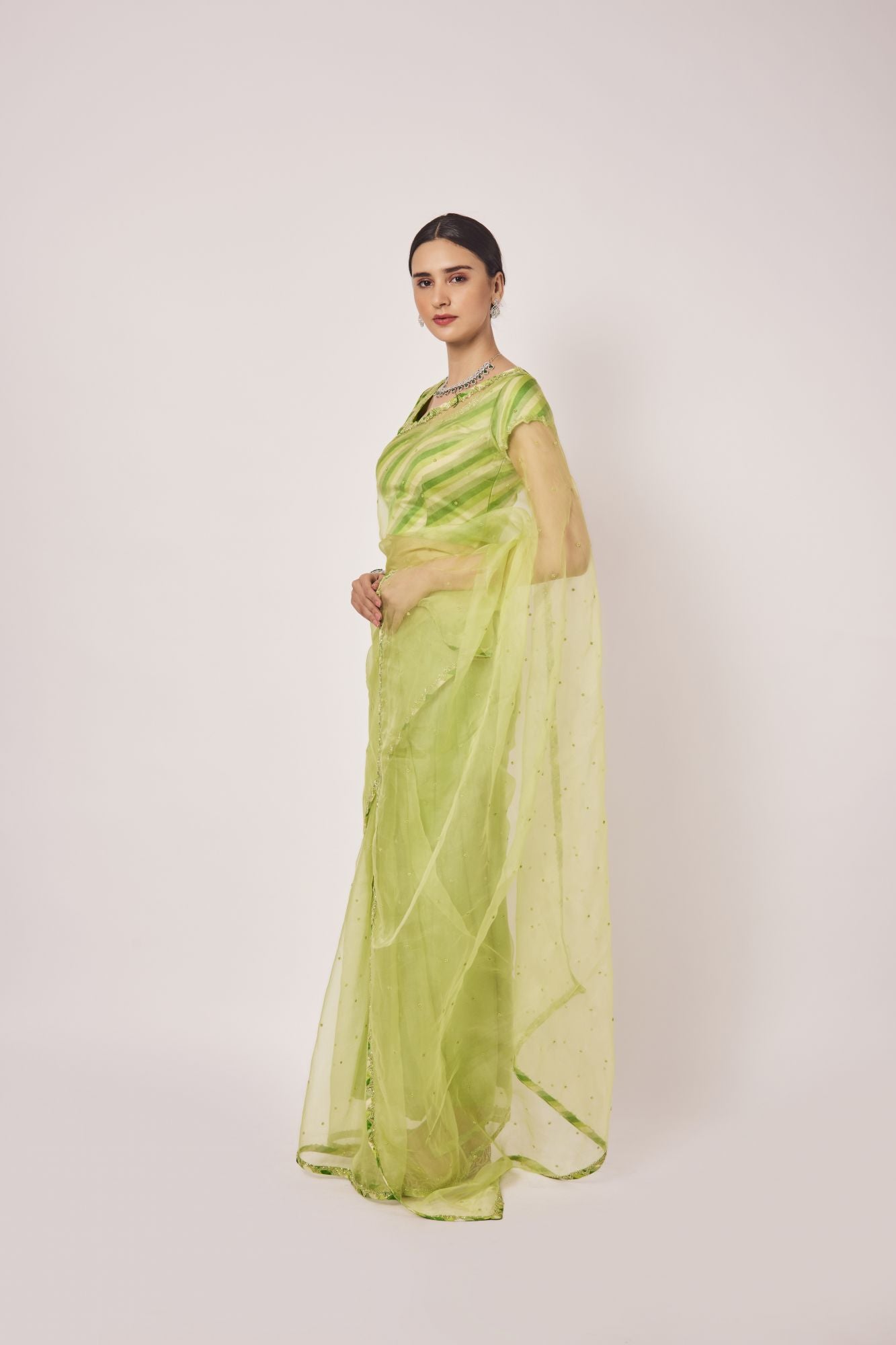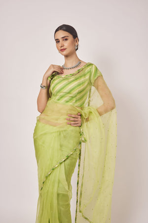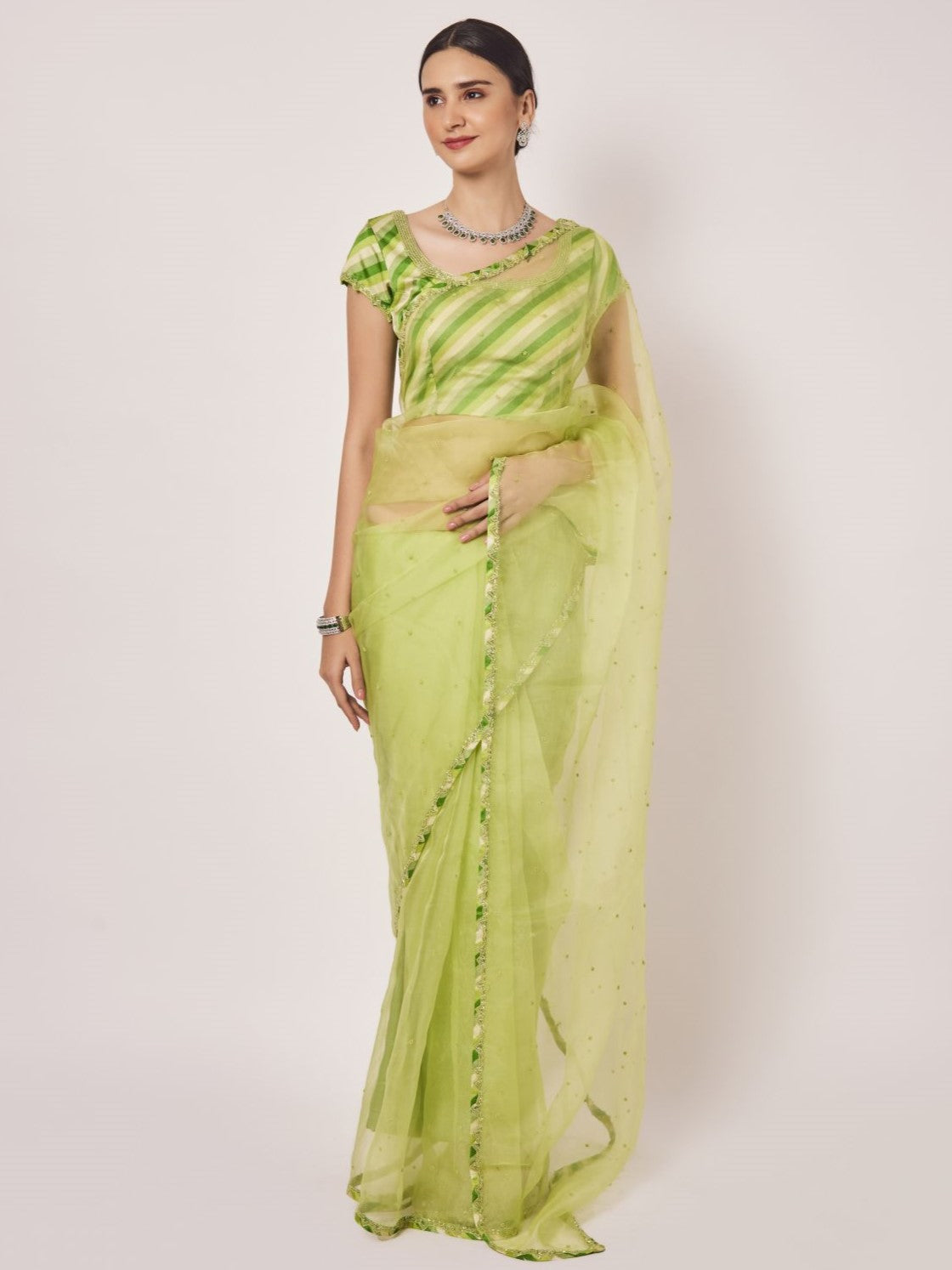 Beautiful pista green cut dana and pearl work organza saree. It comes with a striped saree blouse. Shop designer saris online in USA from Pure Elegance.